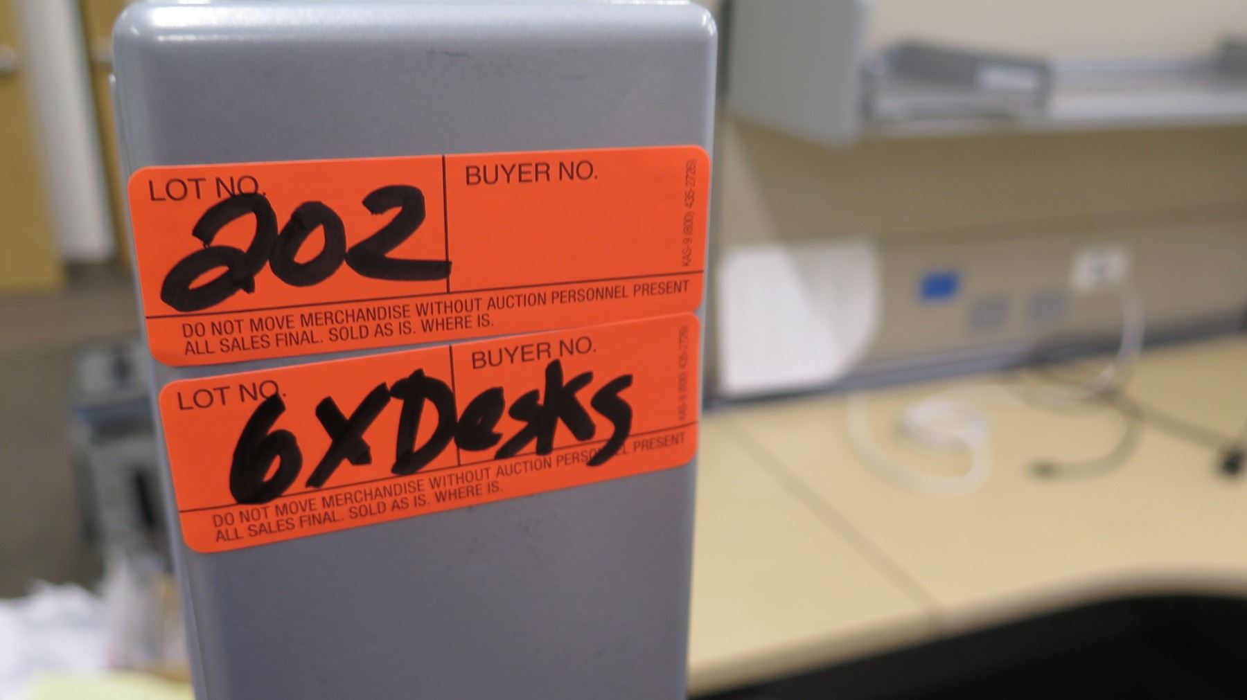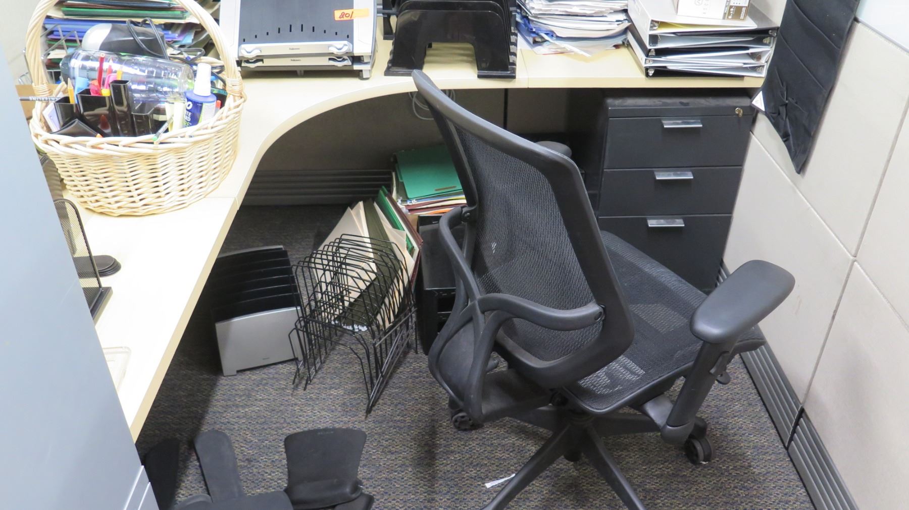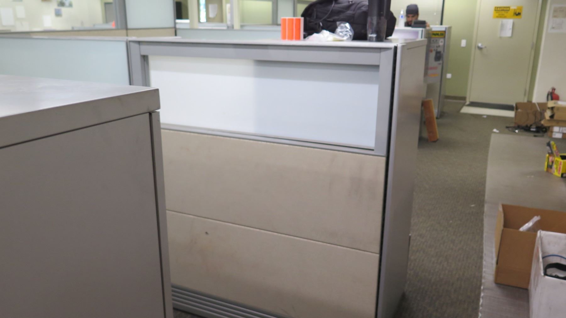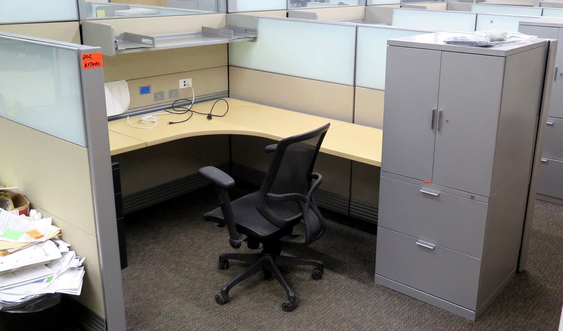 Qty 6 Desks w/ Rolling Chairs, Filing Cabinets & Cubicle Walls (Buyer Needs to Disassemble)
