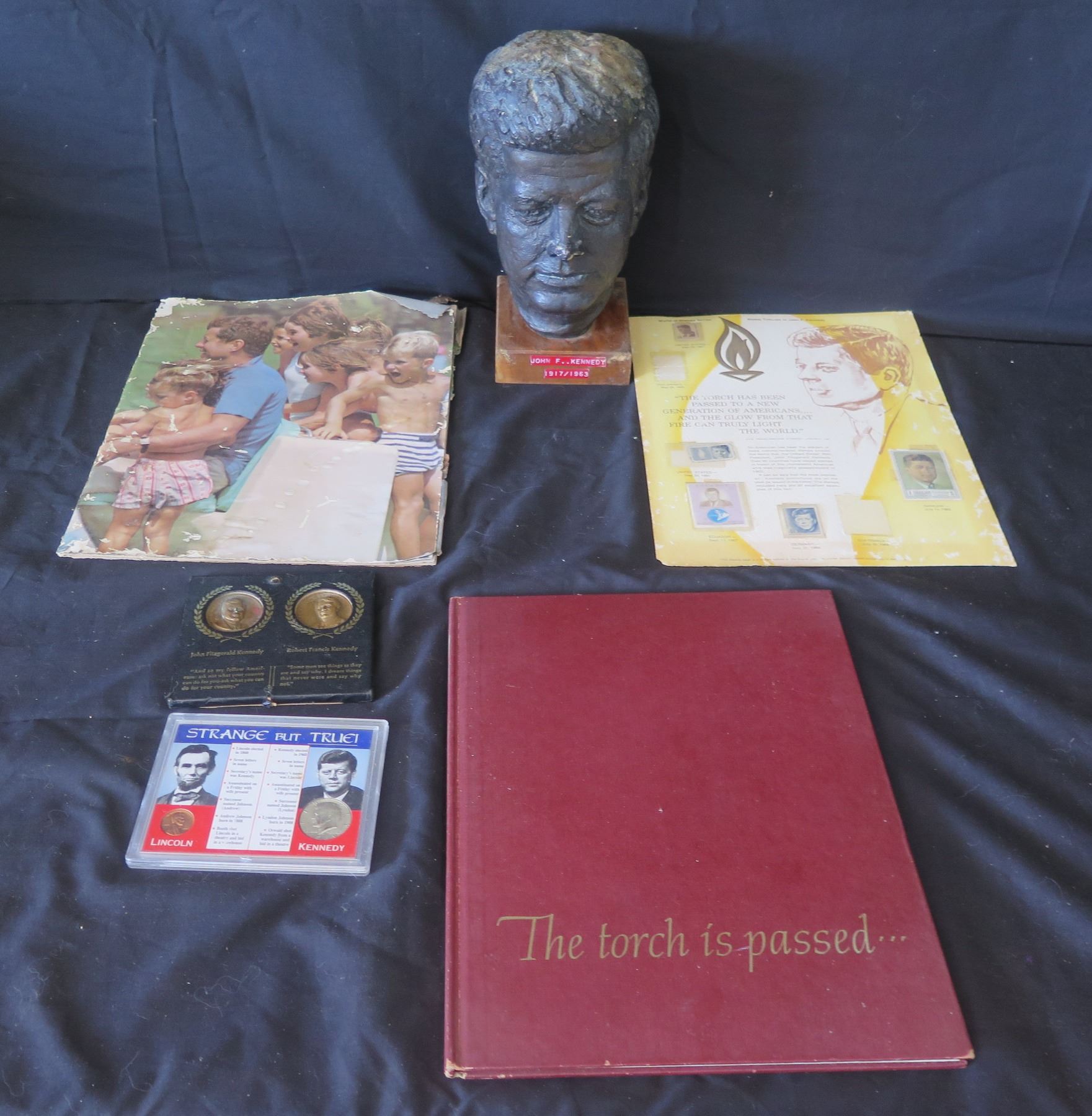 Qty 6 Kennedy Memorabilia: Bust, Picture Book, 'Torch has been Passed" Poster, etc