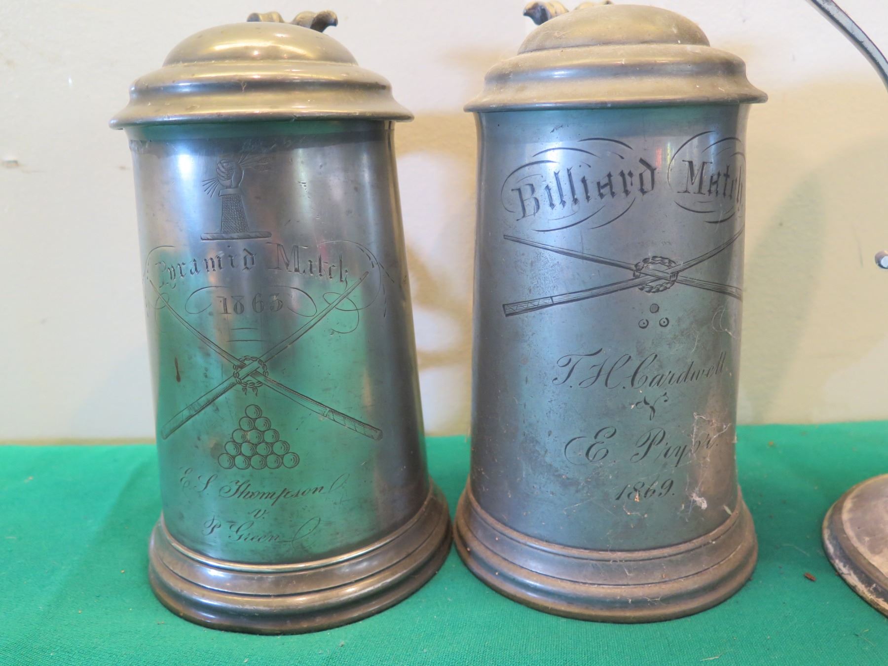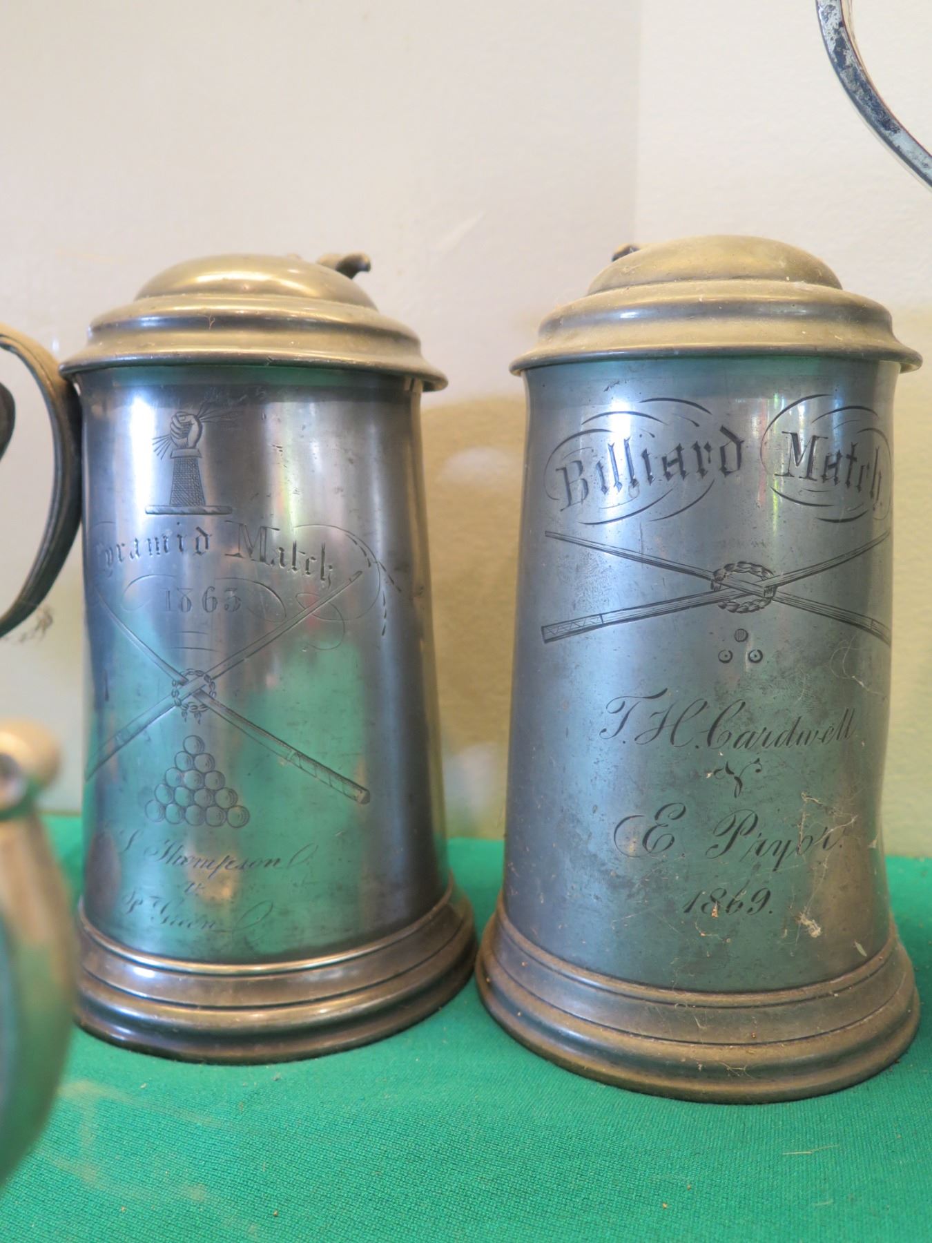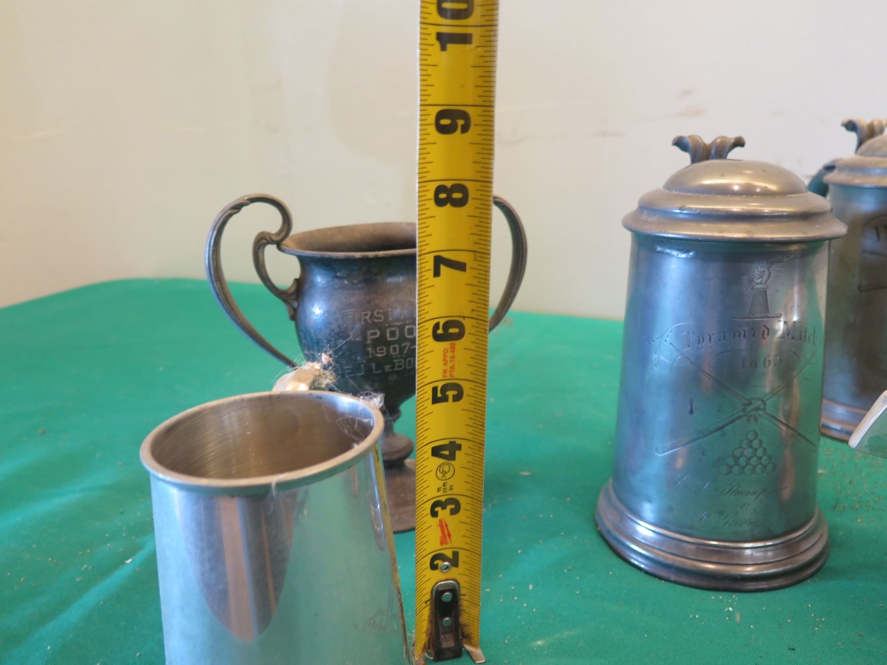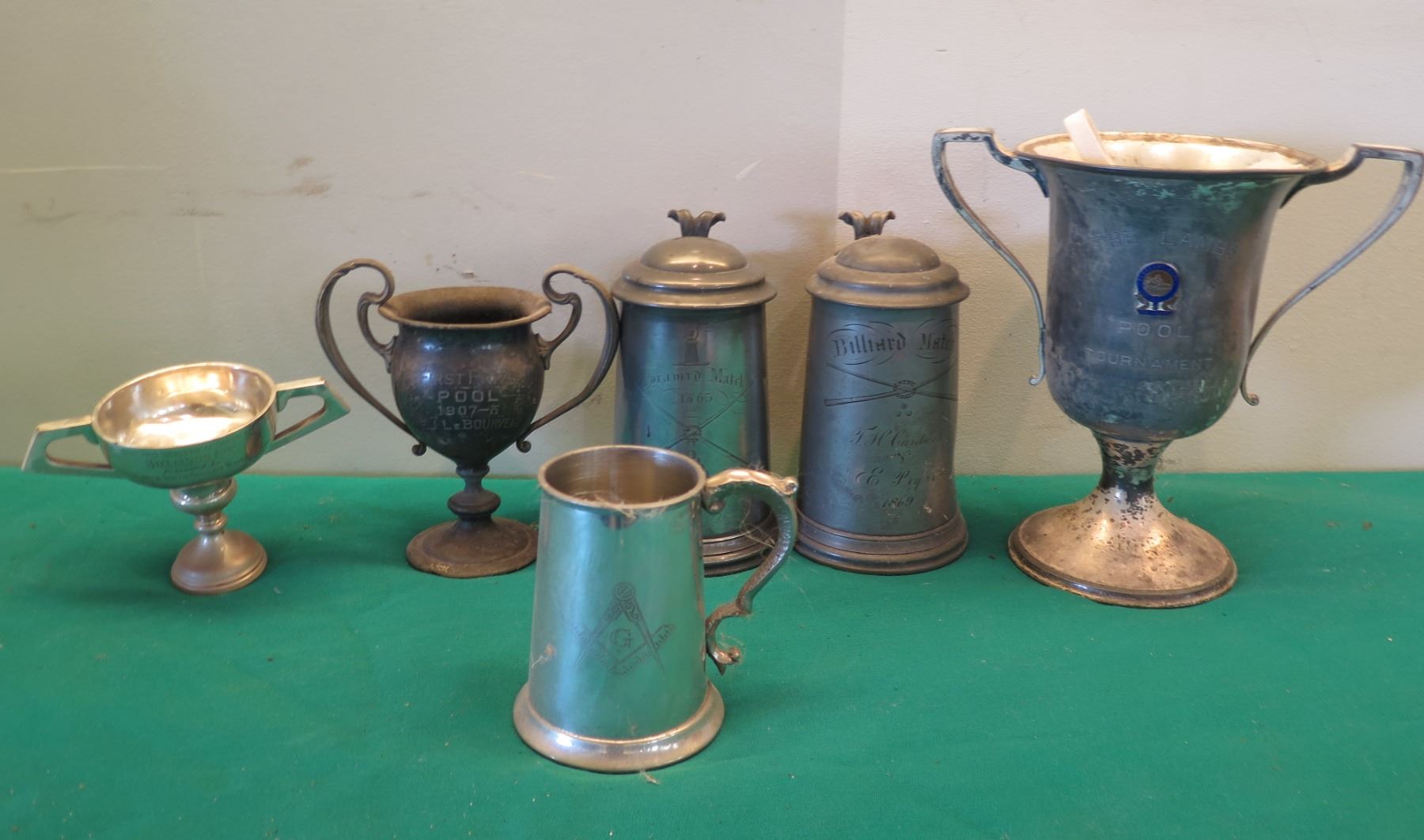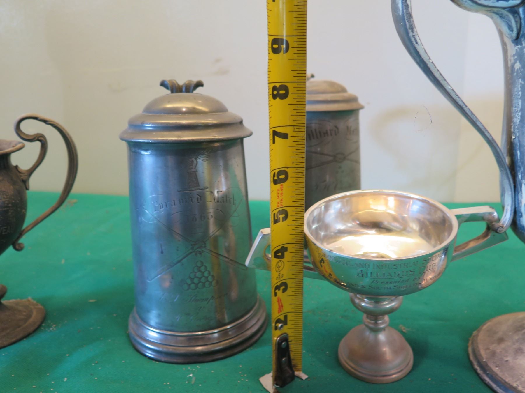 Qty 6 Metal Billiards Pool Themed Vessels: Cup Trophies, Steins, Pewter Mug