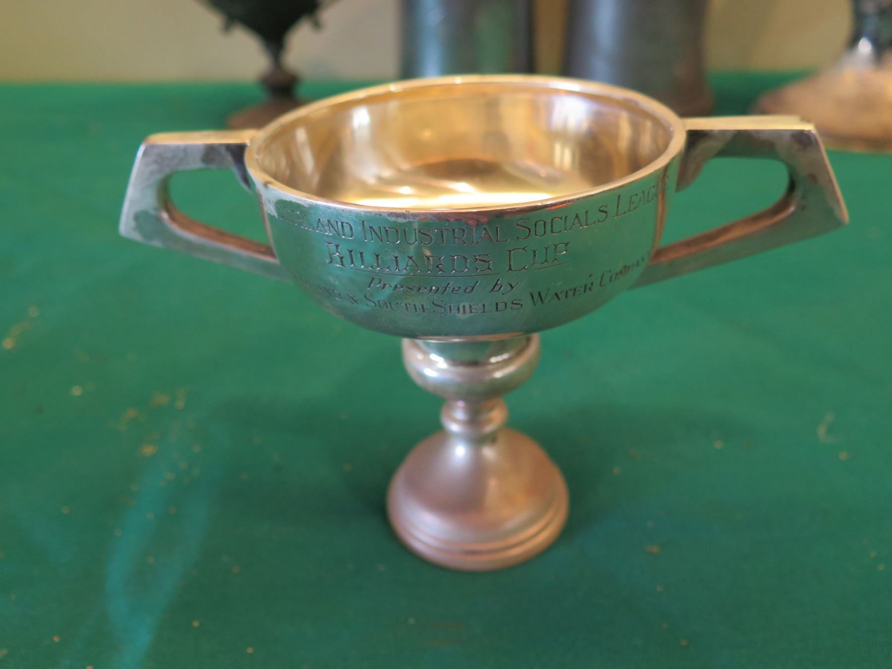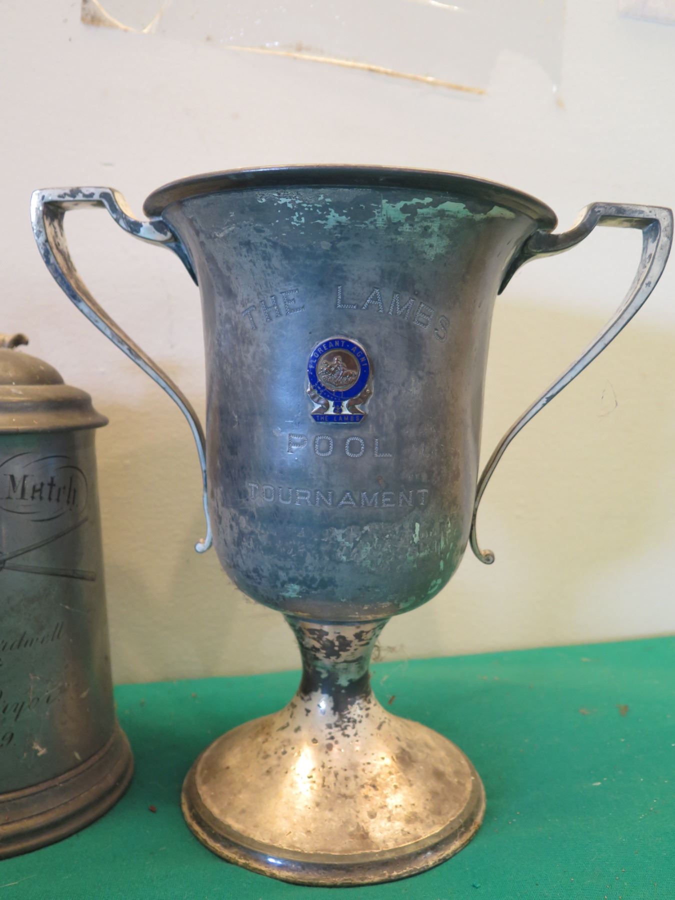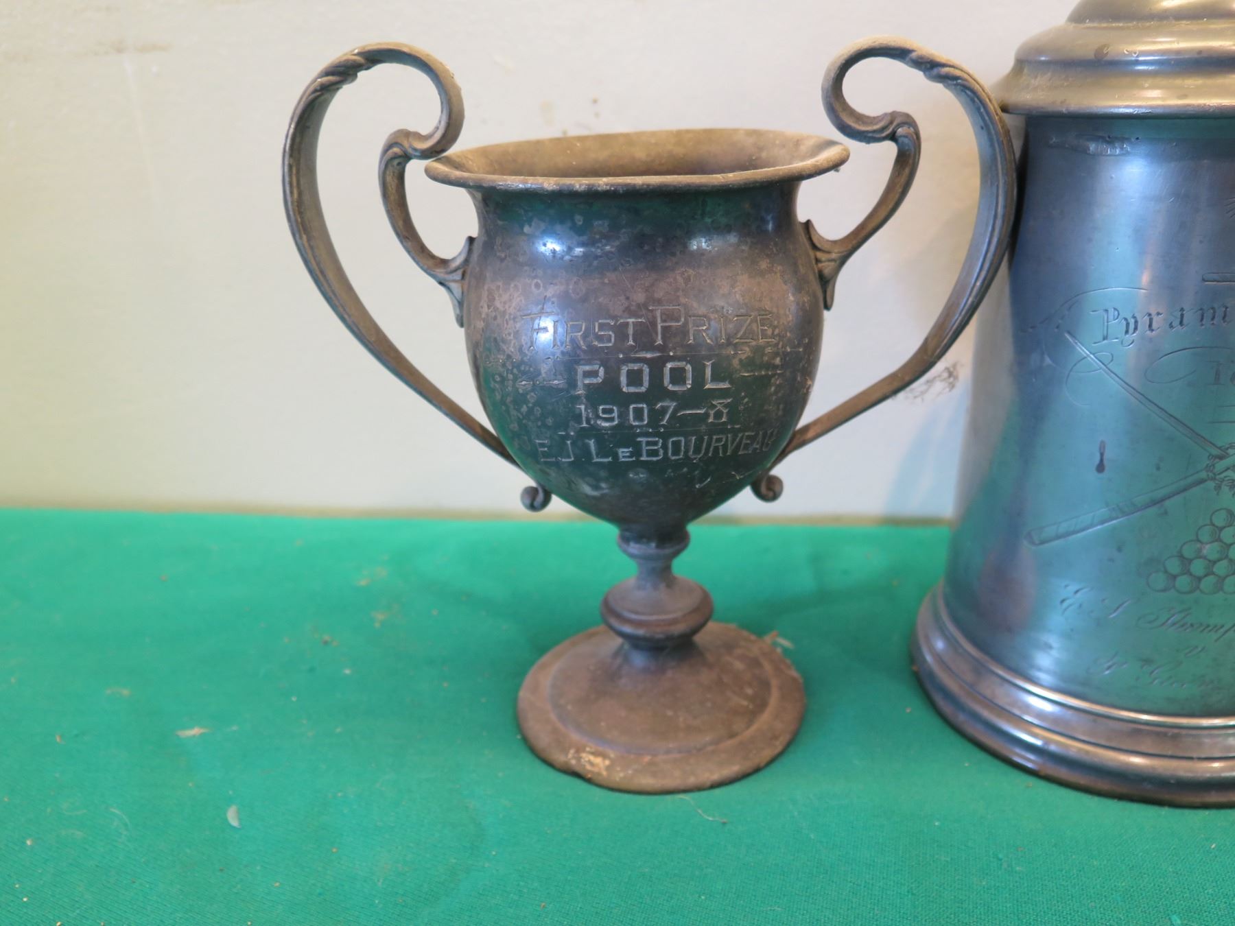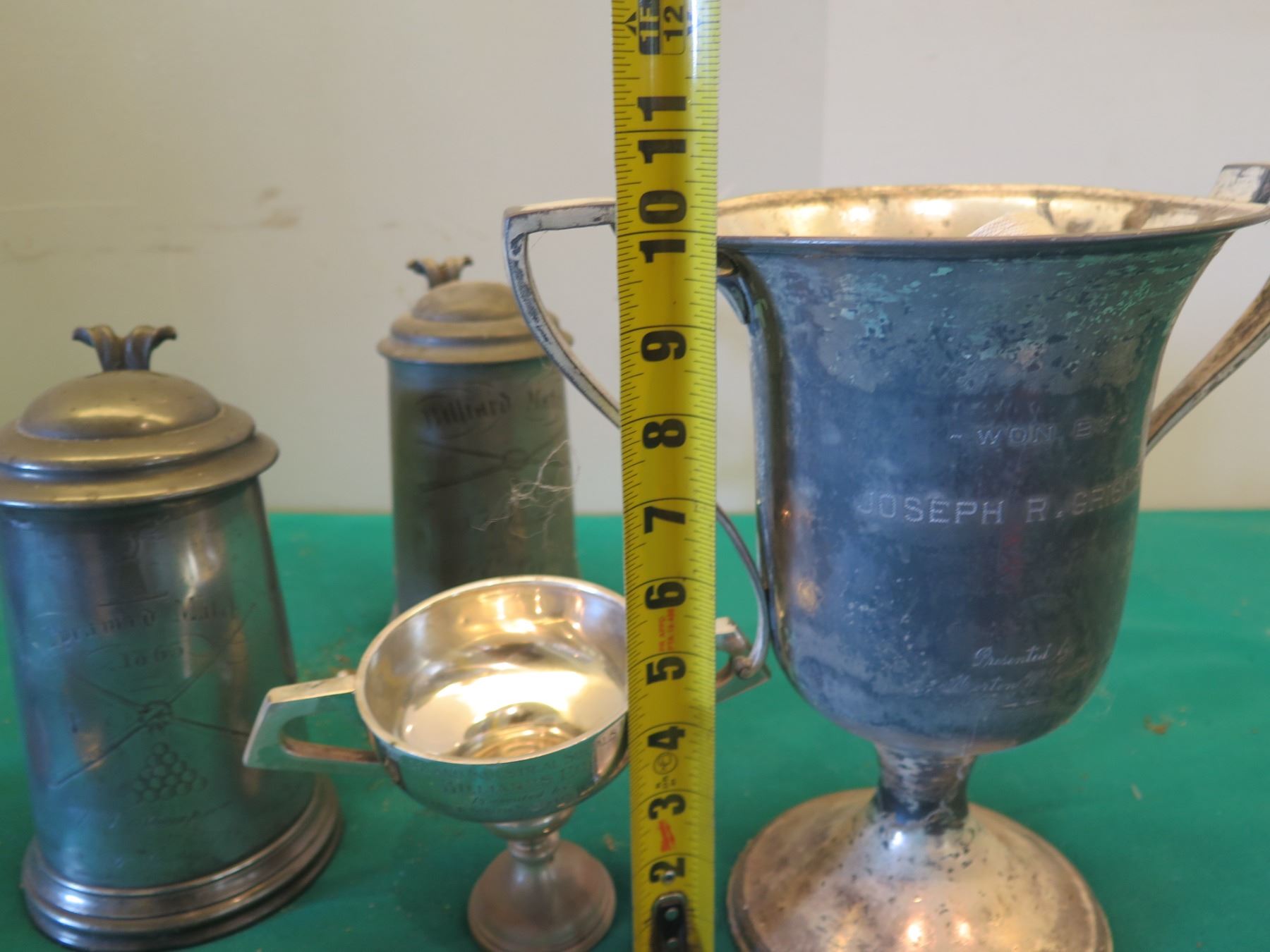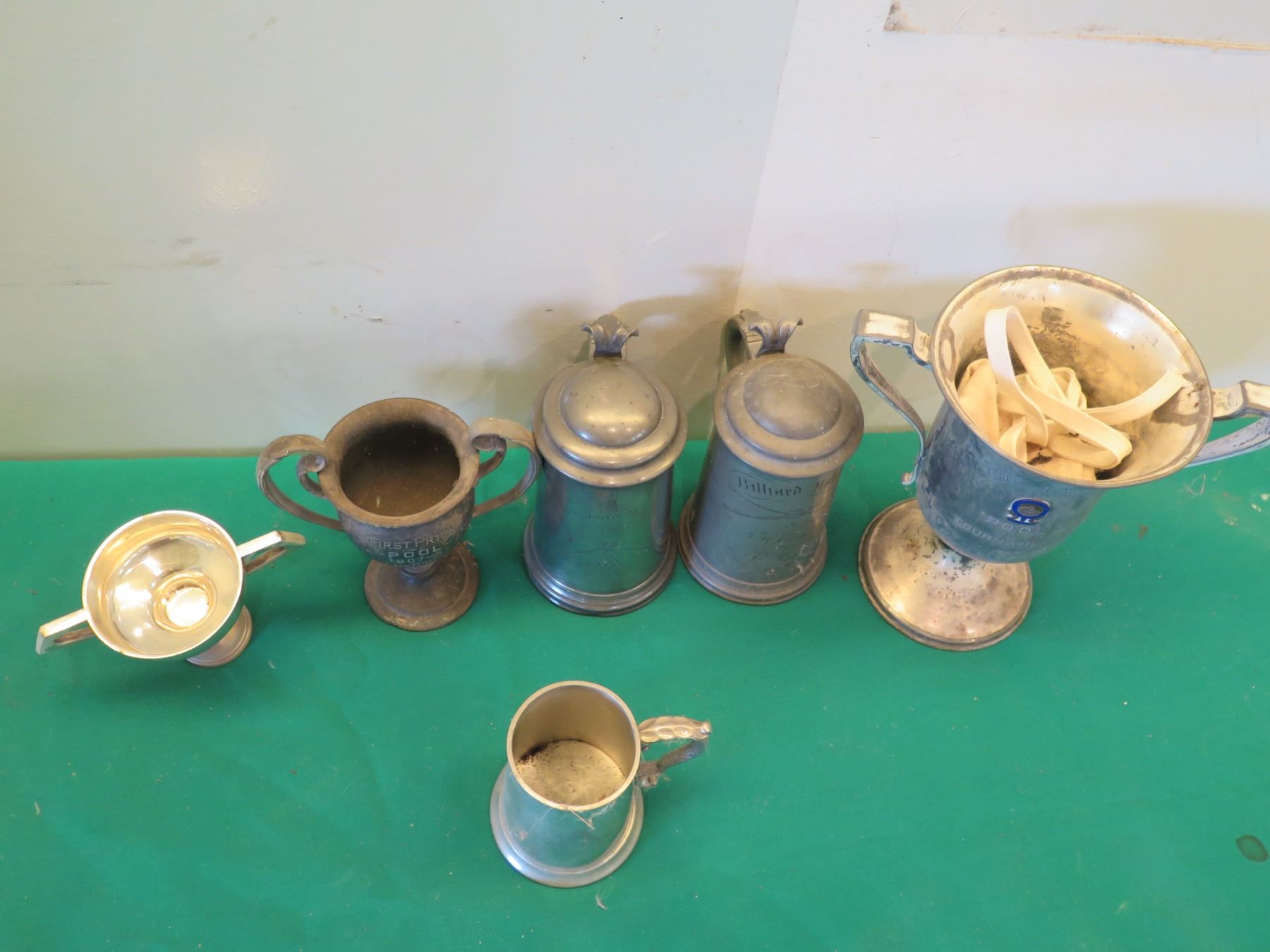 Qty 6 Metal Billiards Pool Themed Vessels: Cup Trophies, Steins, Pewter Mug