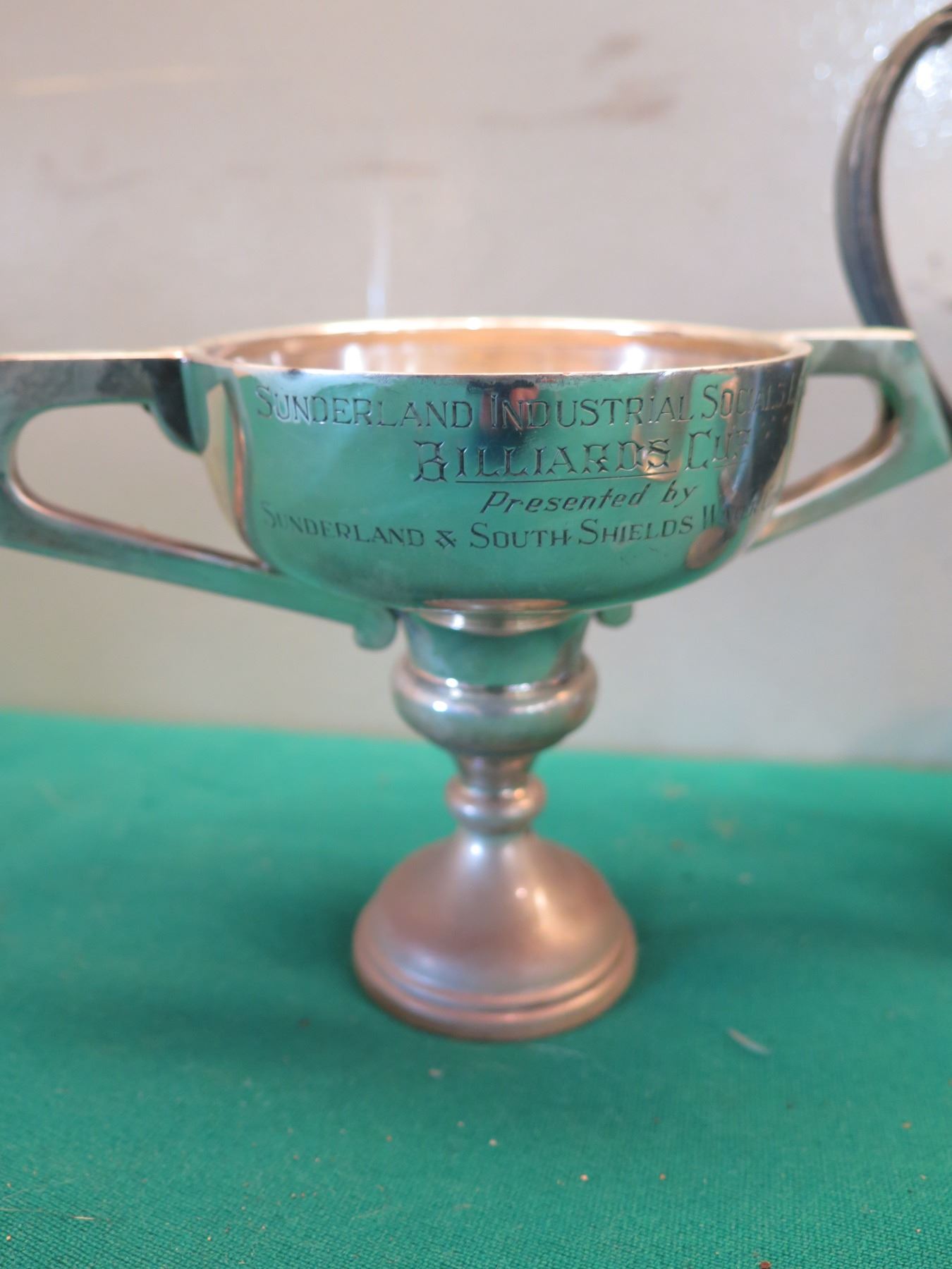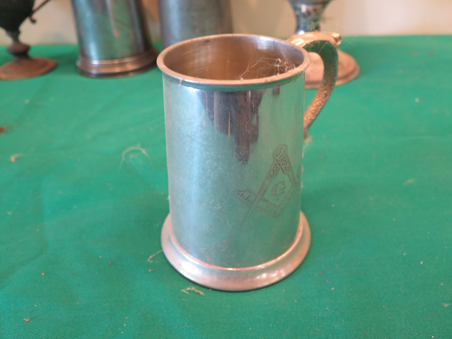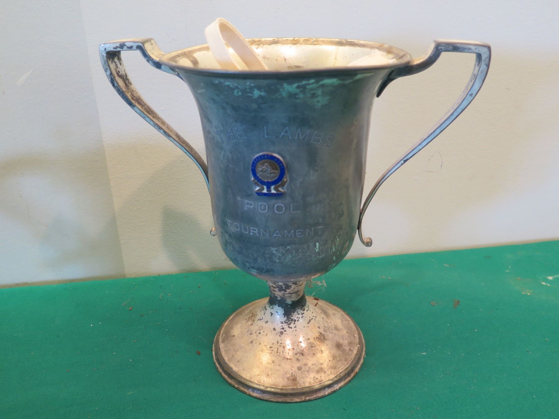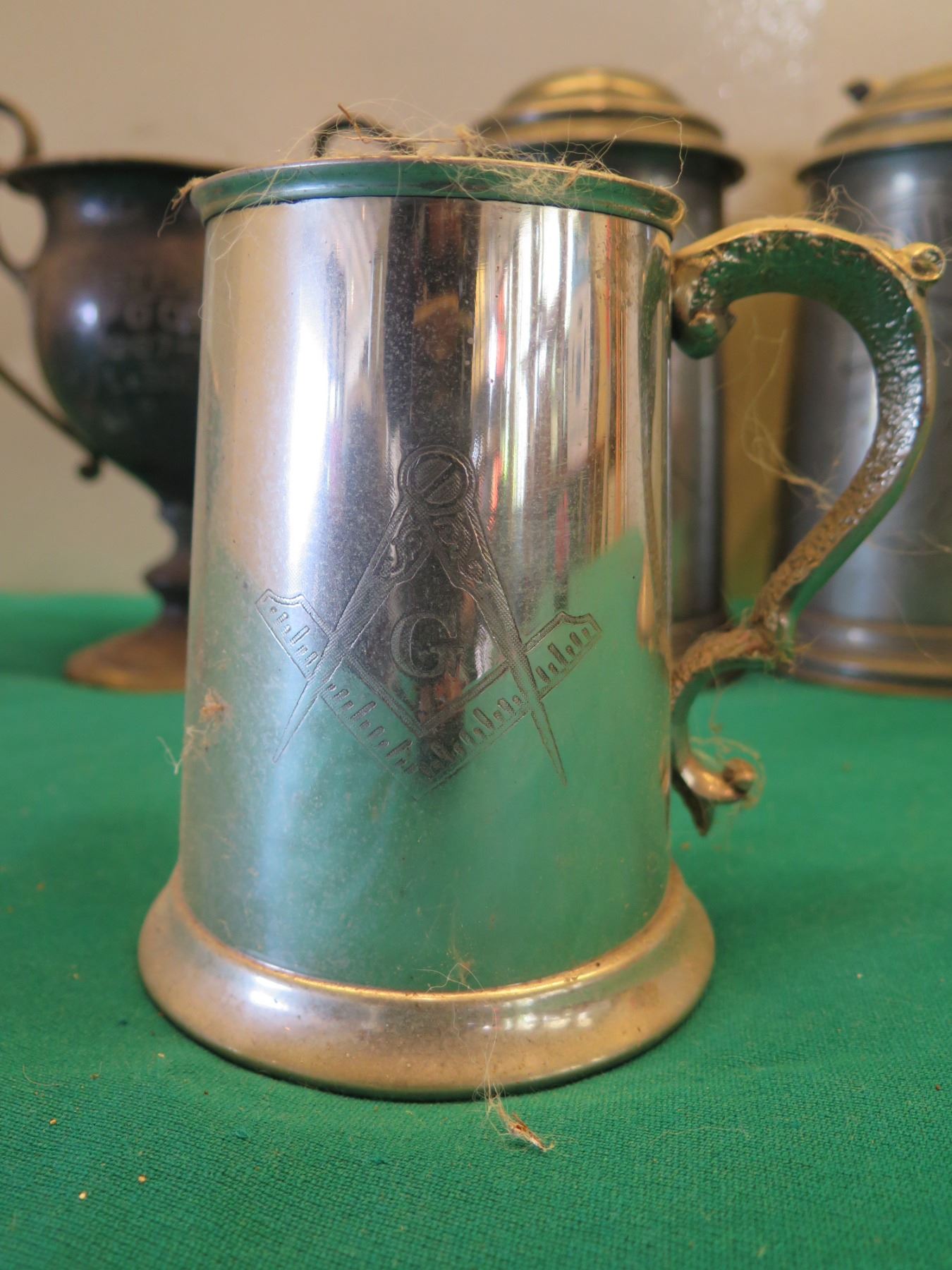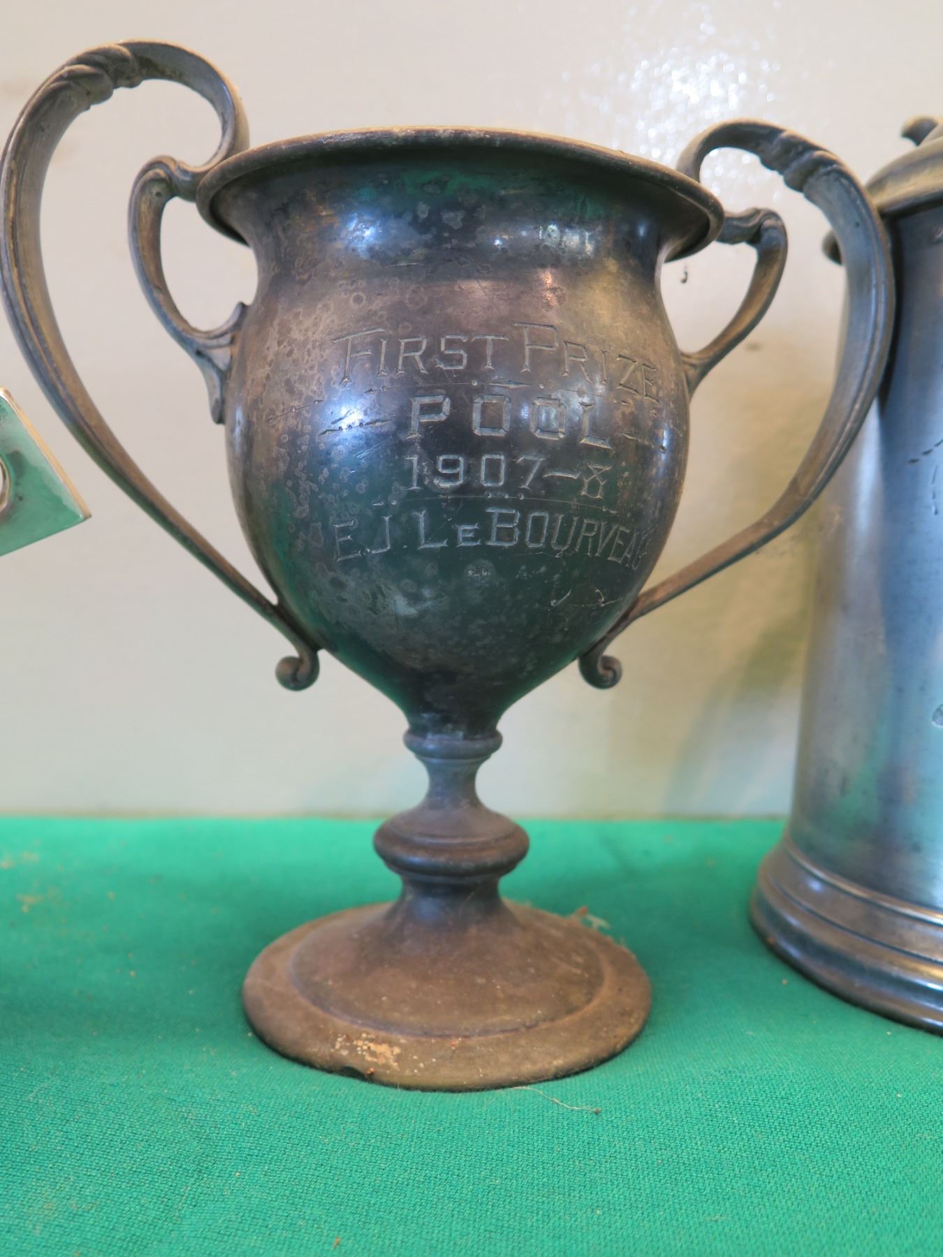 Qty 6 Metal Billiards Pool Themed Vessels: Cup Trophies, Steins, Pewter Mug