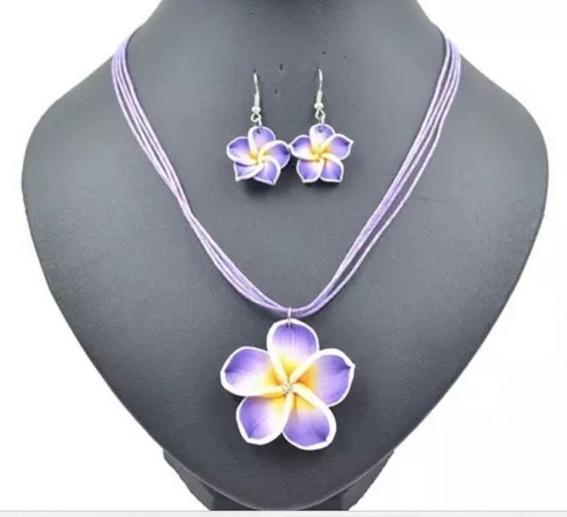Qty 6 New Fimo Polymer Clay Plumeria Flower Necklace & Earrings Sets: Red, White, Blue, Purple, Pink