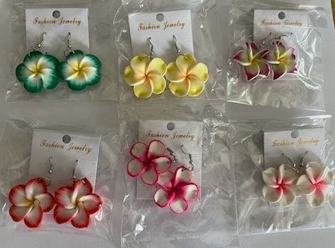 Qty 6 Plumeria Flower Fimo Polymer Clay Pierced Hook Dangle Earrings (approx. 1.25" dia), Misc Colors