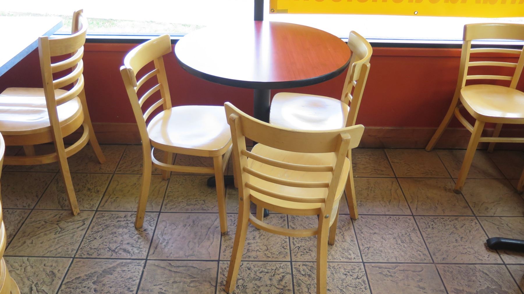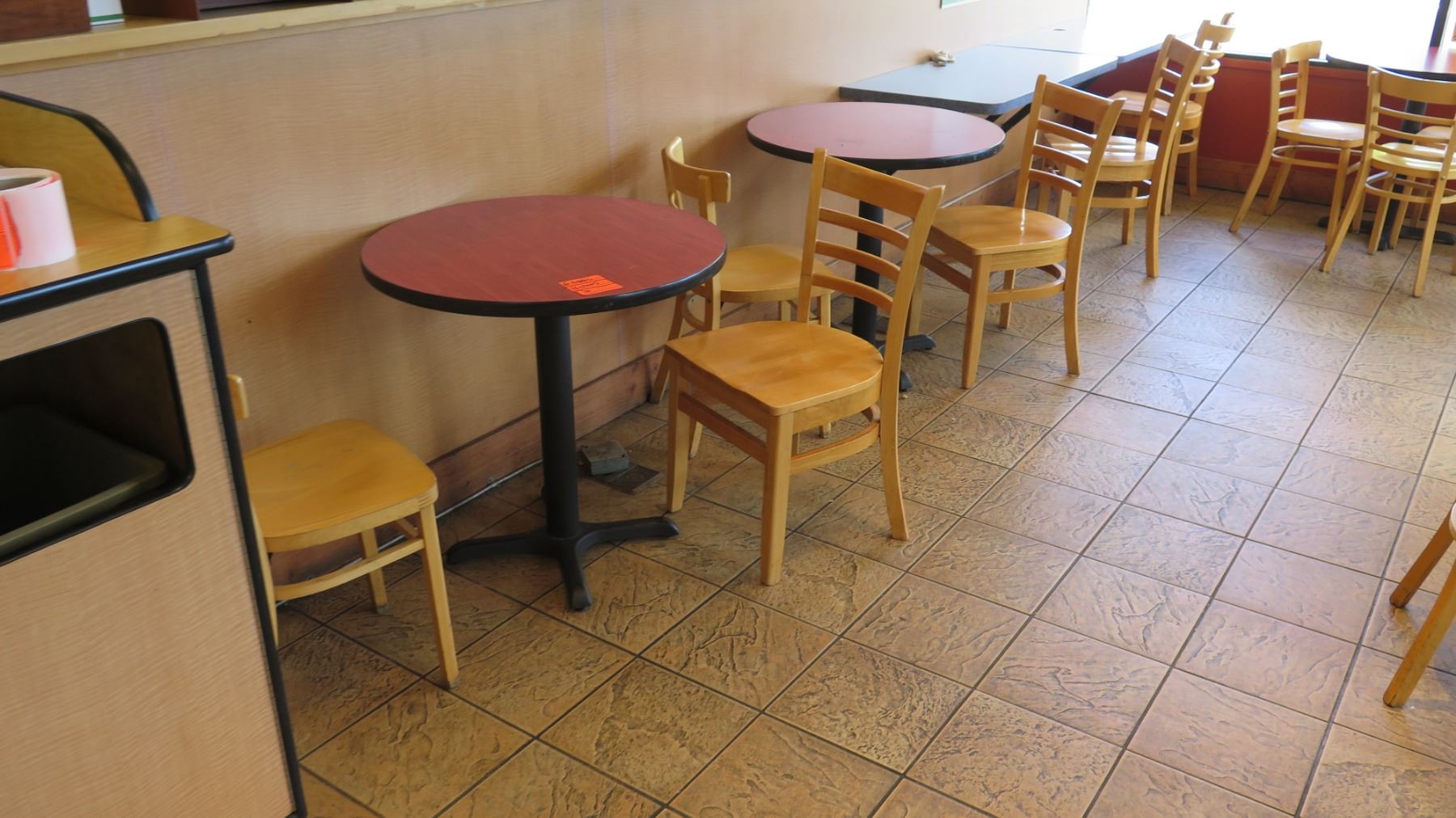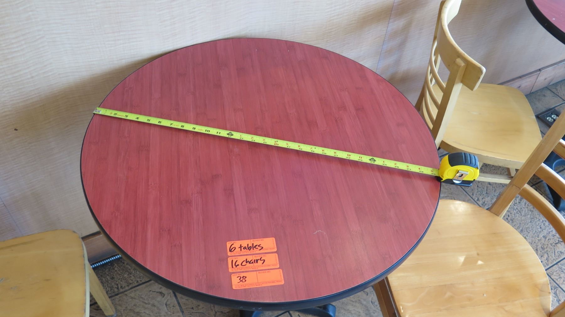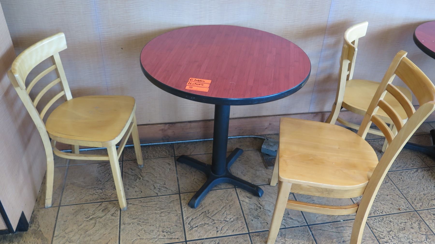 Qty 6 Round 30" Wooden Tables & 16 Wood Chairs. FOOD PRODUCTS AND MERCHANDISE IN THE PICTURES ARE NOT INCLUDED.