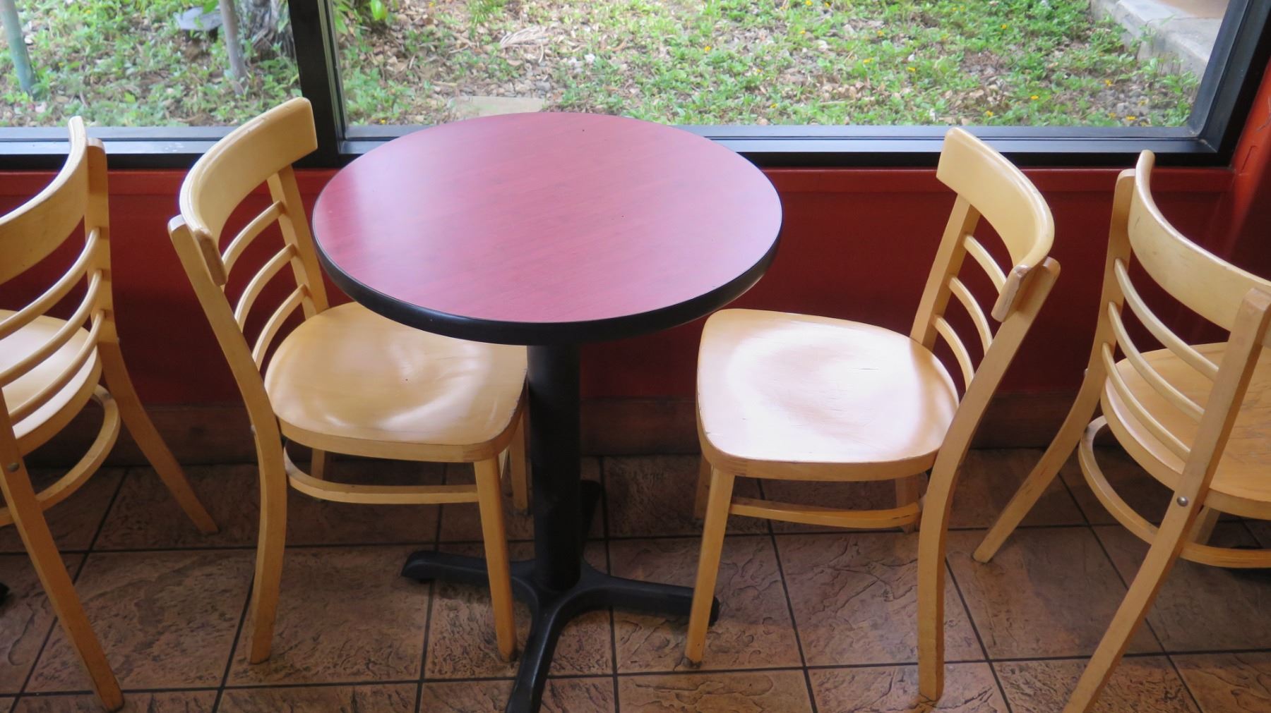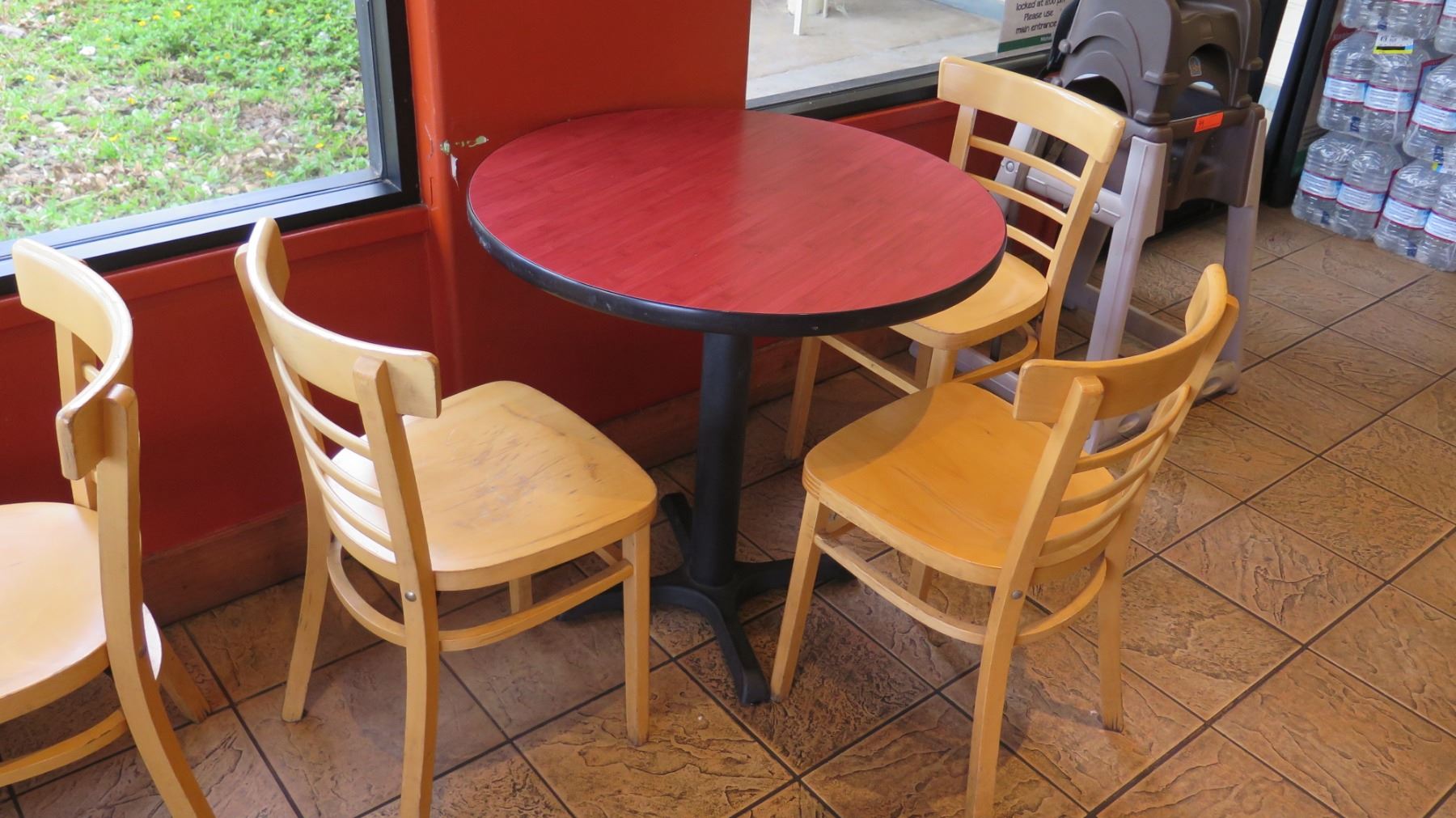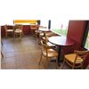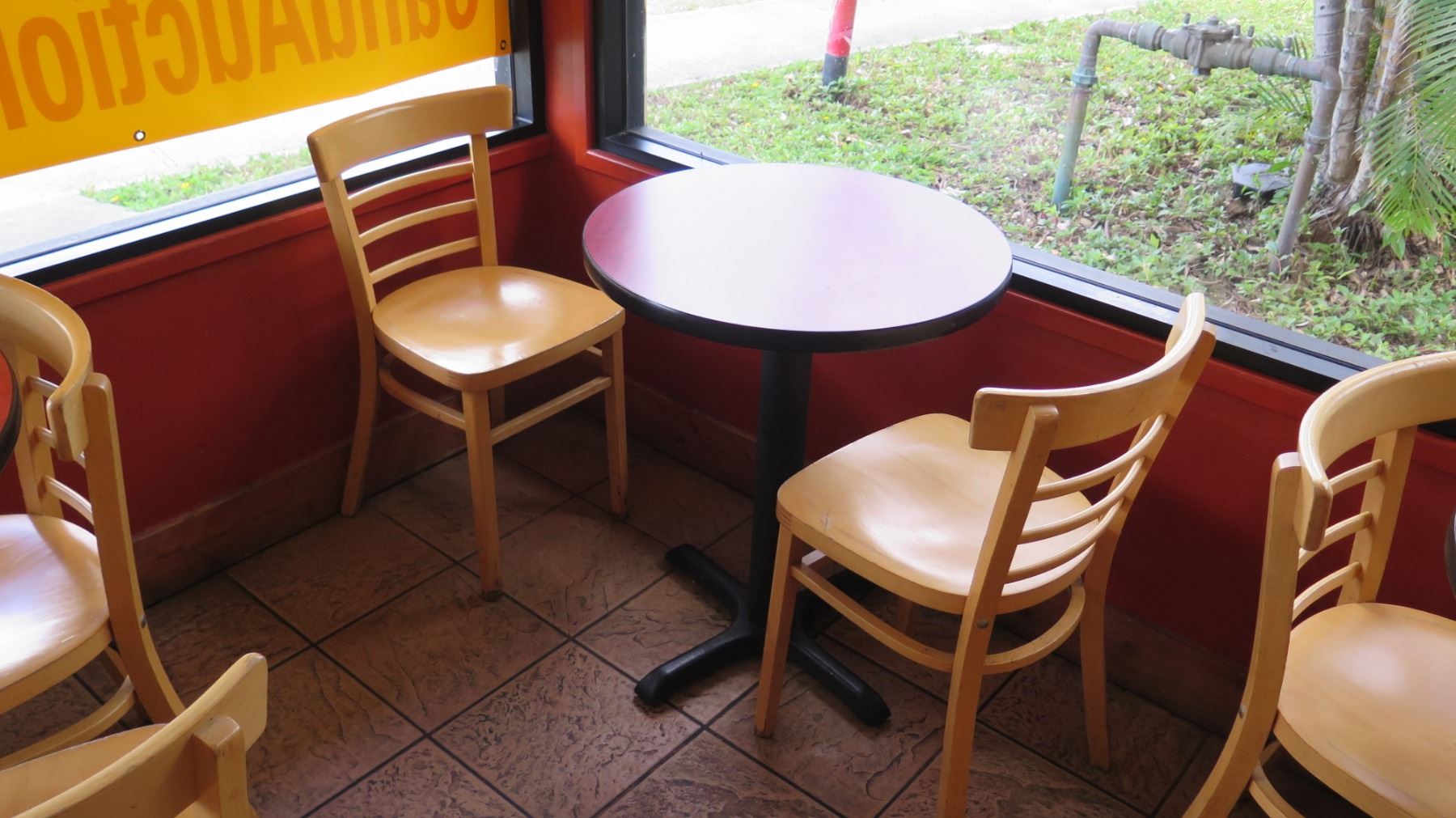 Qty 6 Round 30" Wooden Tables & 16 Wood Chairs. FOOD PRODUCTS AND MERCHANDISE IN THE PICTURES ARE NOT INCLUDED.