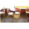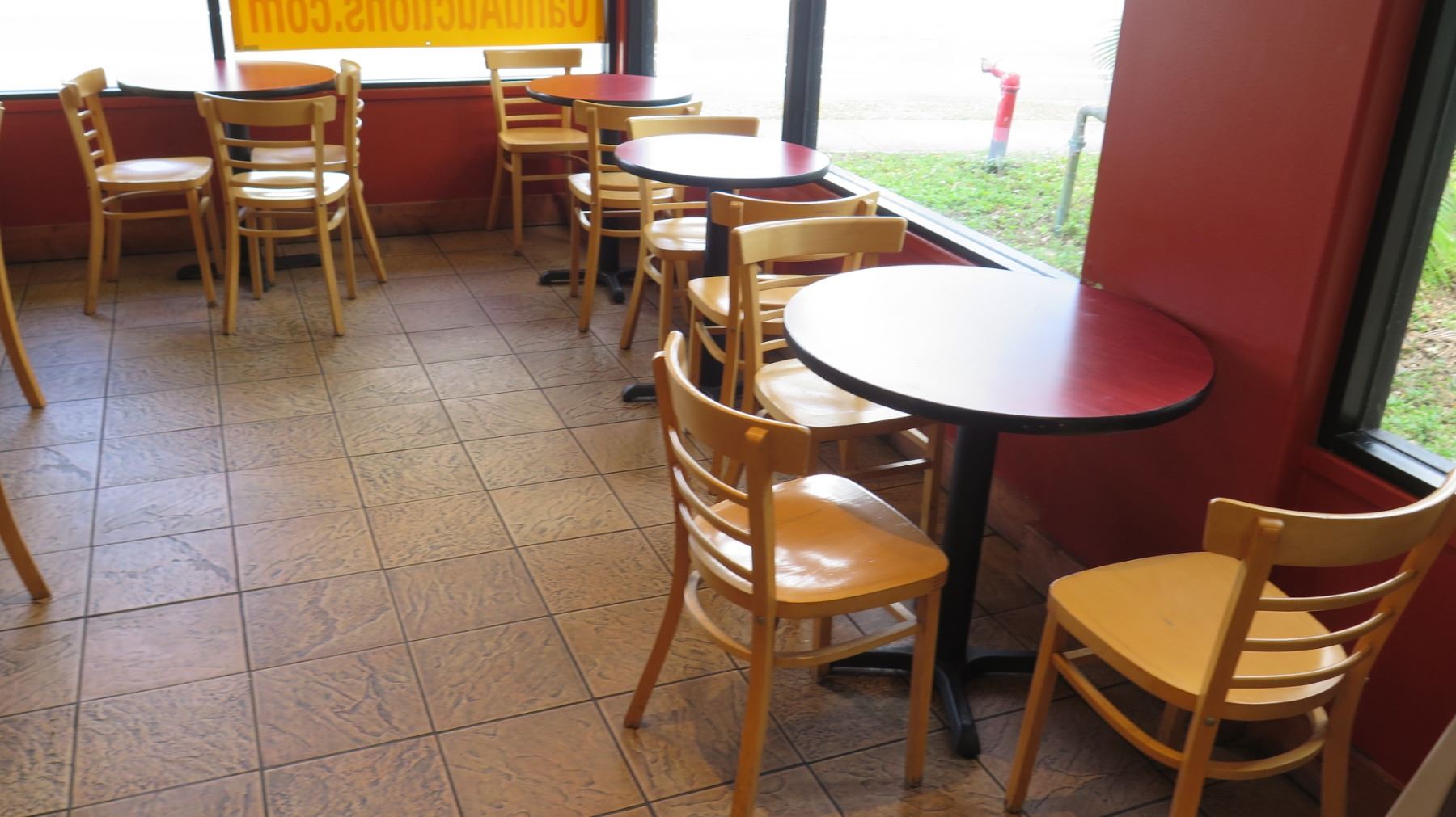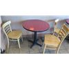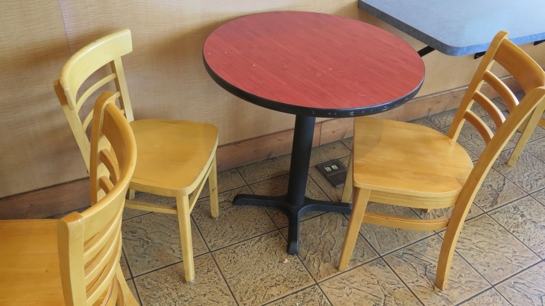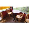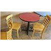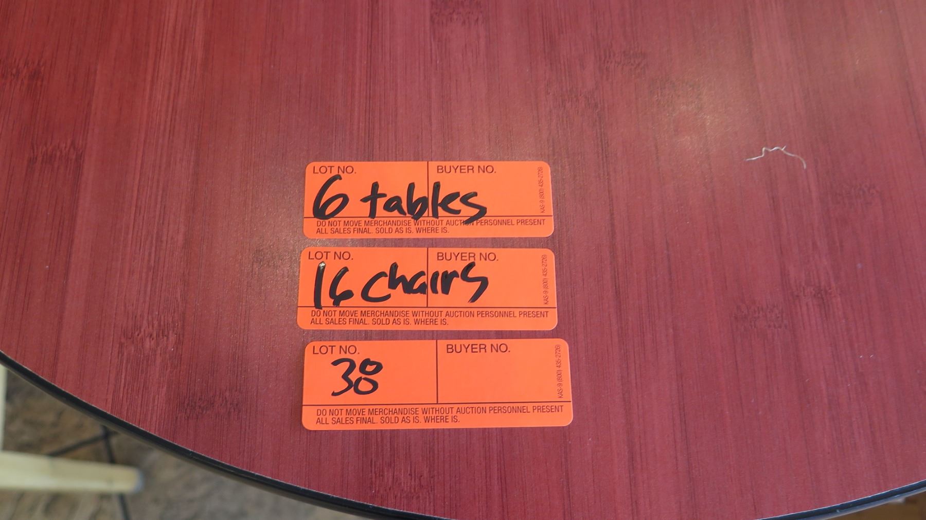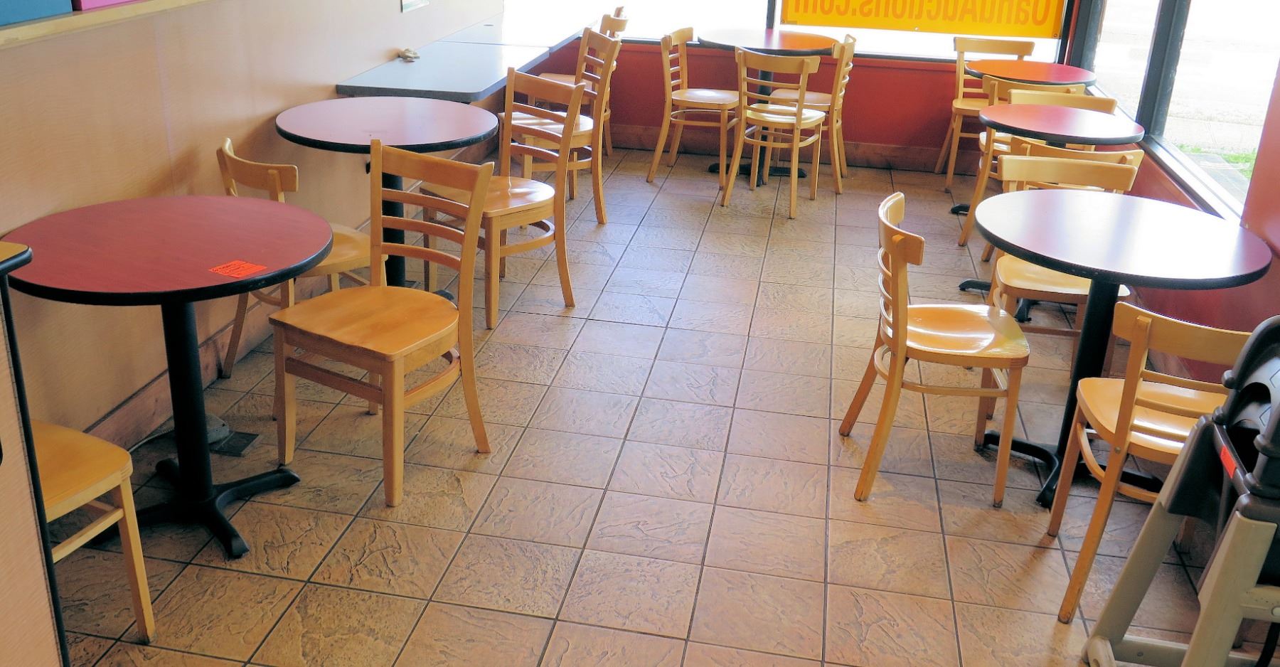 Qty 6 Round 30" Wooden Tables & 16 Wood Chairs. FOOD PRODUCTS AND MERCHANDISE IN THE PICTURES ARE NOT INCLUDED.