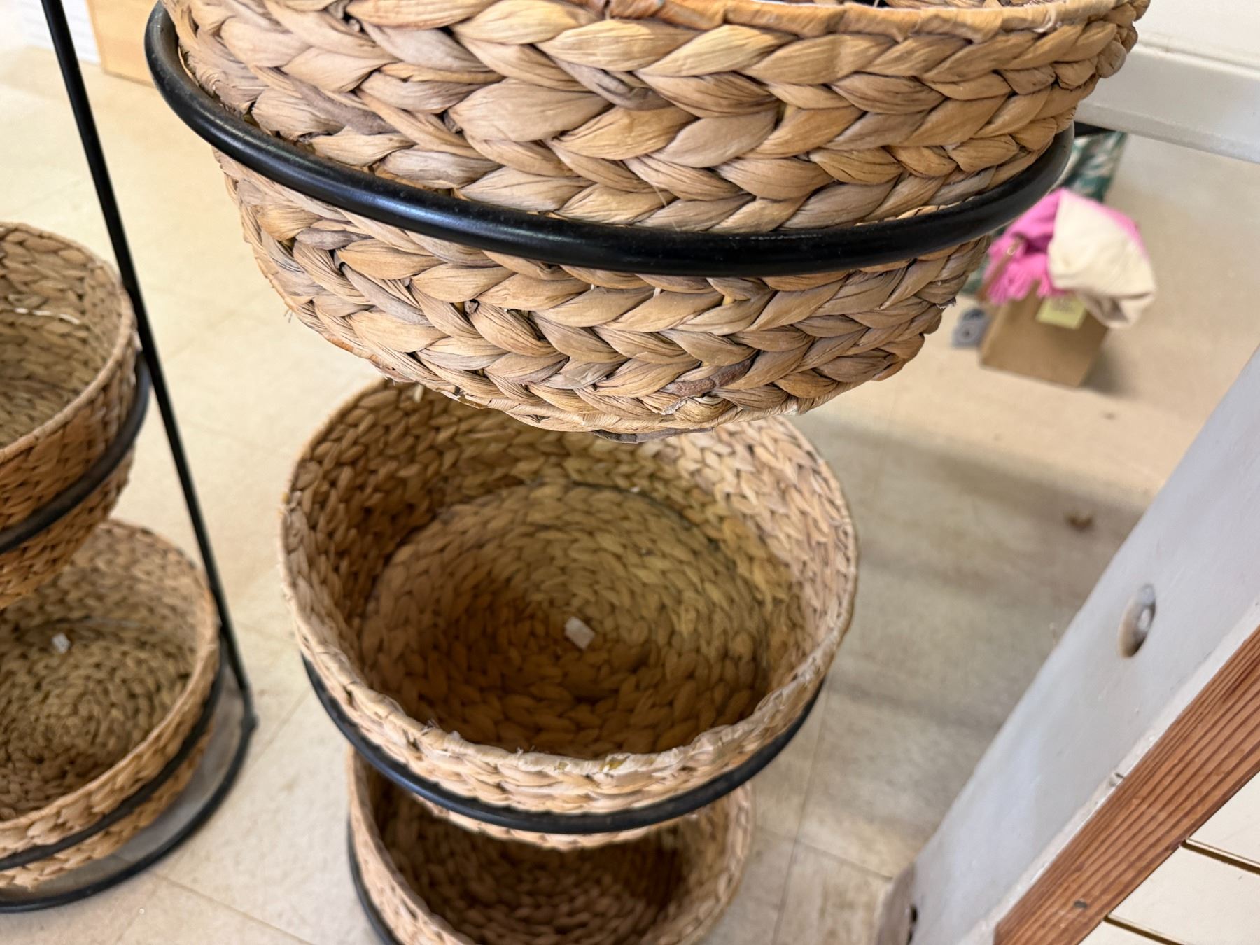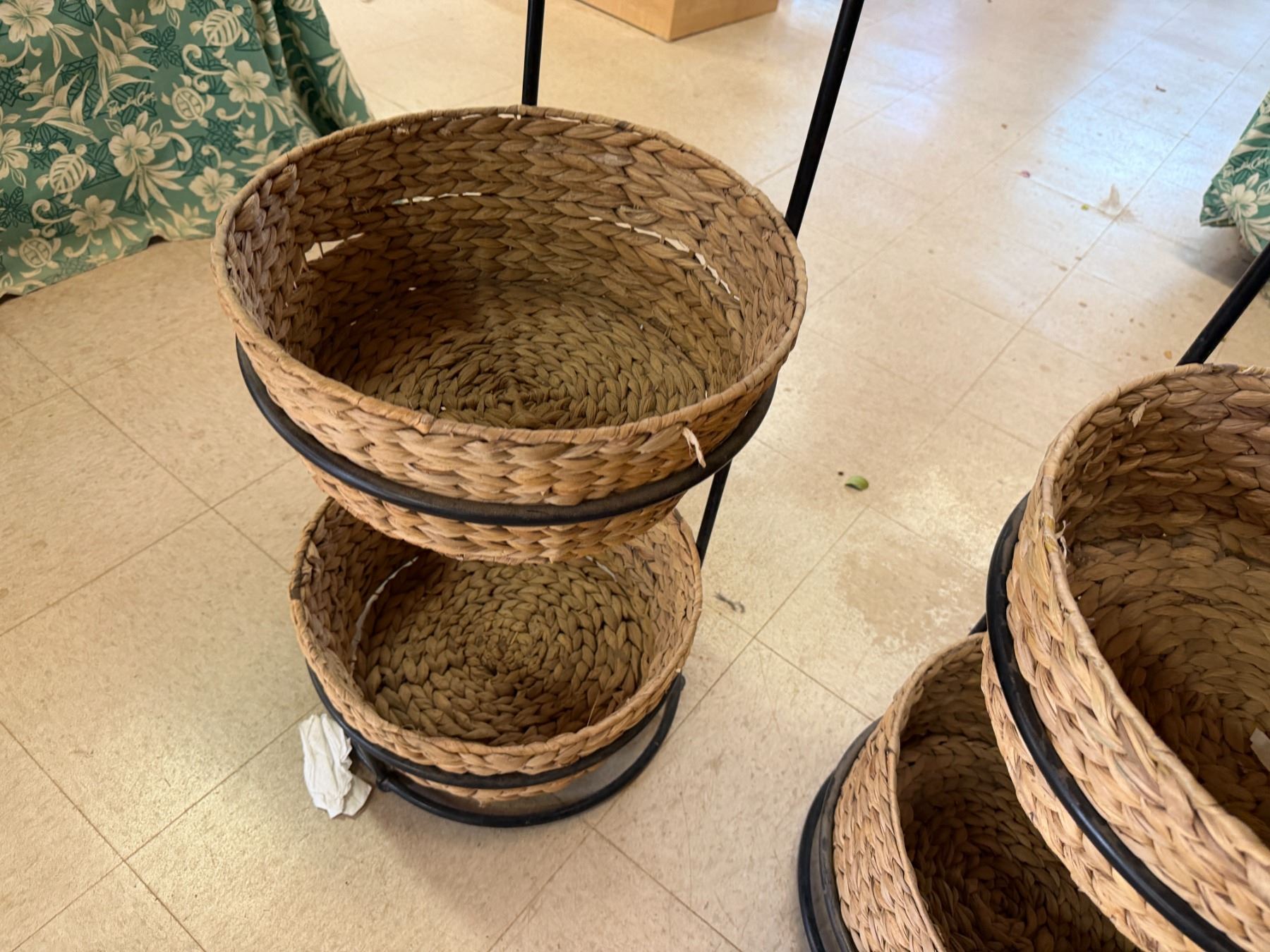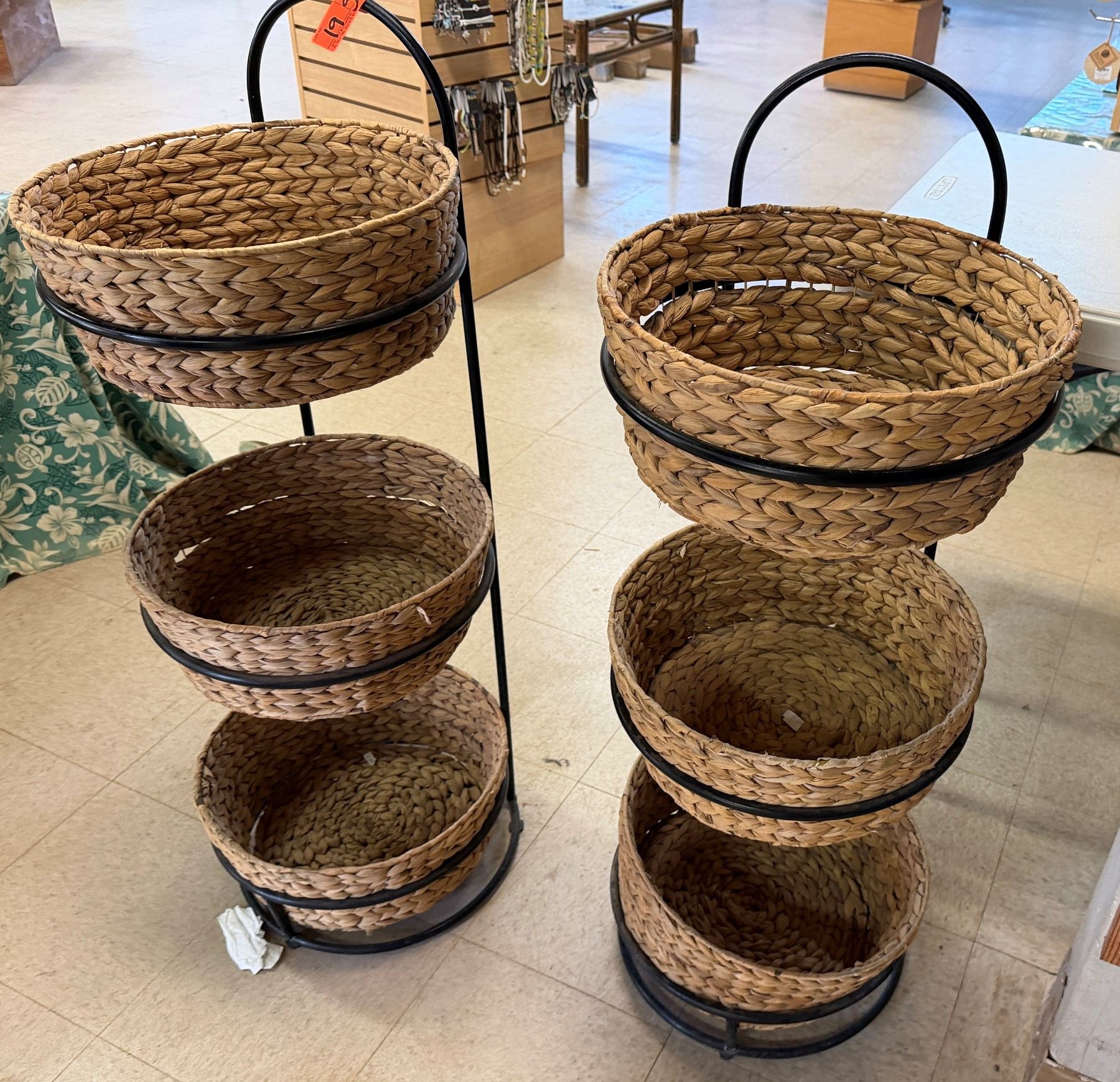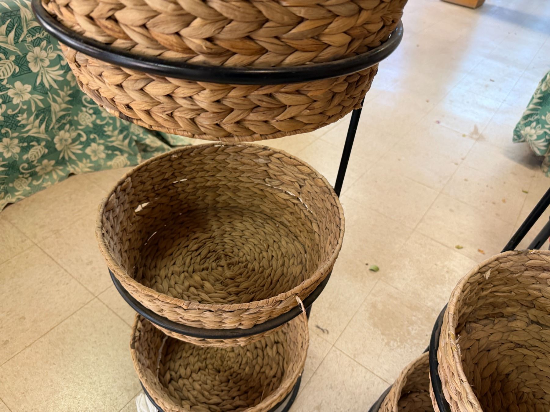 Qty 6 Woven Baskets 15" Dia, 5"H in 2 Metal Stands 37"H