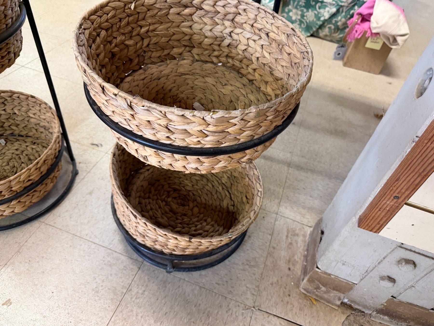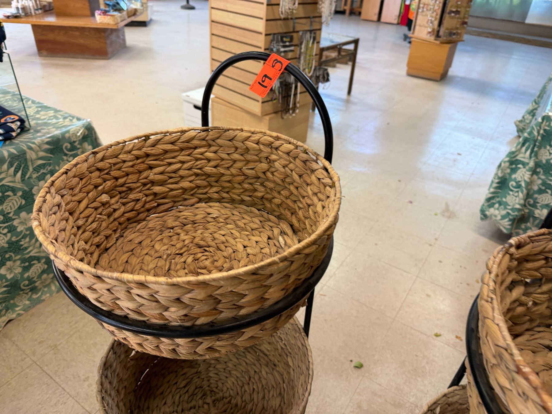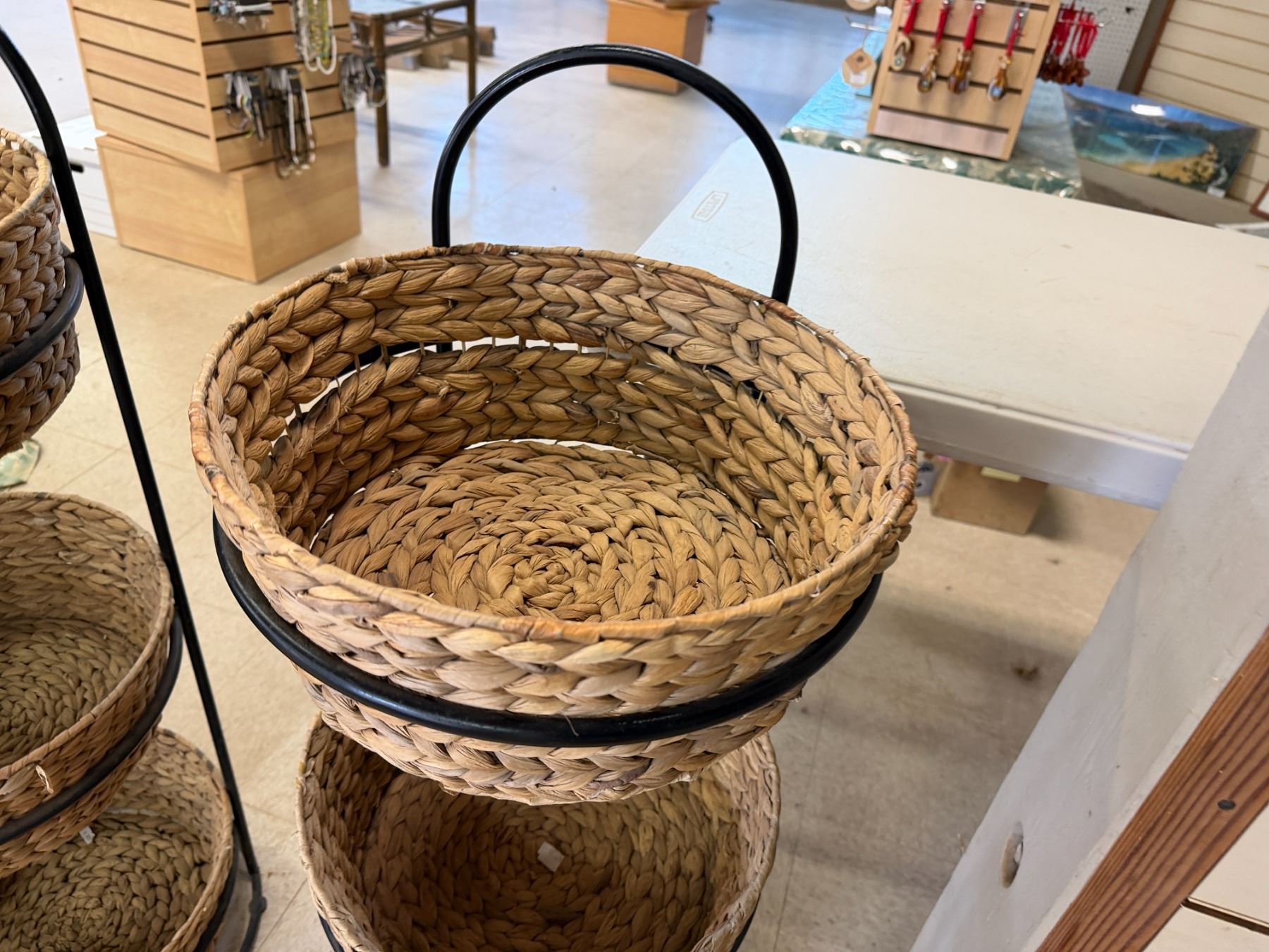 Qty 6 Woven Baskets 15" Dia, 5"H in 2 Metal Stands 37"H