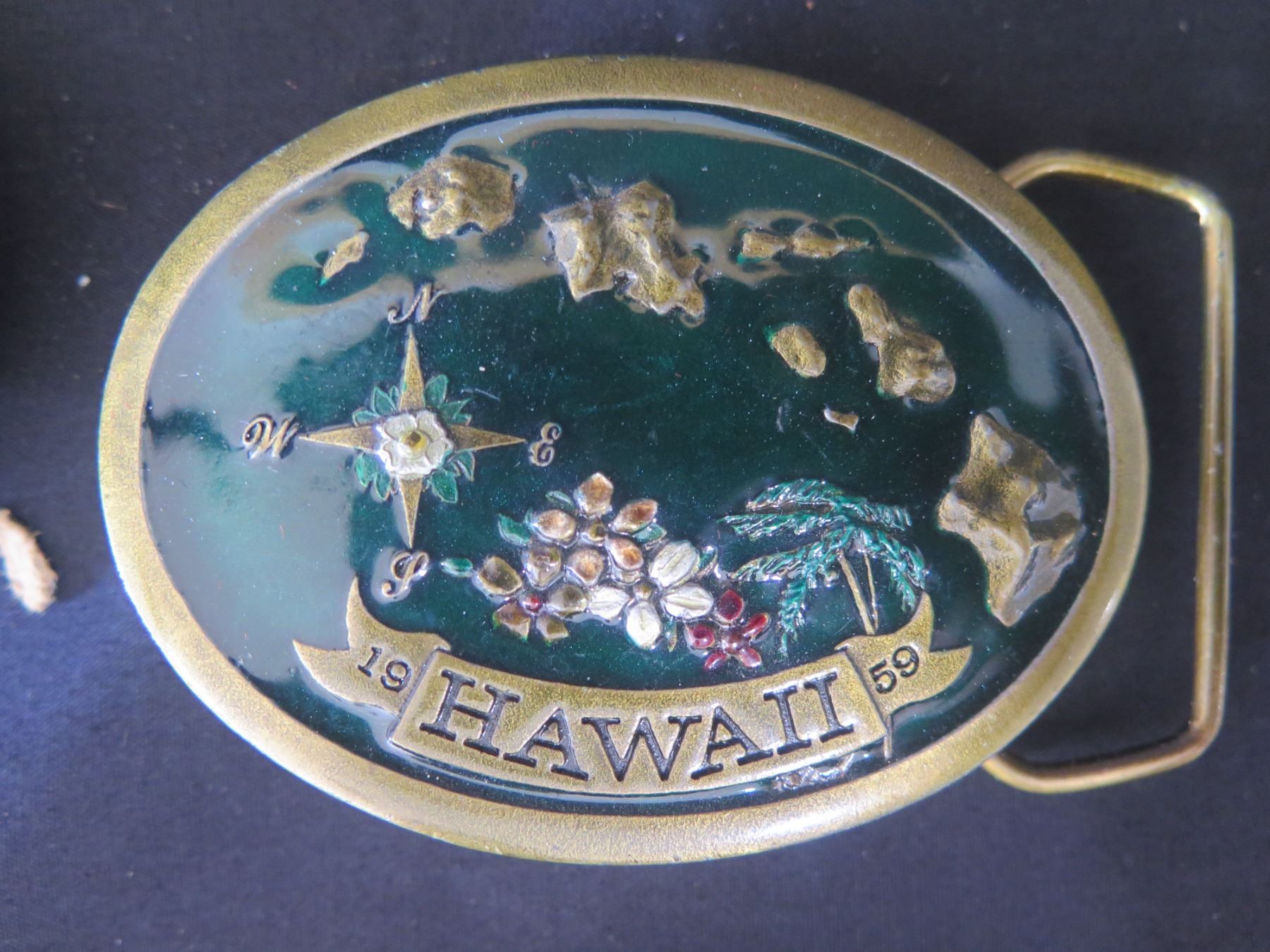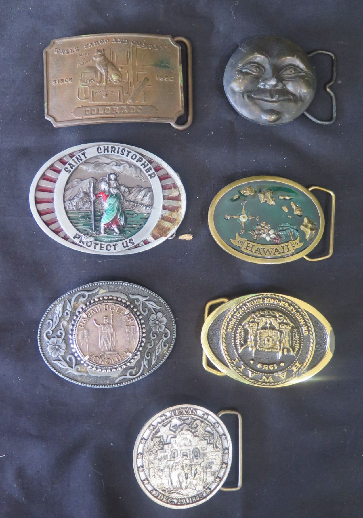 Qty 7 Belt Buckles: Colorado, Saint Christopher, Hawaii, Texas, etc