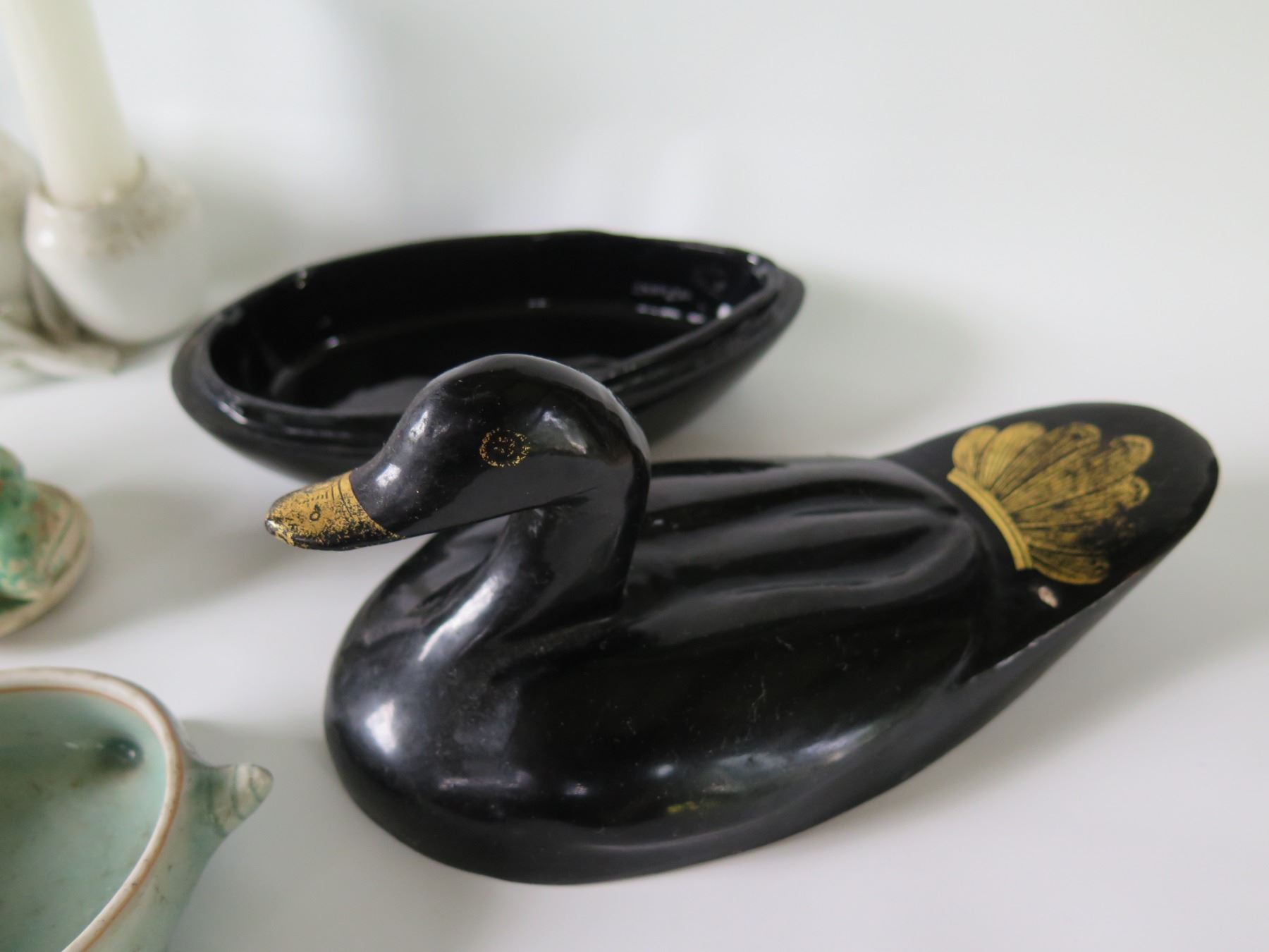 Qty 7 Ceramic Animal Figurines, Black Ducks Covered Dish