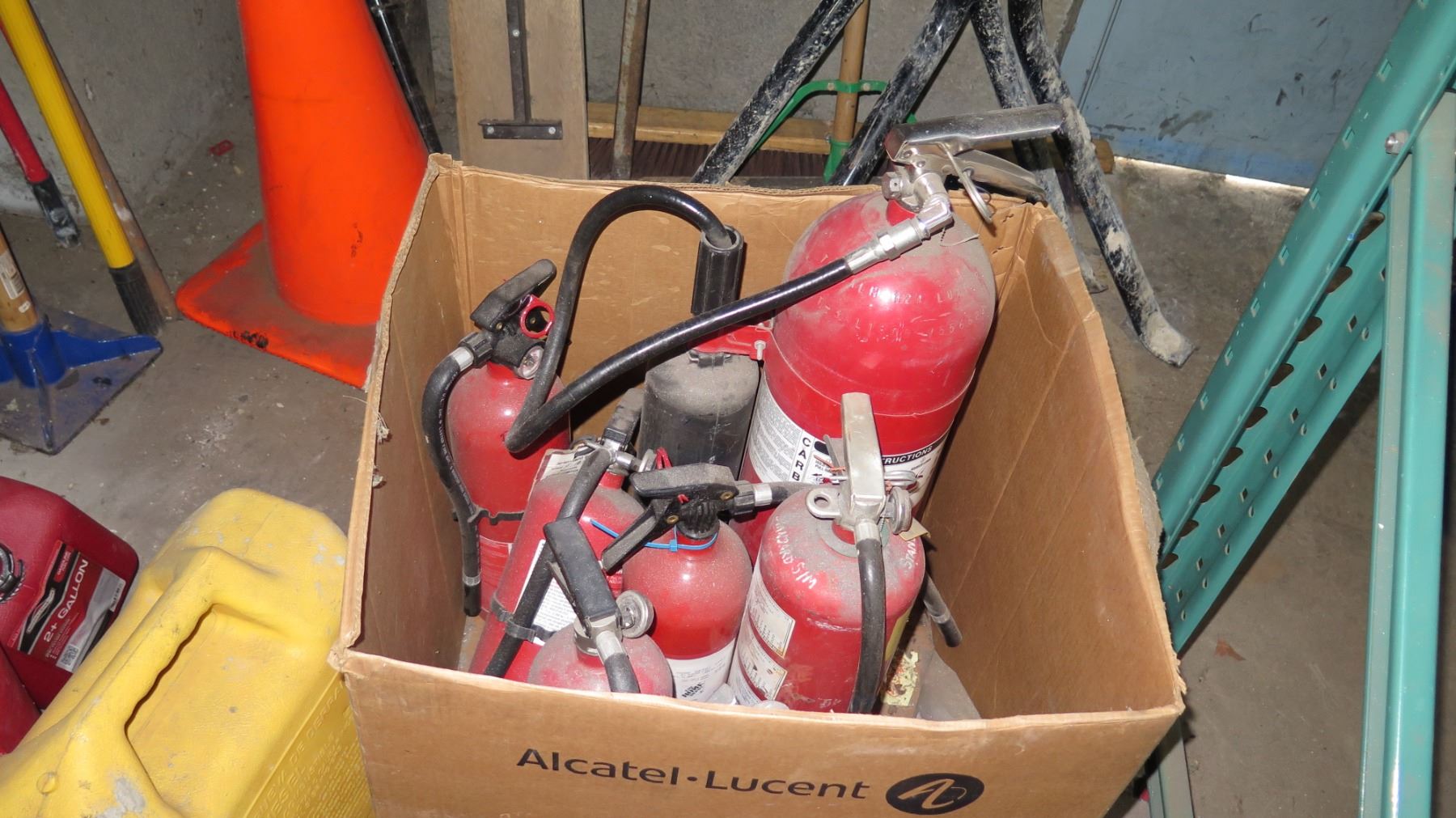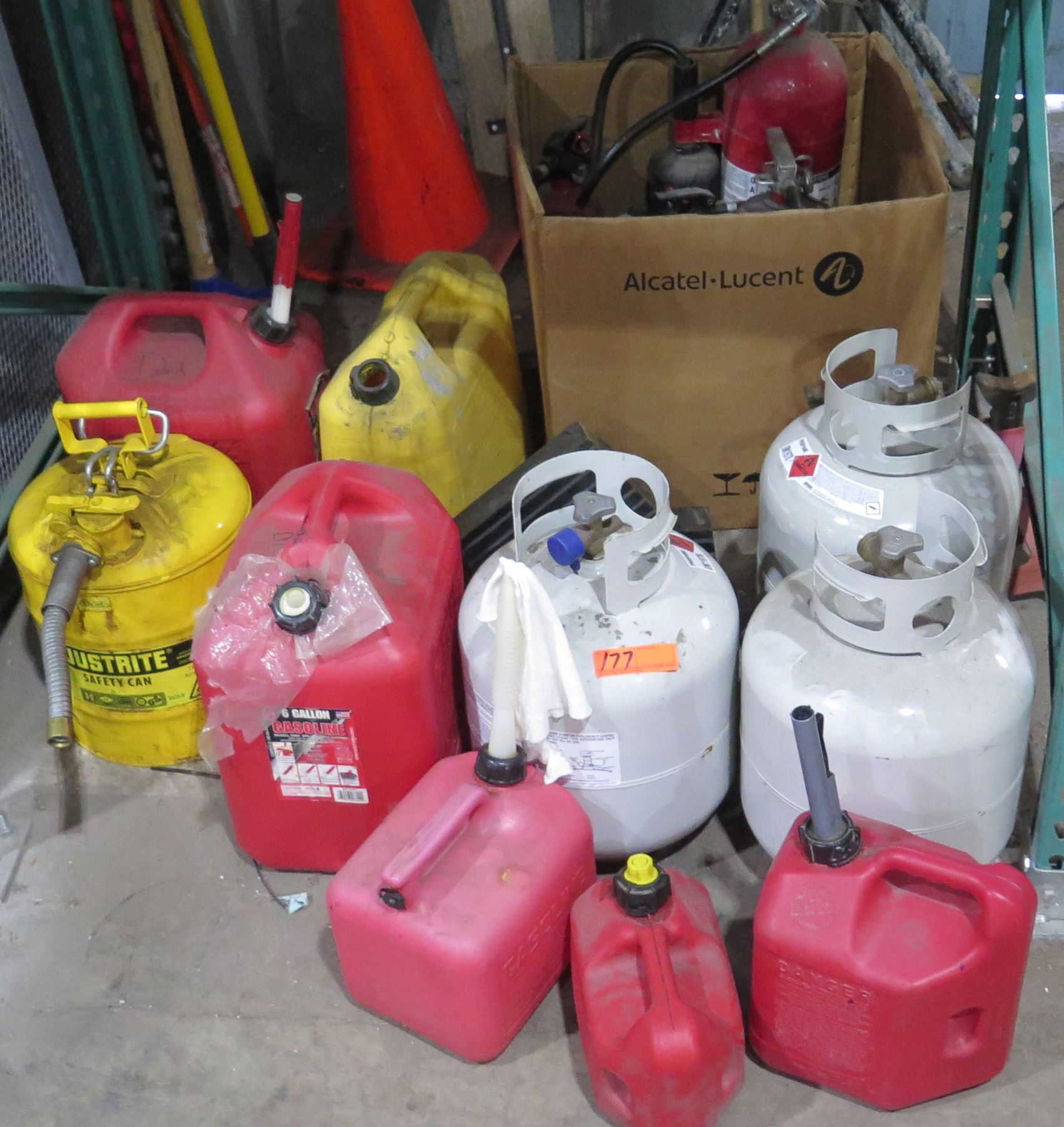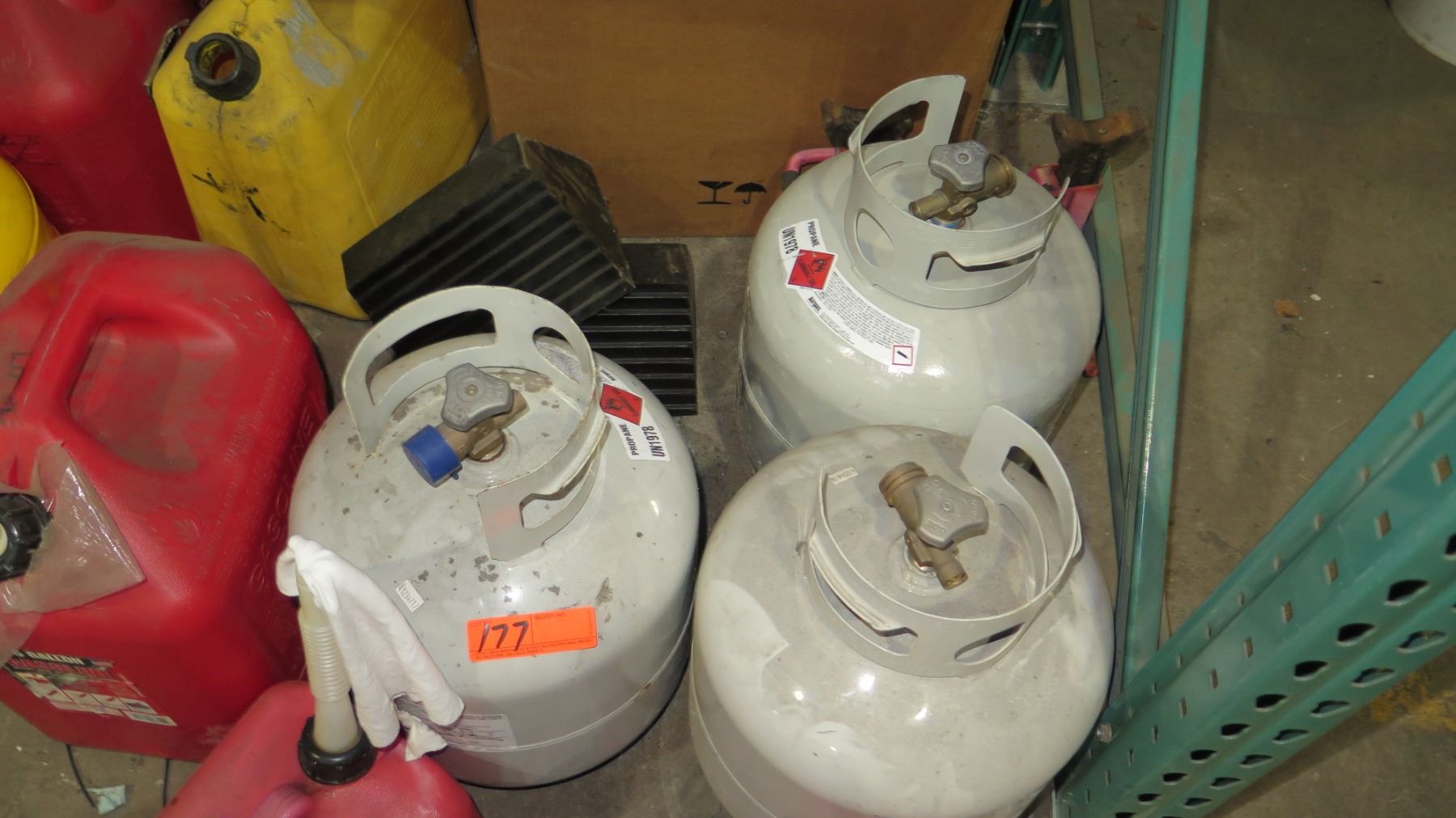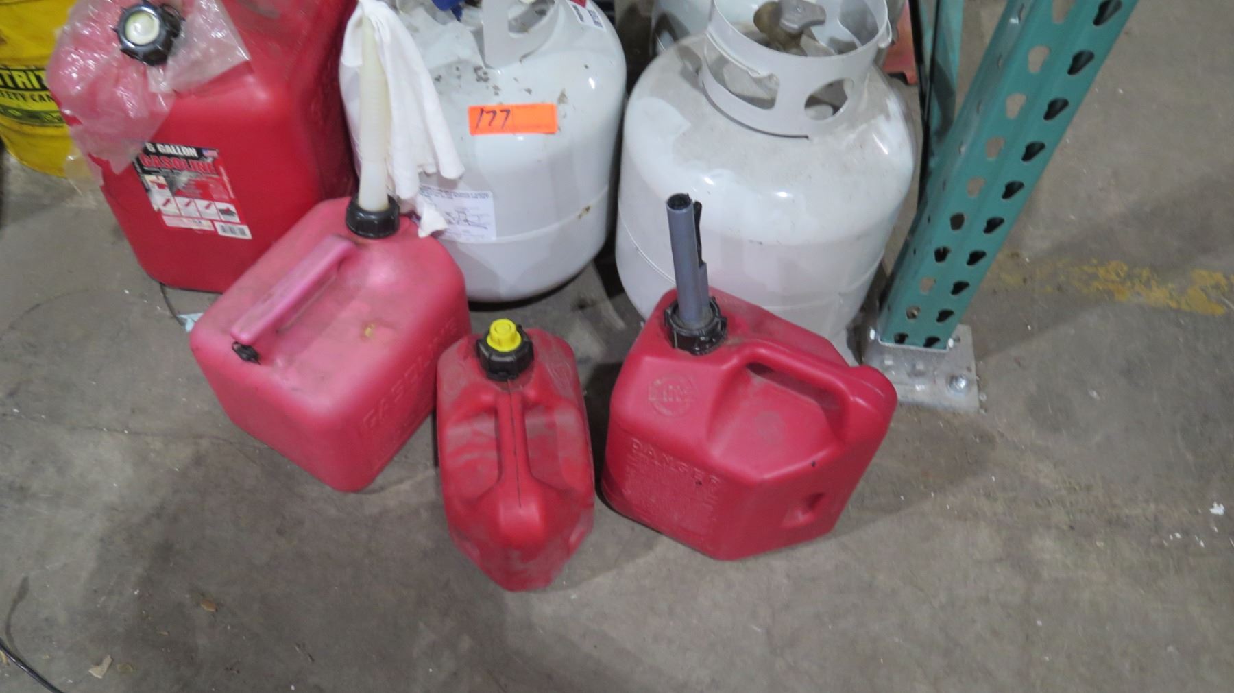 Qty 7 Gas Cans - 2 Metal & 5 Red Plastic & 2 Propane Tanks