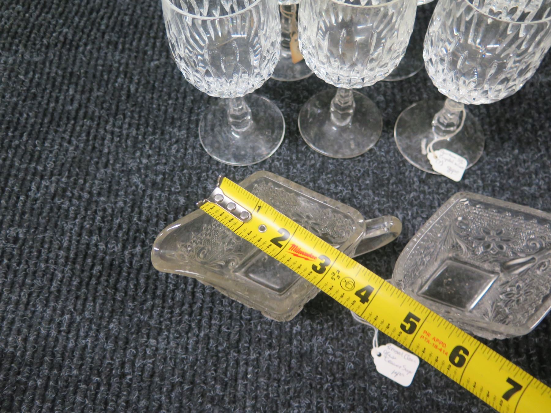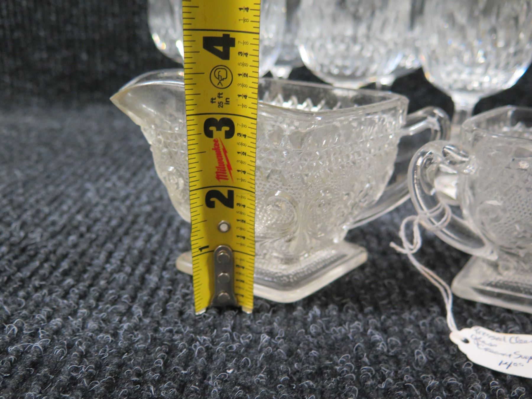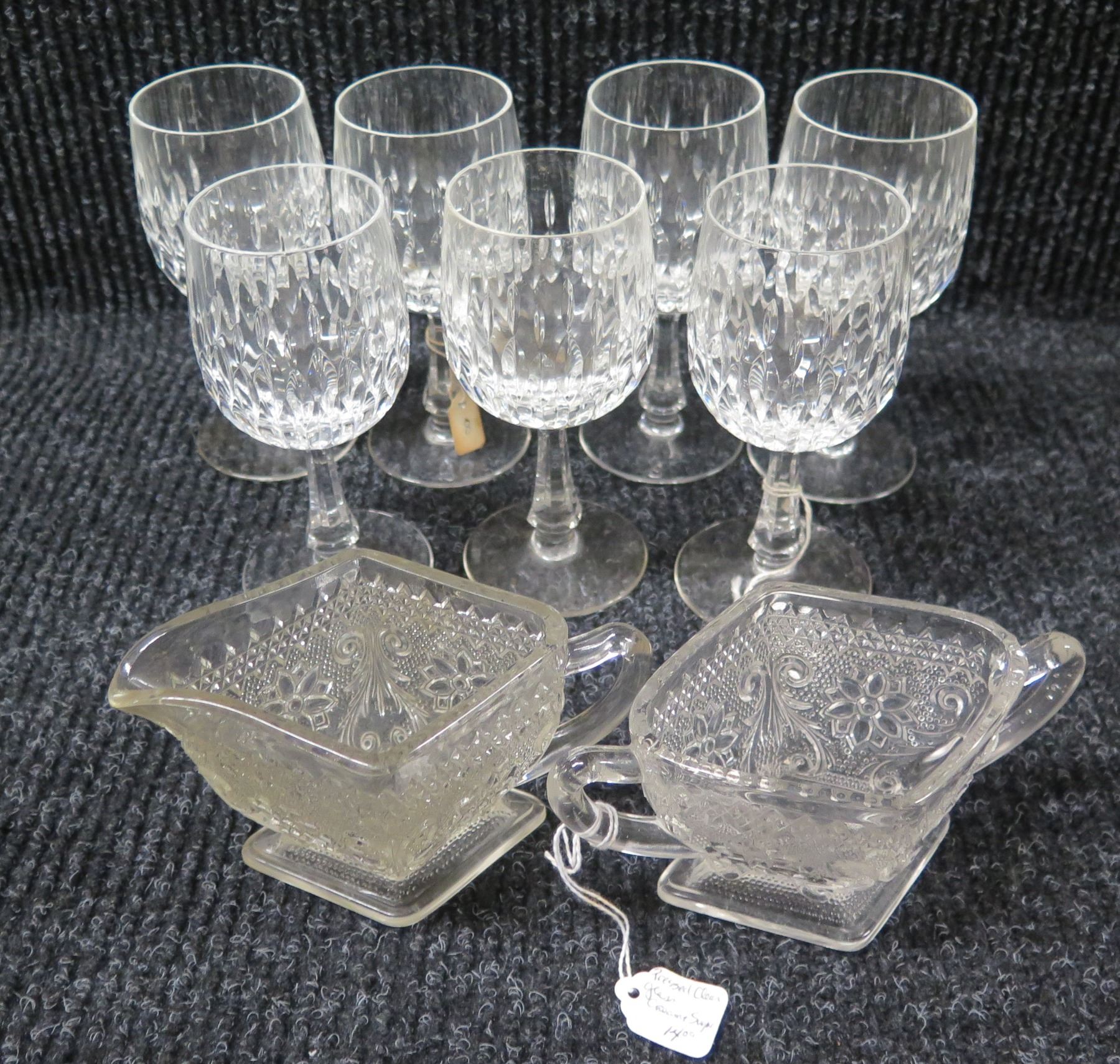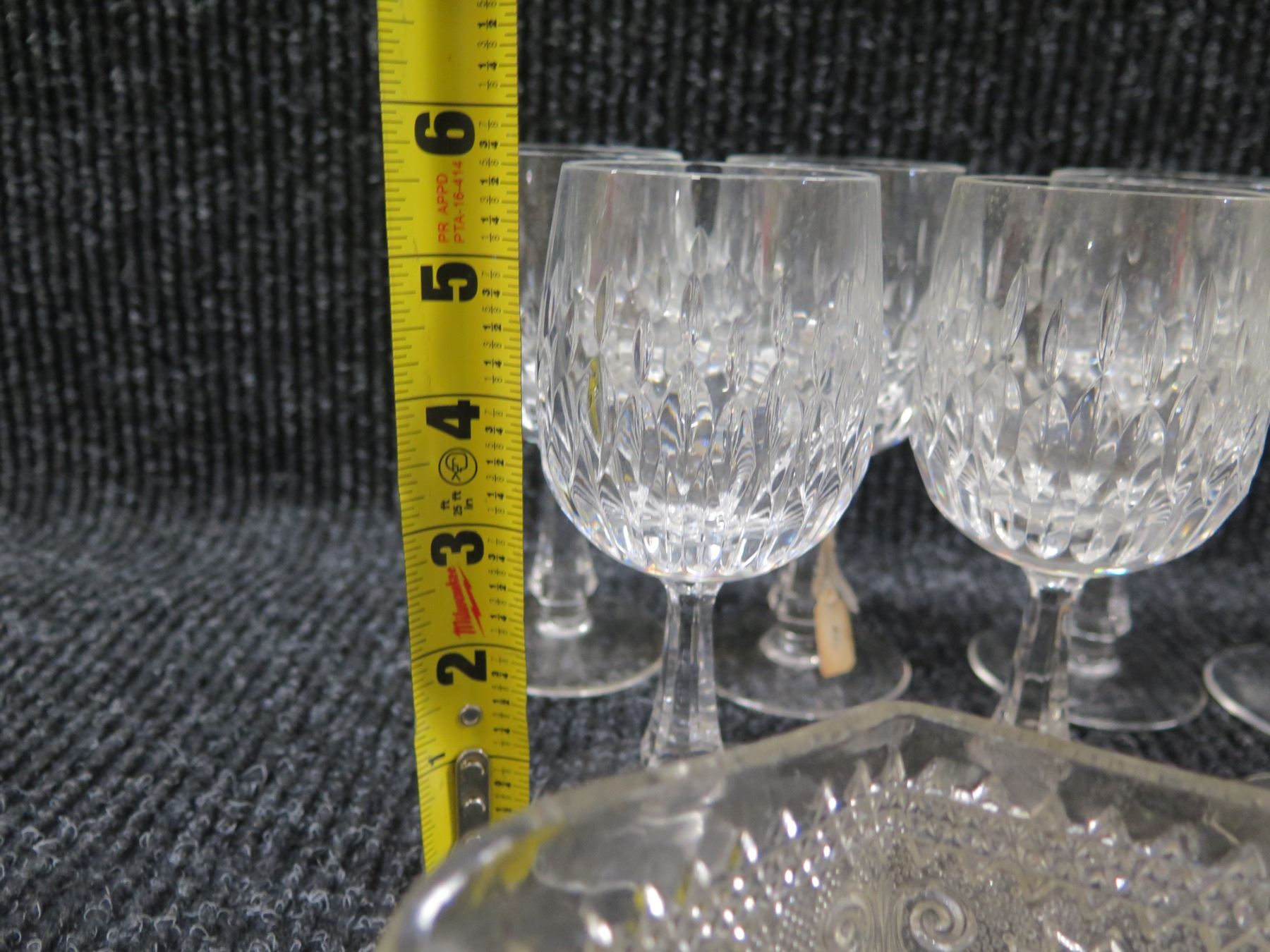 Qty 7 Gotham Crystal Wine Glasses & 2 Pressed Clear Glass Creamer & Sugar Bowl
