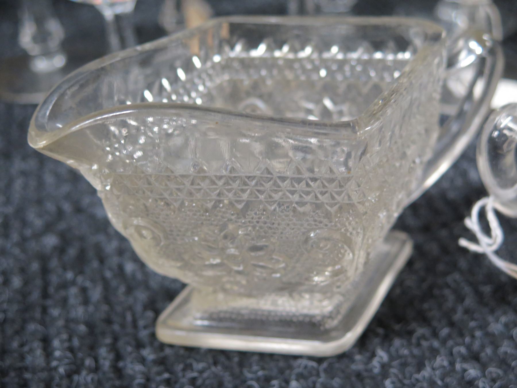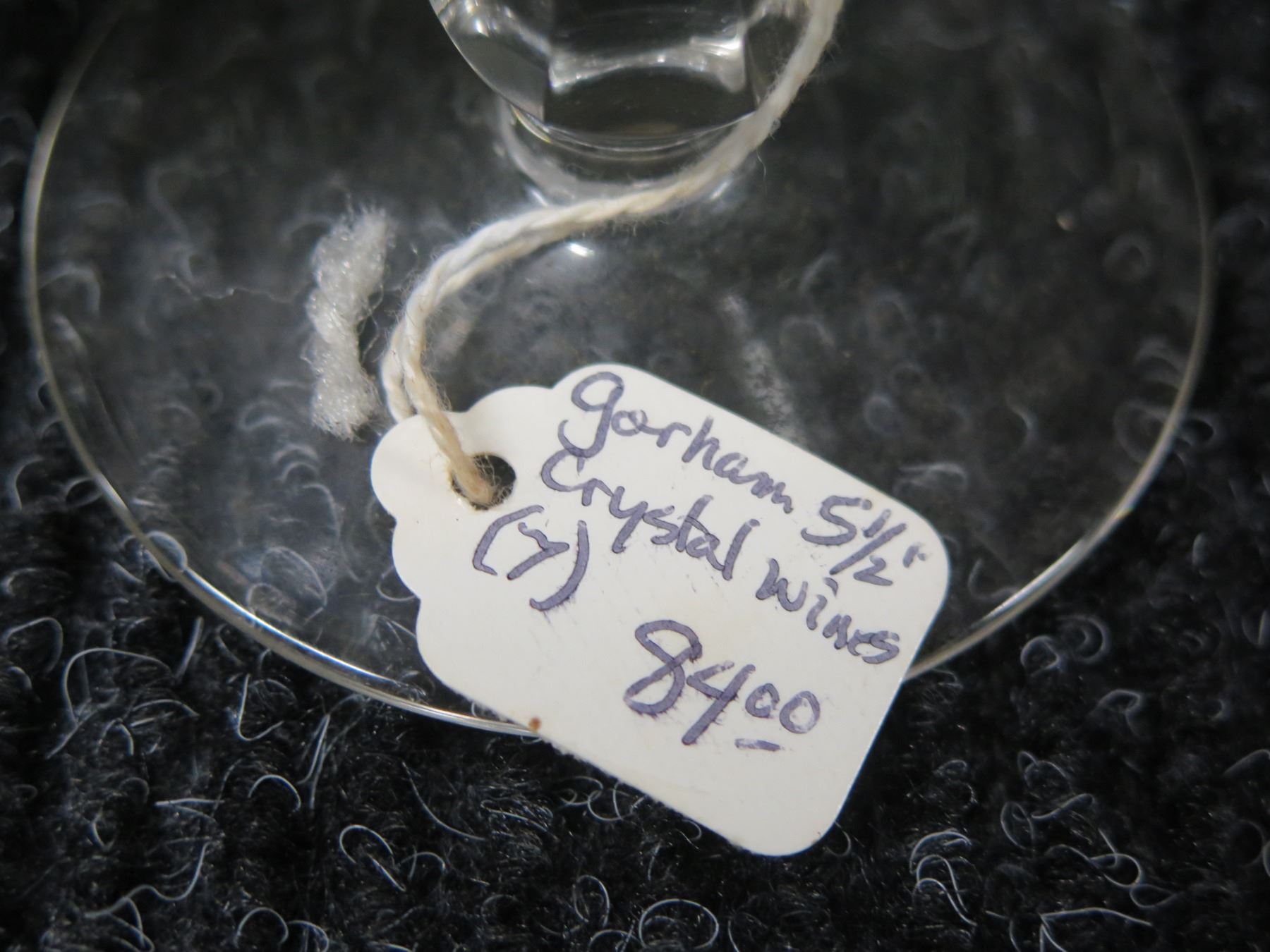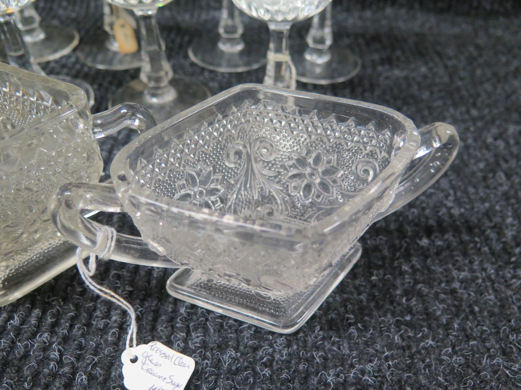 Qty 7 Gotham Crystal Wine Glasses & 2 Pressed Clear Glass Creamer & Sugar Bowl