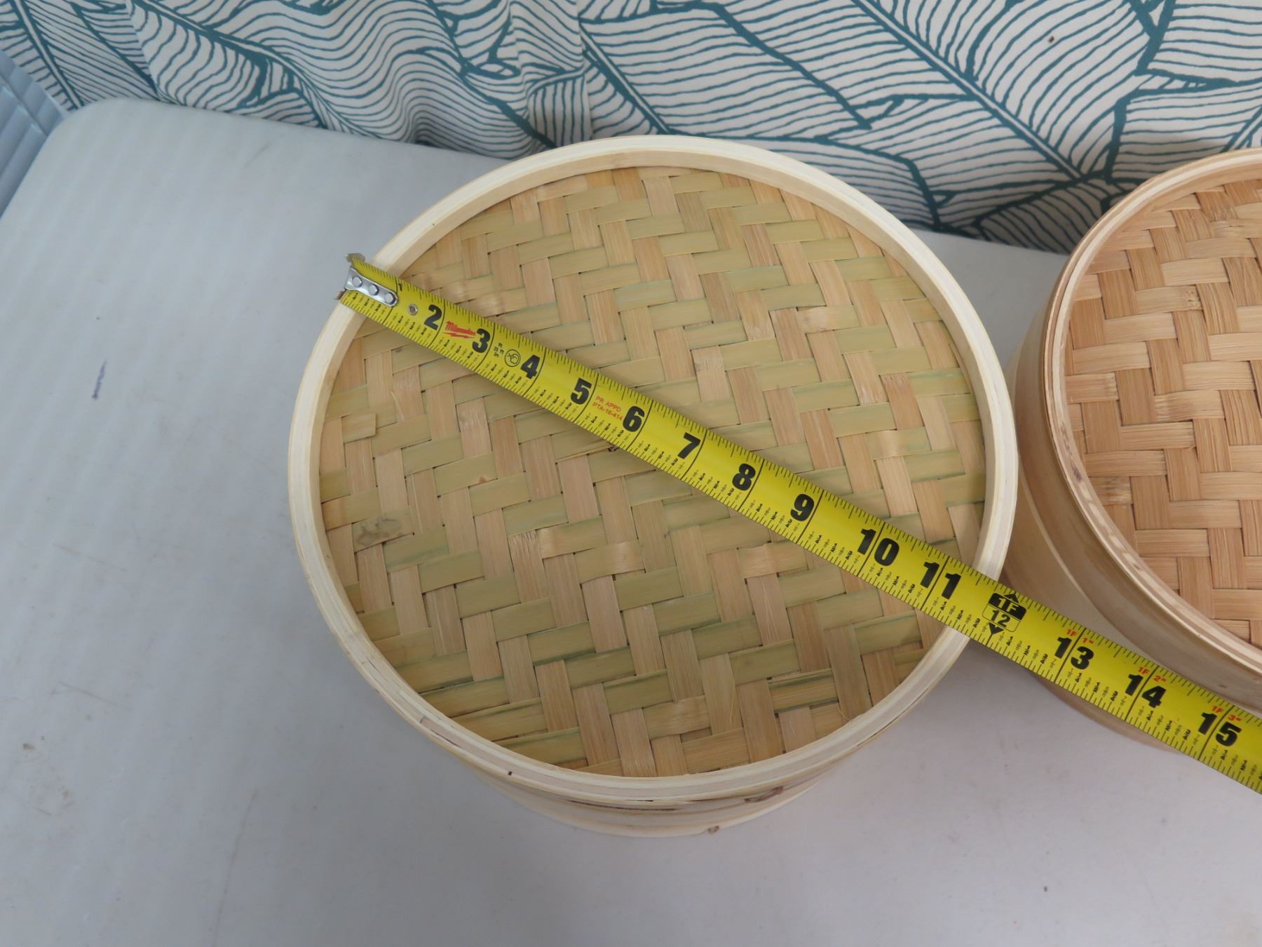 Qty 7 Japan Bargain Bamboo Steamers, Misc Sizes 3" - 12" Dia. This is a stock photo, representative of item. Condition may vary.