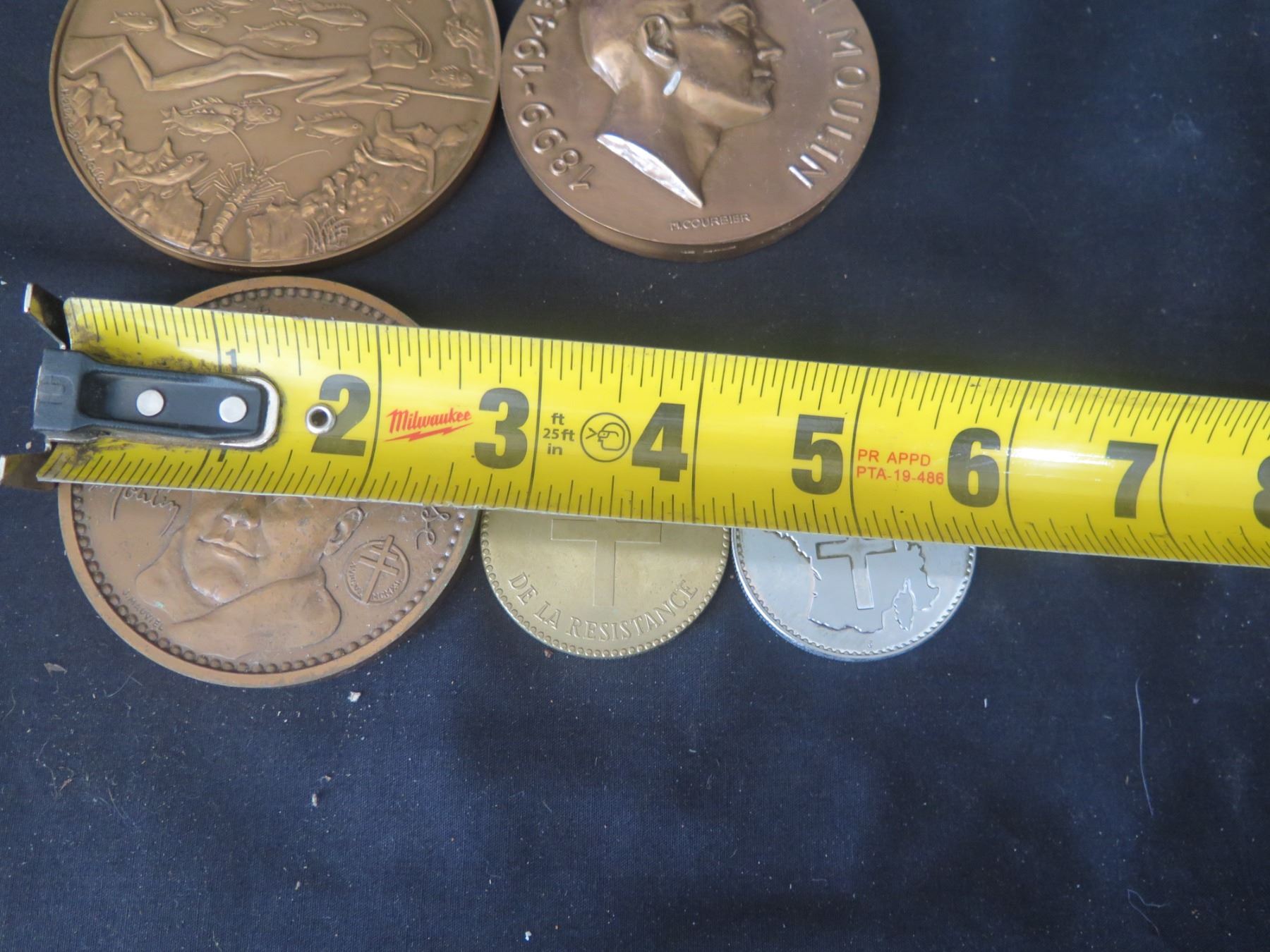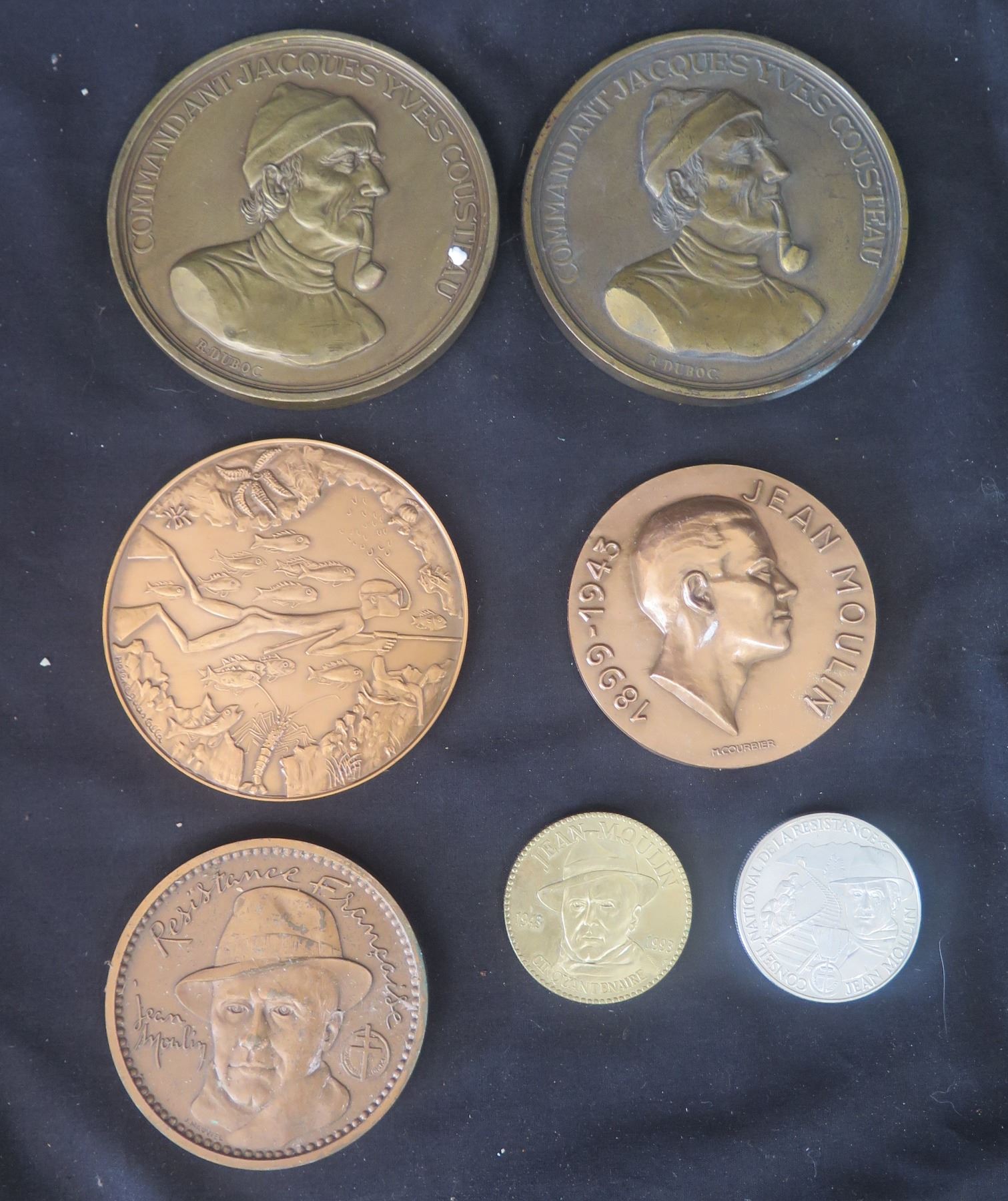 Qty 7 Medals & Coins: Jacques Cousteau, Jean Moulin, etc - Some Marked