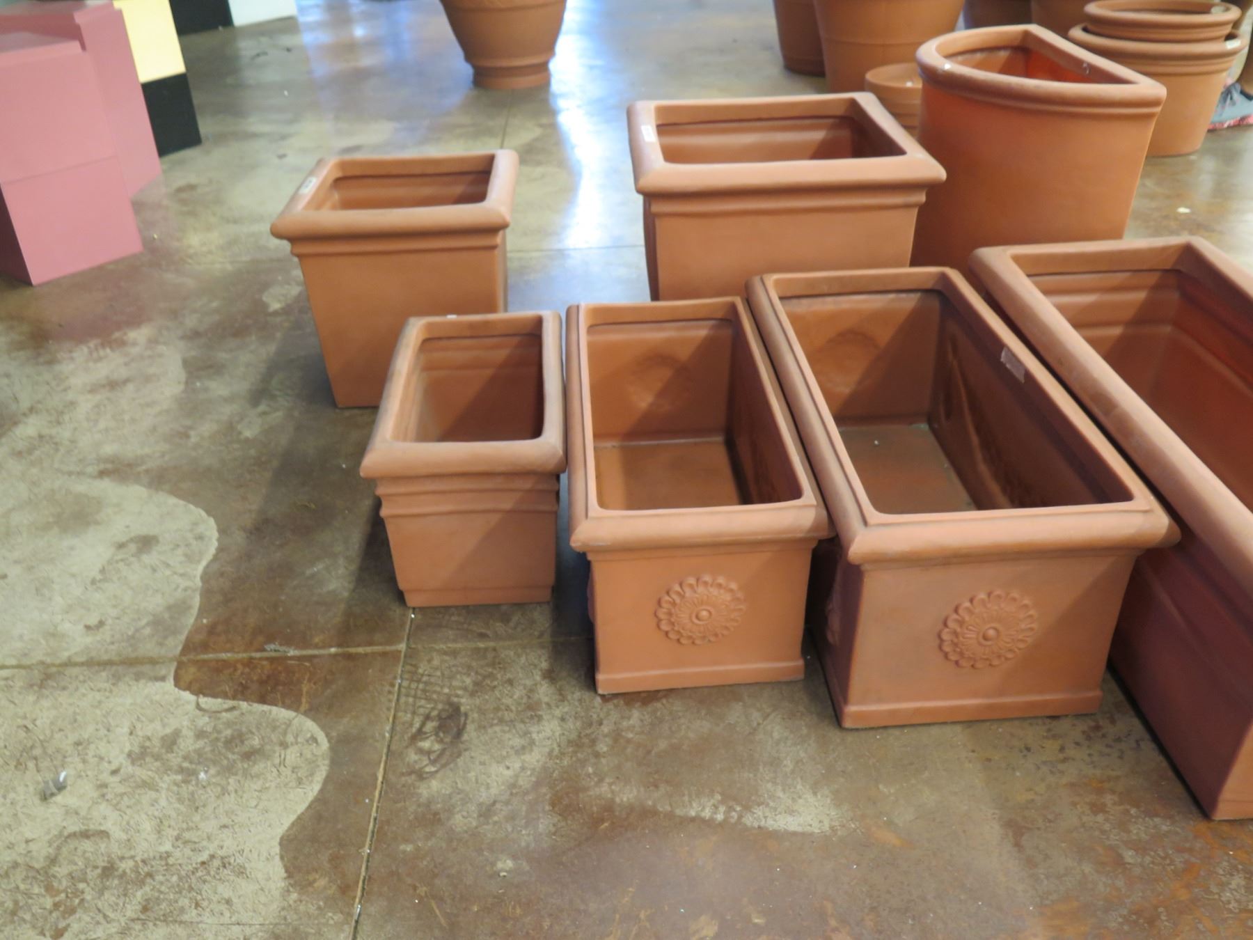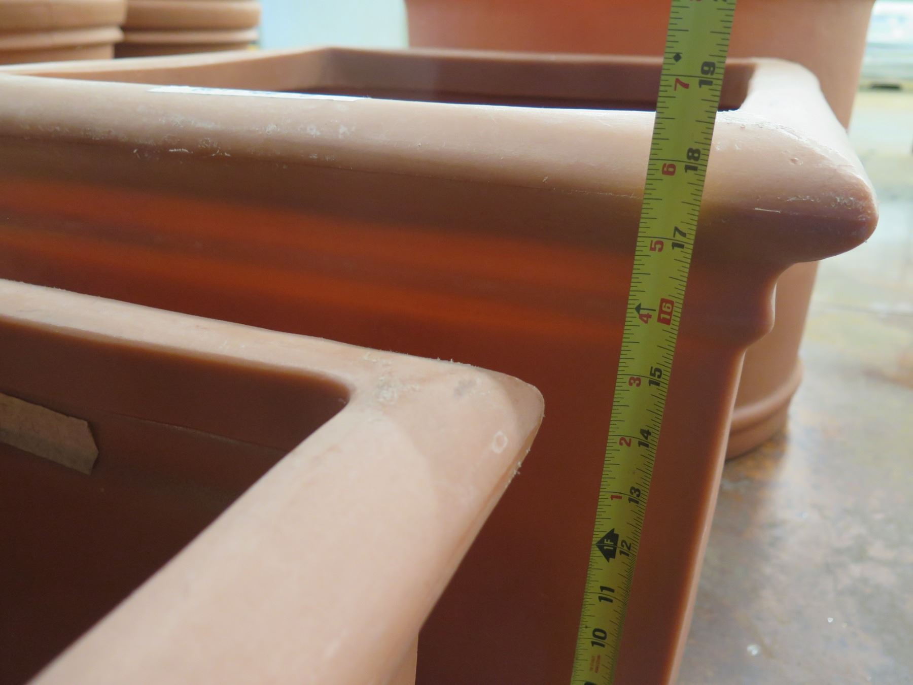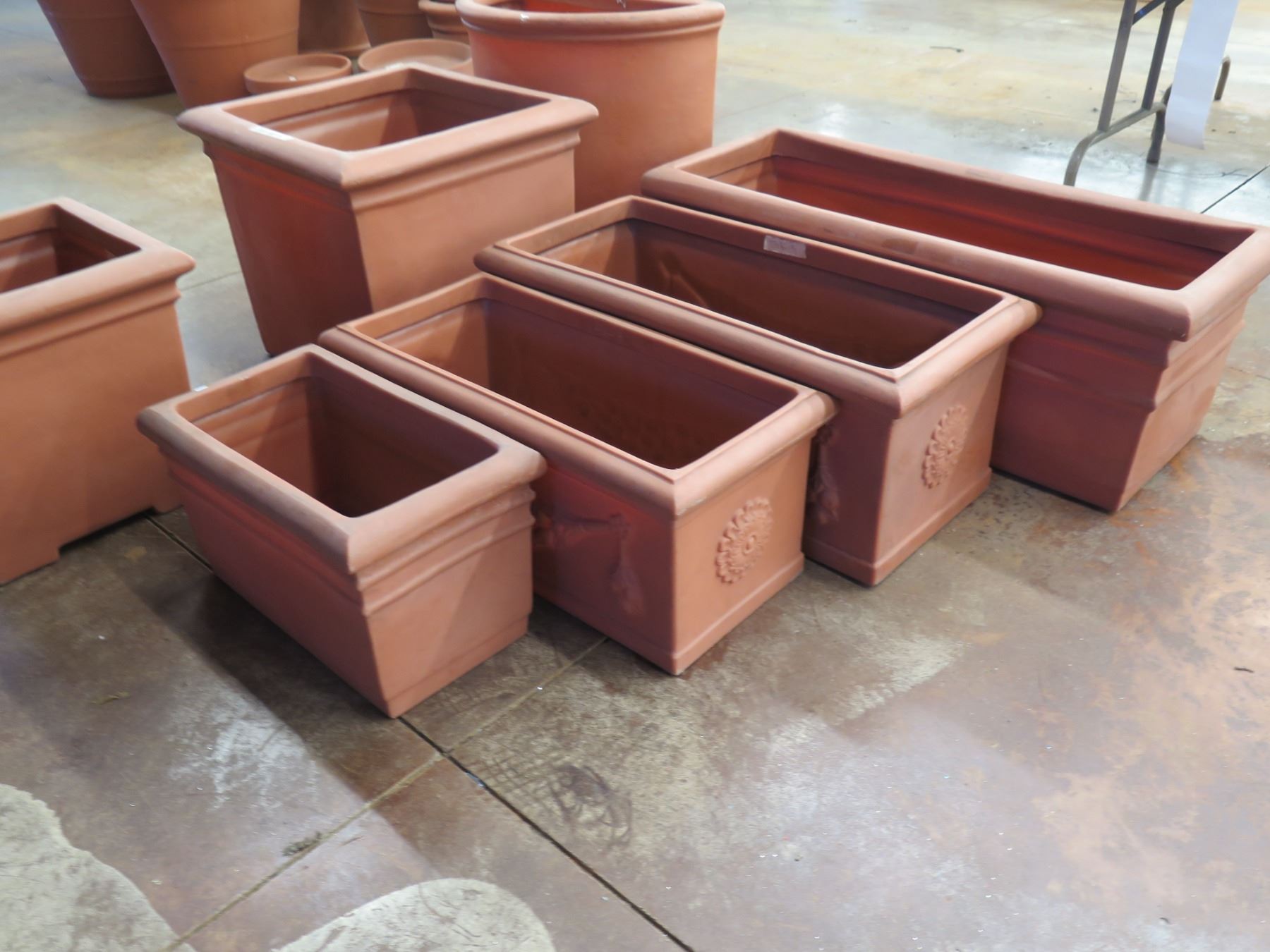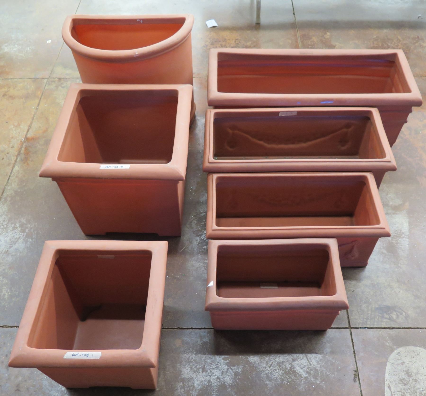 Qty 7 Terra Cotta-Look Plastic Planters: 6 Rectangle 12-17" x 18-38"H & Round Pot