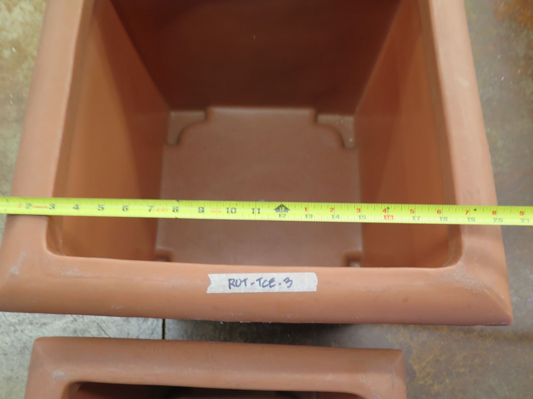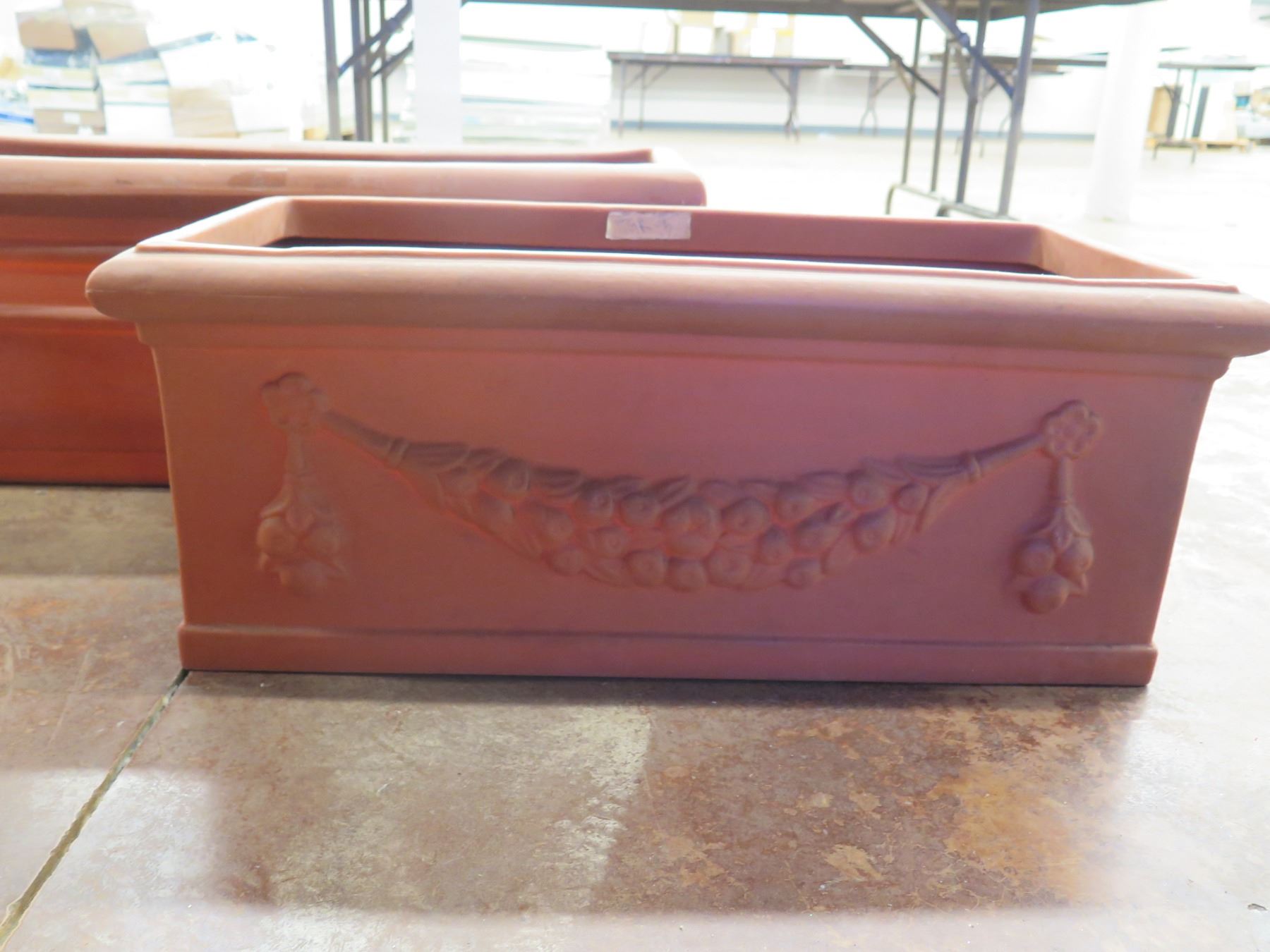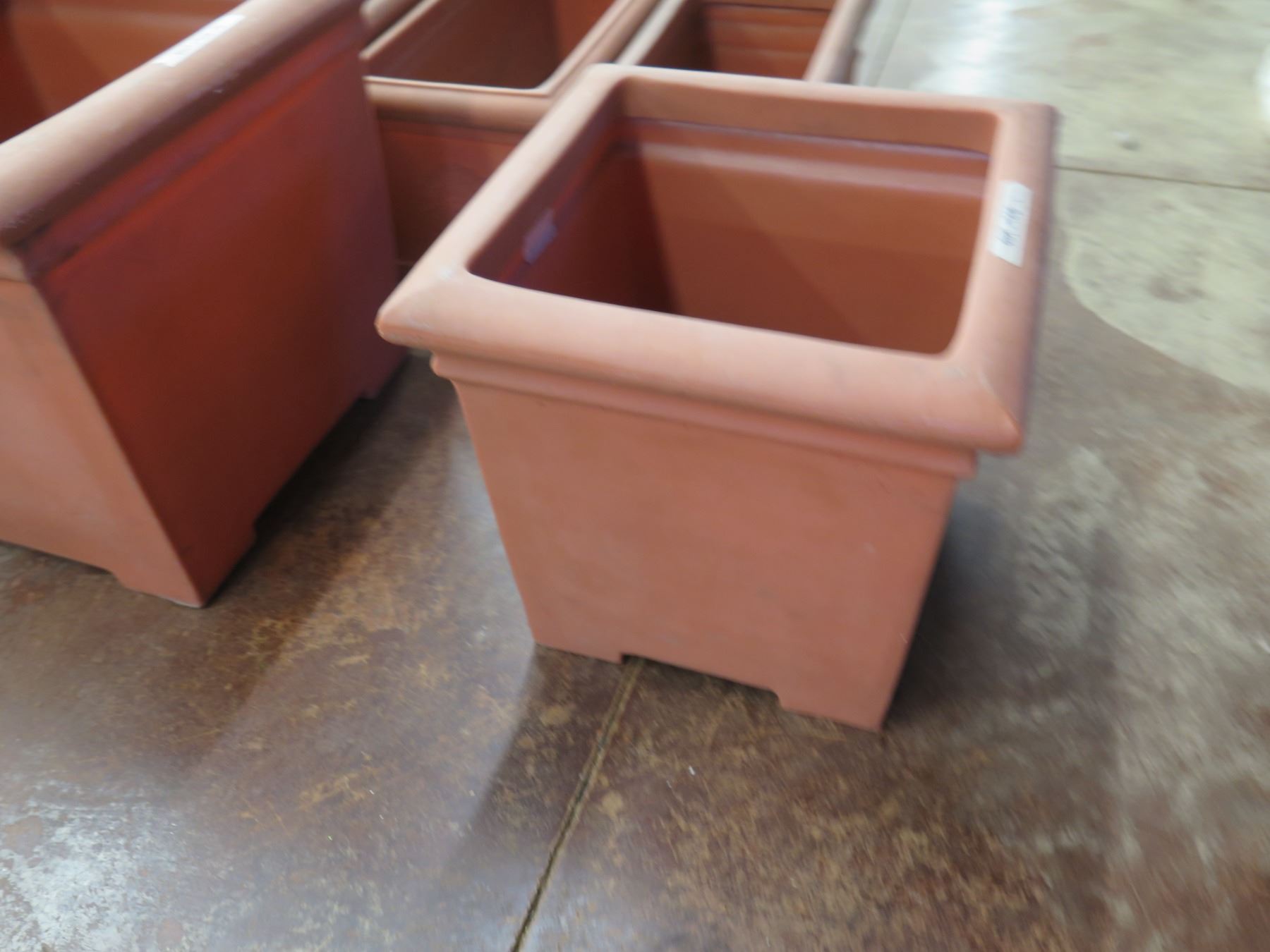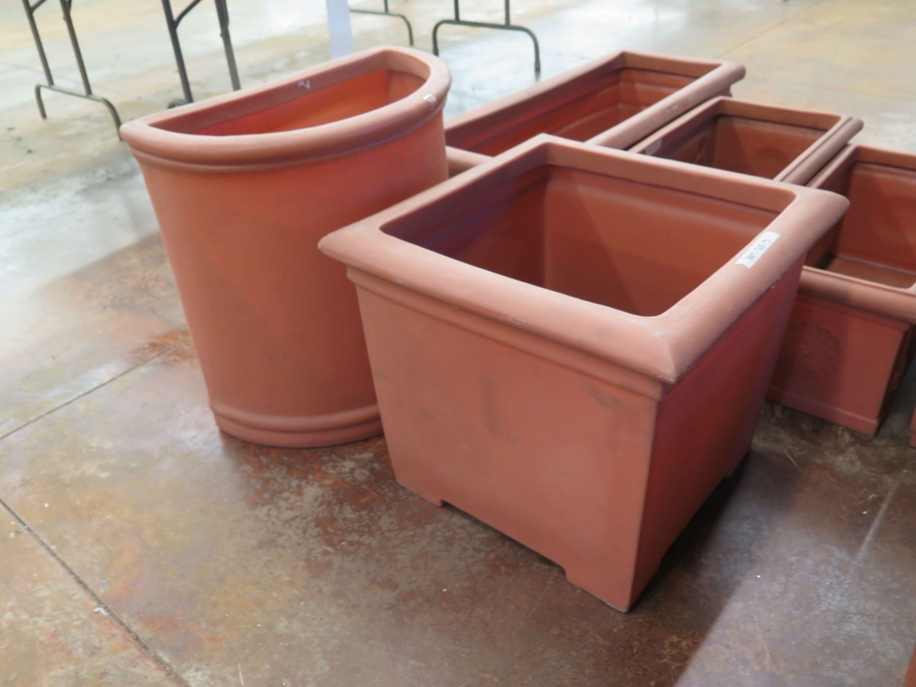 Qty 7 Terra Cotta-Look Plastic Planters: 6 Rectangle 12-17" x 18-38"H & Round Pot