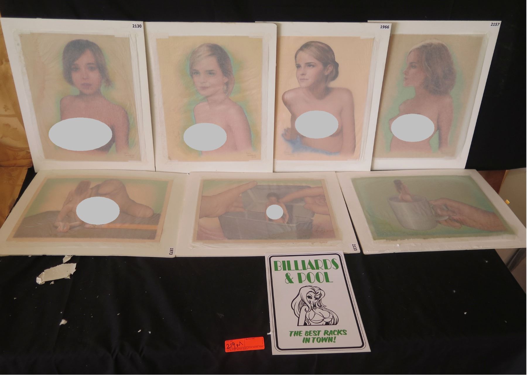 Qty 7 Unframed Artwork Nude Ladies, Misc Size & Billiards & Pool Sign
