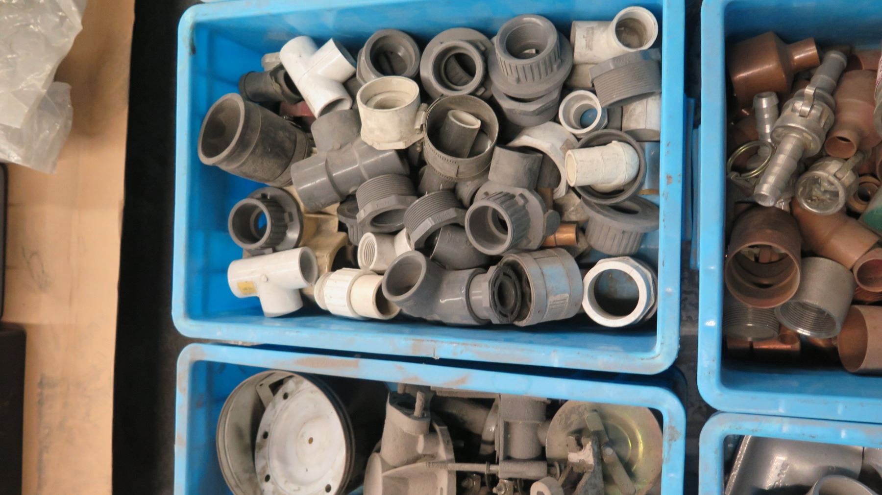 Qty 8 Bins Misc Plastic & Copper Fittings - Elbows, Couplings, etc