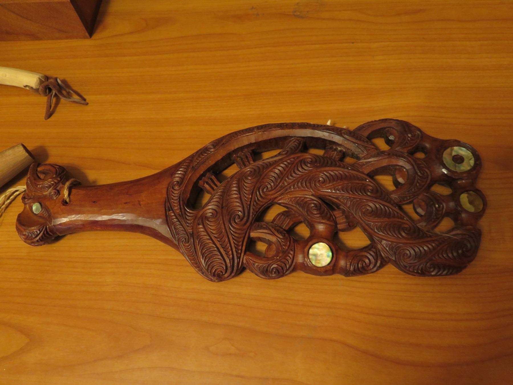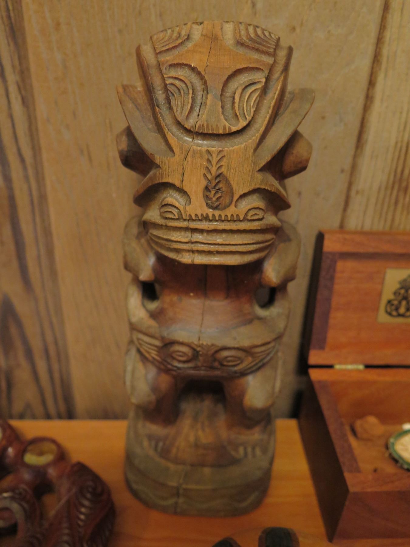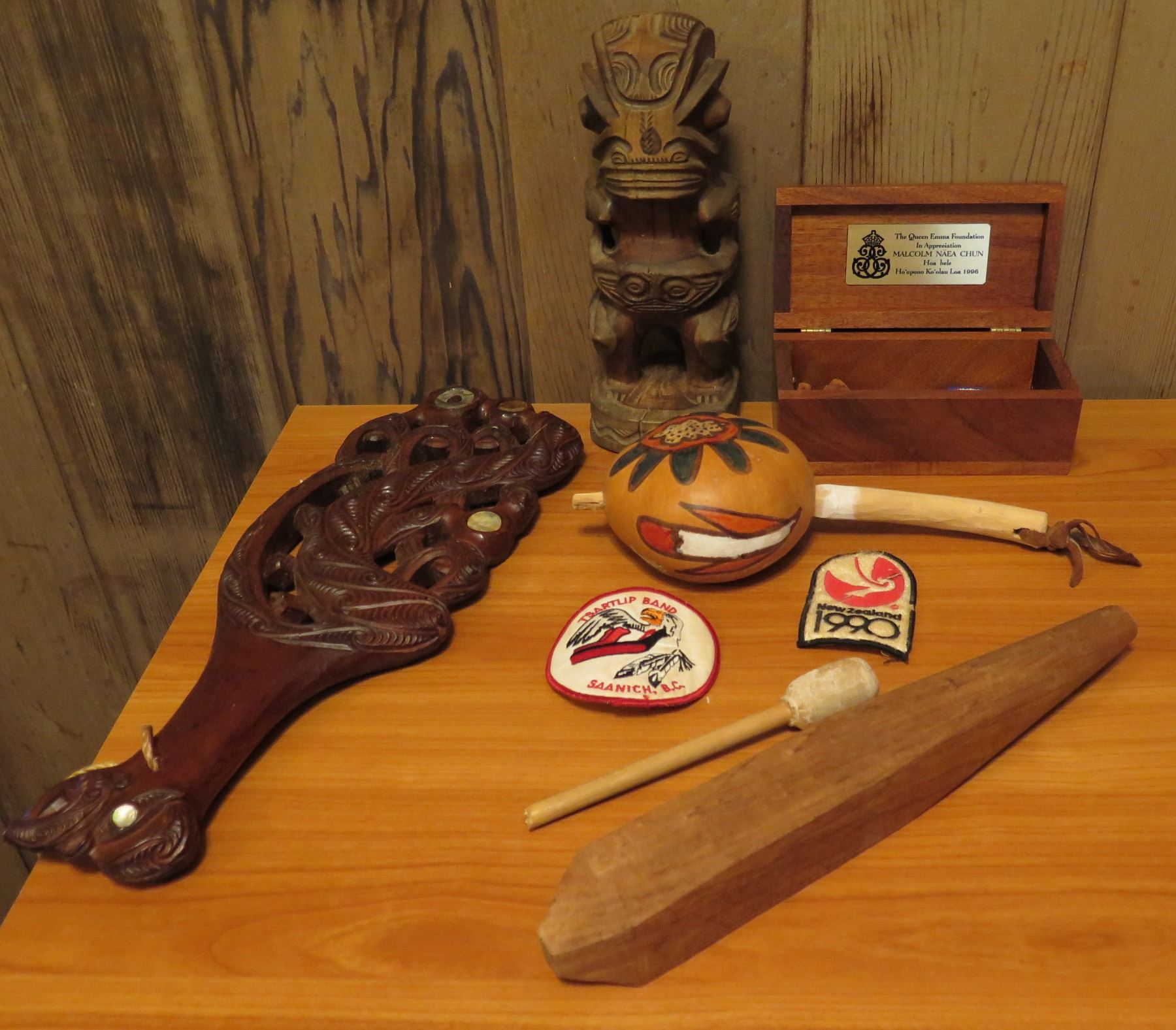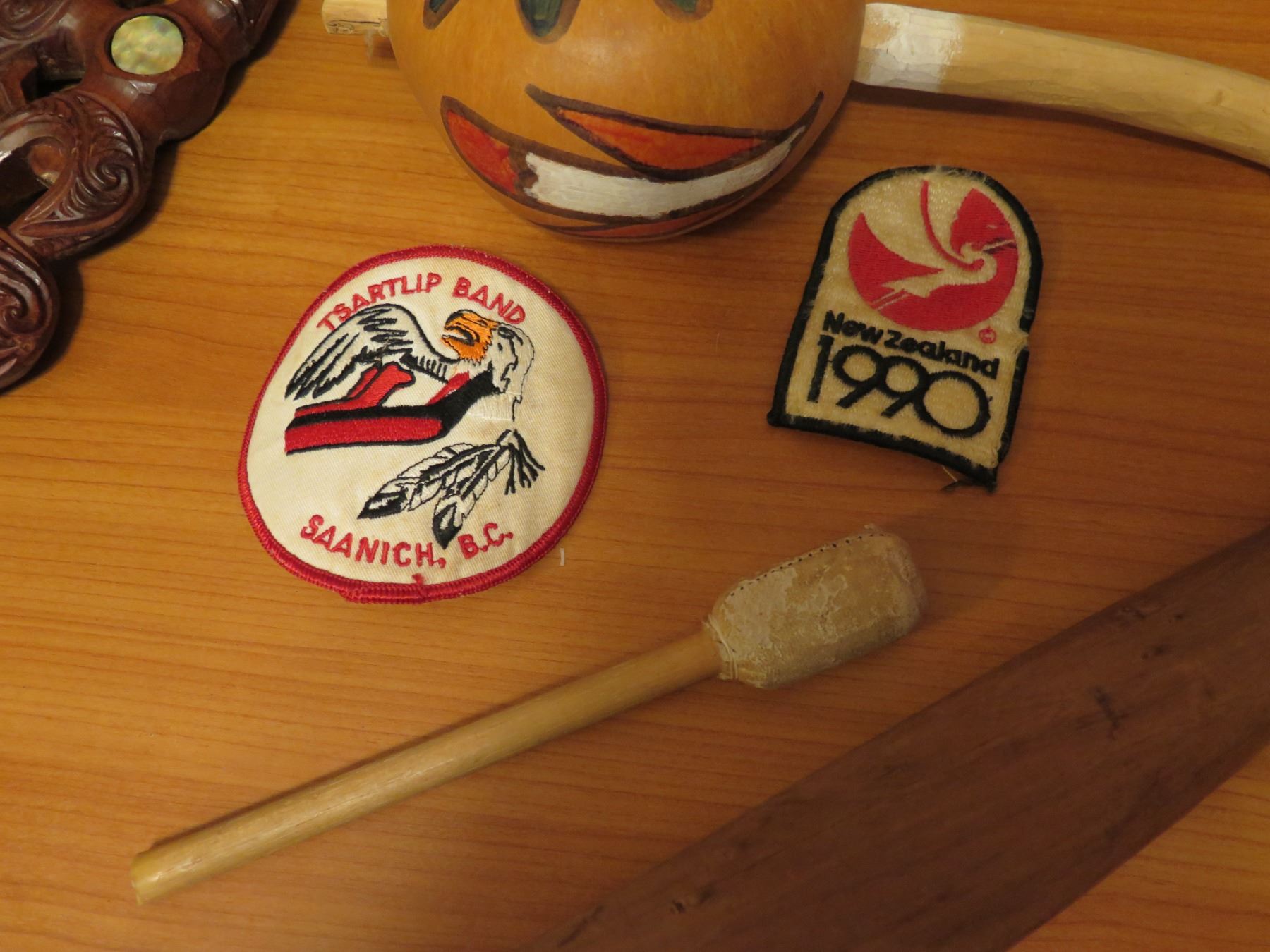 Qty 8 Misc Items, Wooden Carved Club, Tiki, Wooden Box, Gourd Music Instrument, Patches