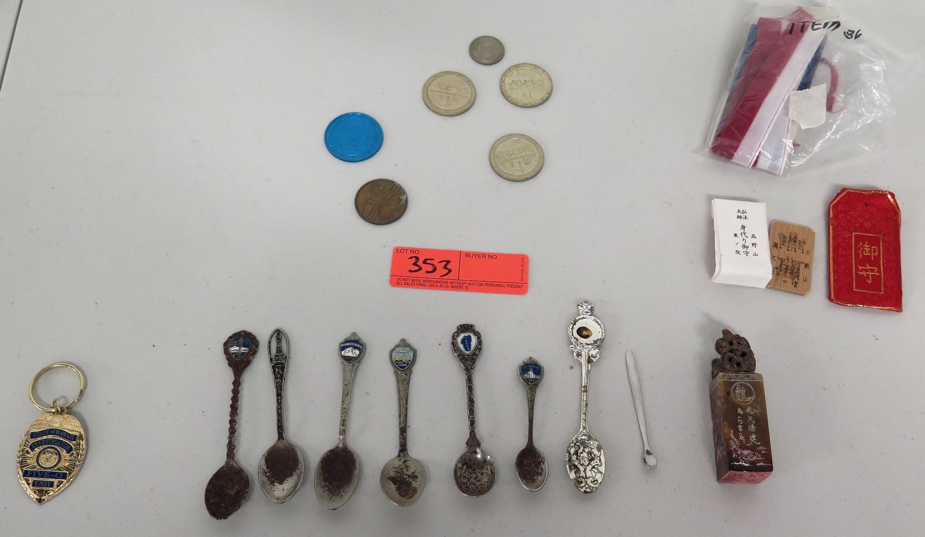 Qty 8 Souvenir Spoons, Hawaii 5-0 Key Chain, Misc Coins, etc