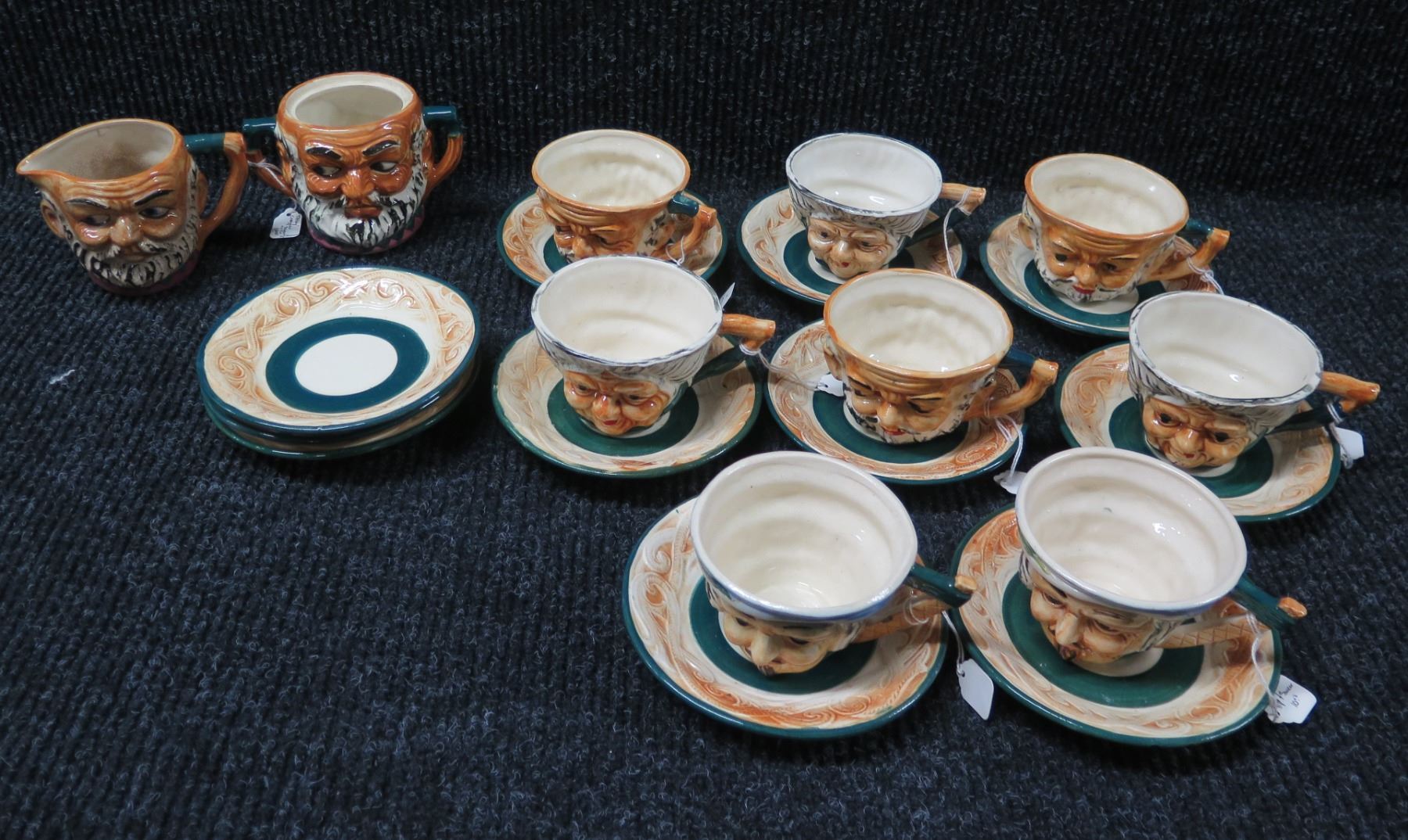 Qty 8 Tea Cups w/ Faces, 9 Saucers & Creamer w/ Sugar Bowl