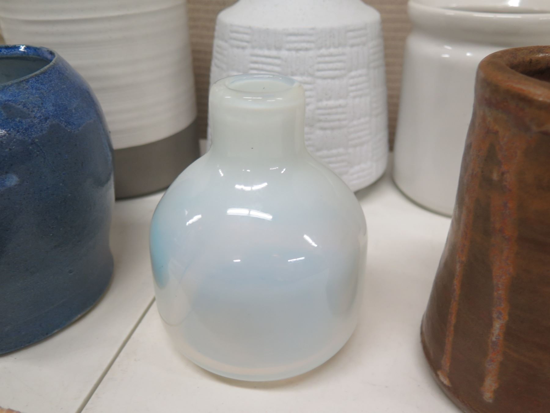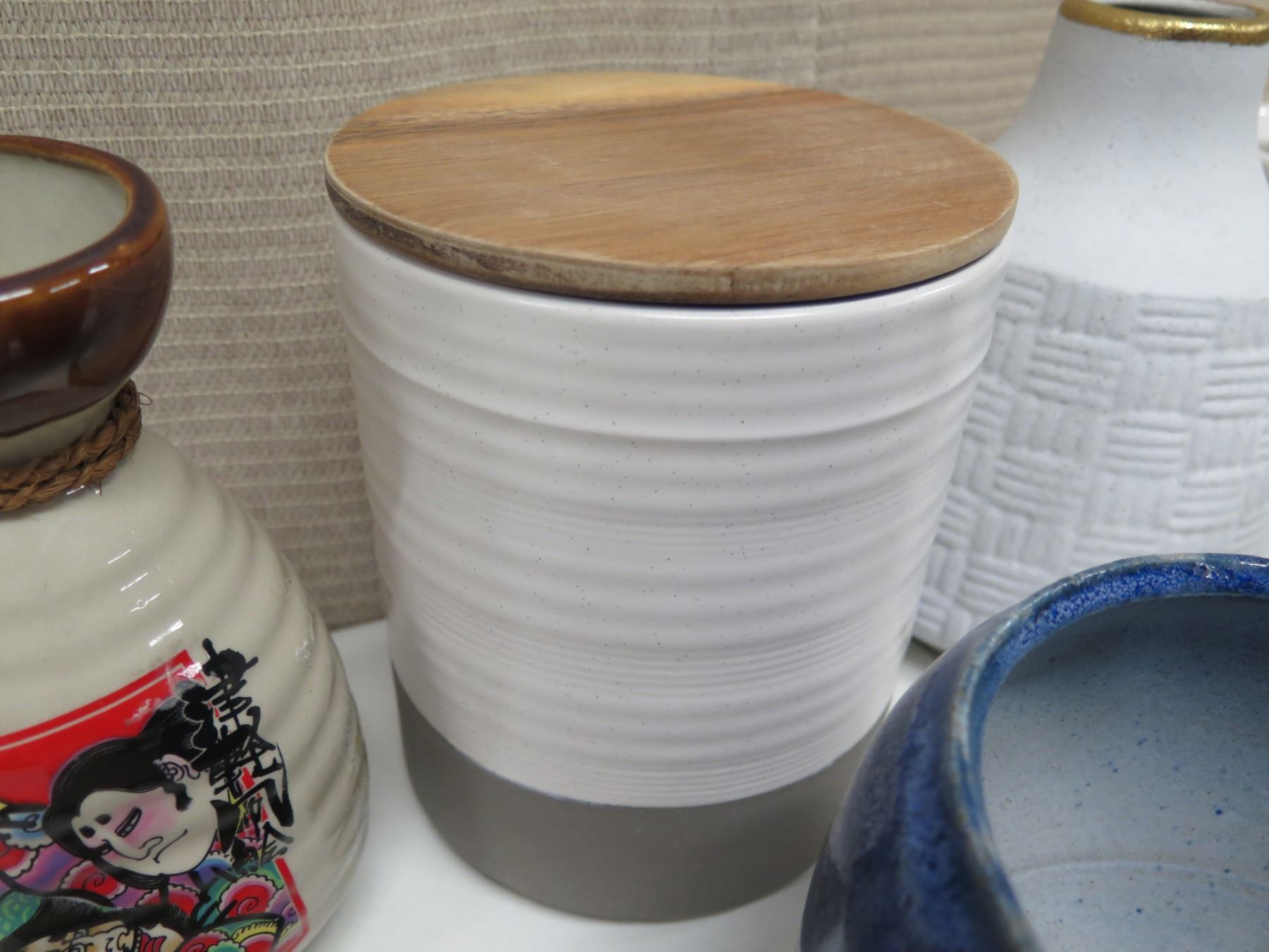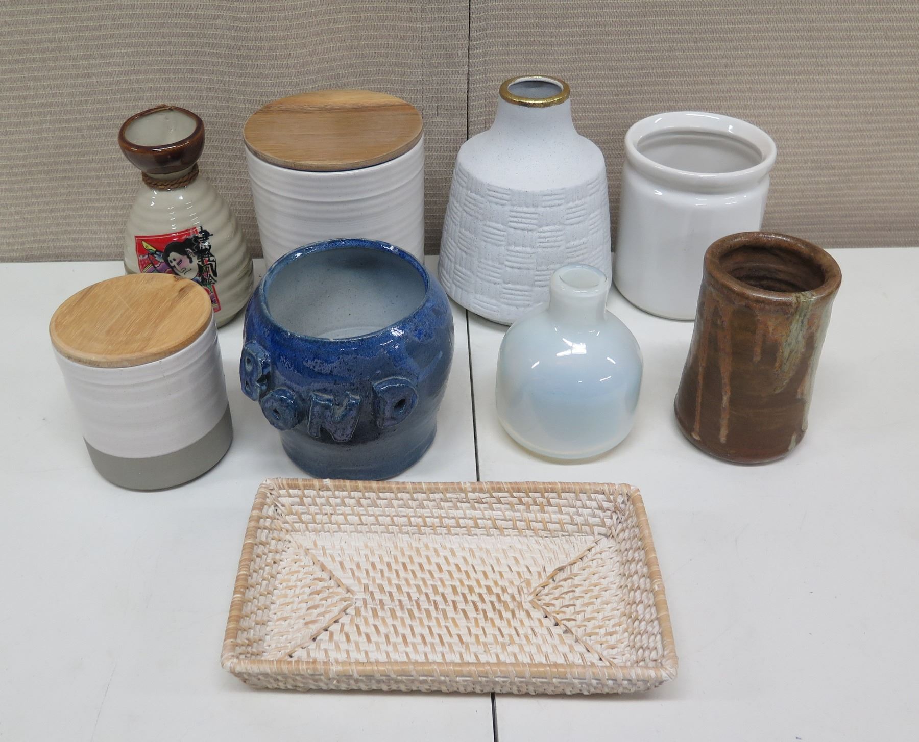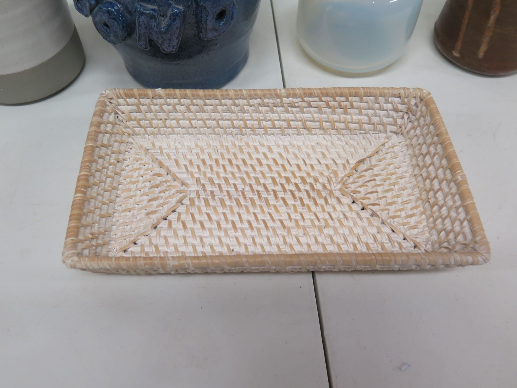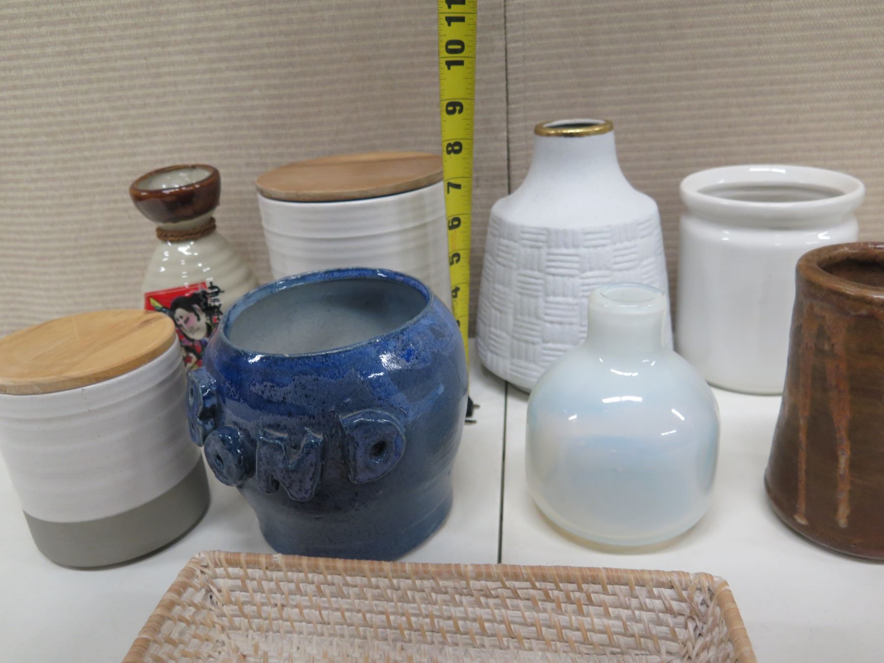 Qty 8 Vases & Decorative Containers Misc Sizes & Designs w/ Woven Tray