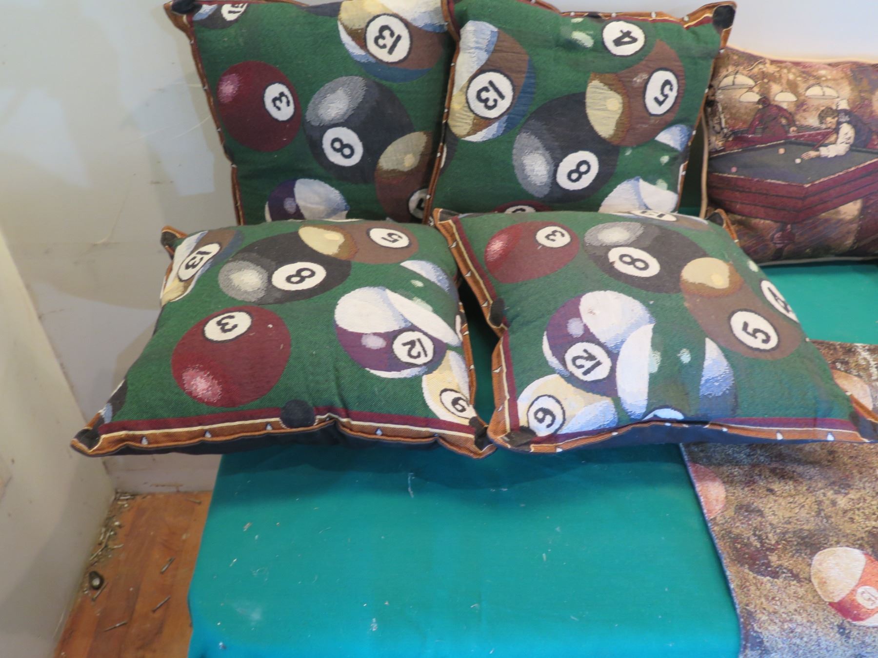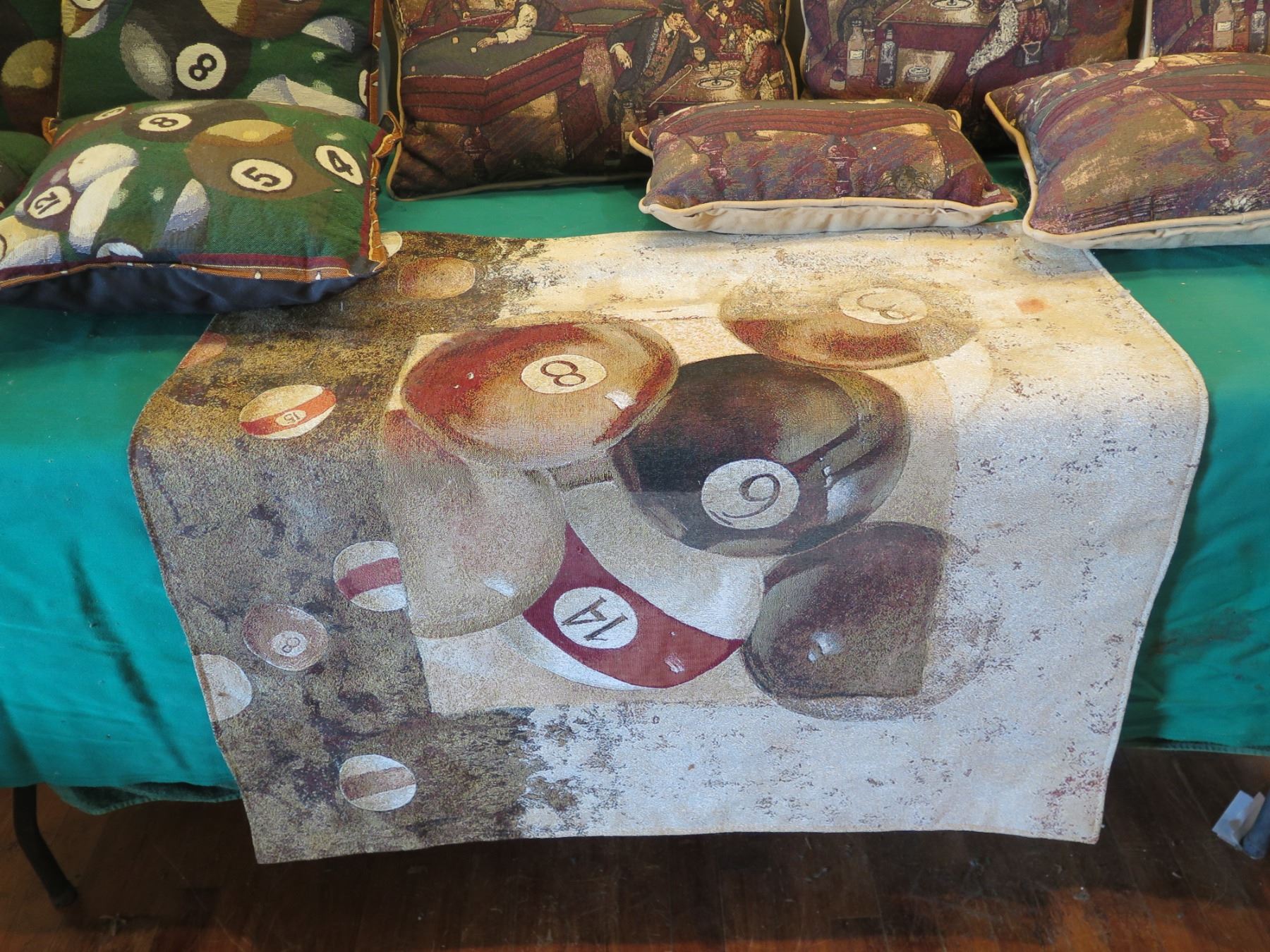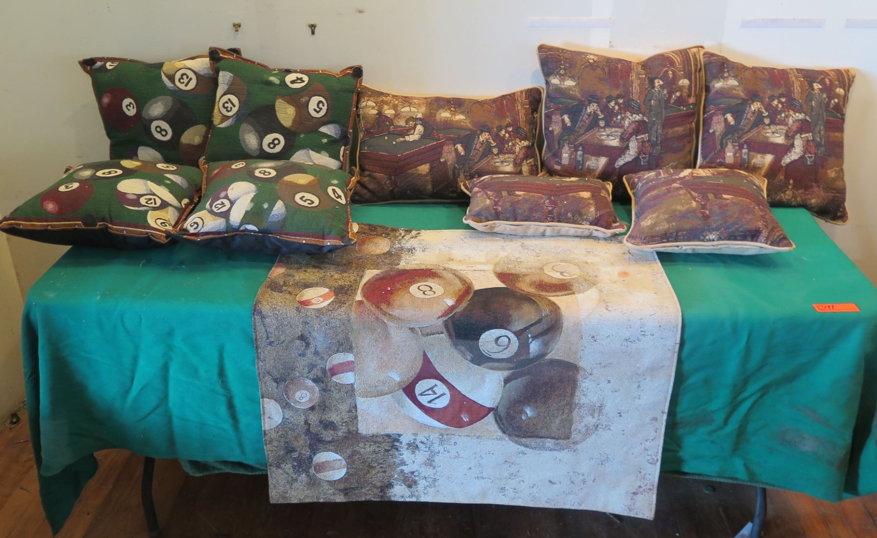 Qty 9 Billiards Pool Themed Throw Pillows & Cue Ball Rug Fine Art Tapestries