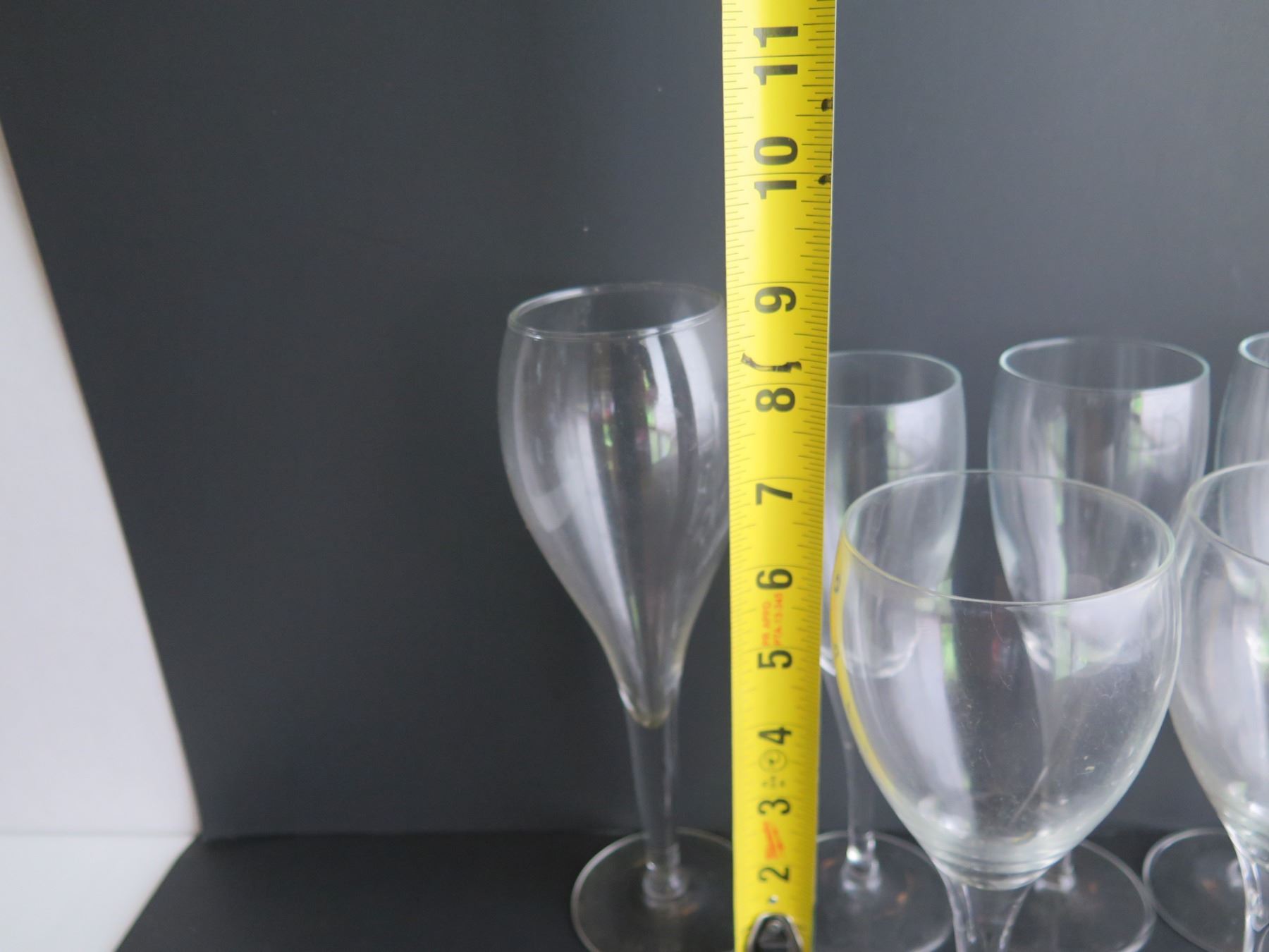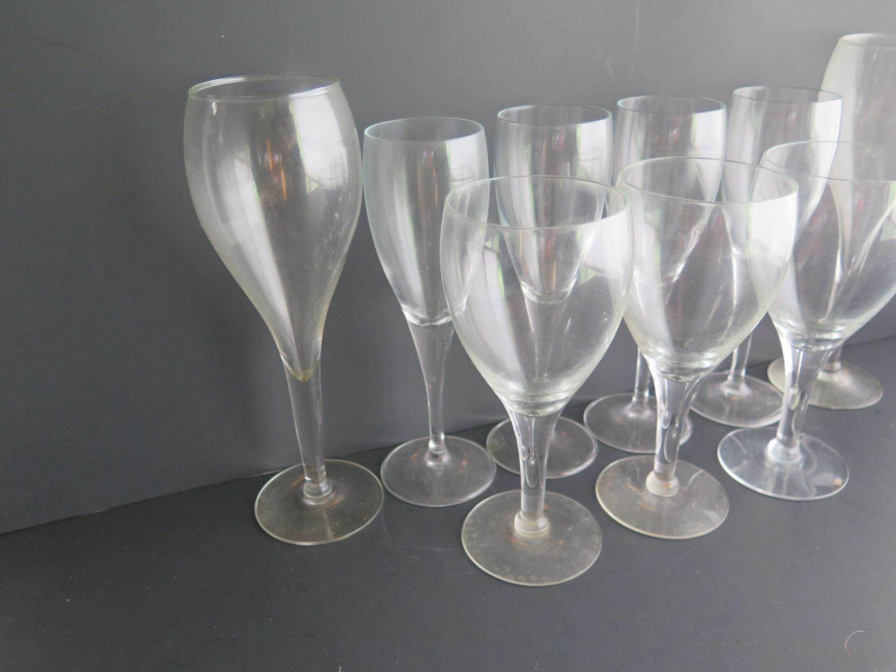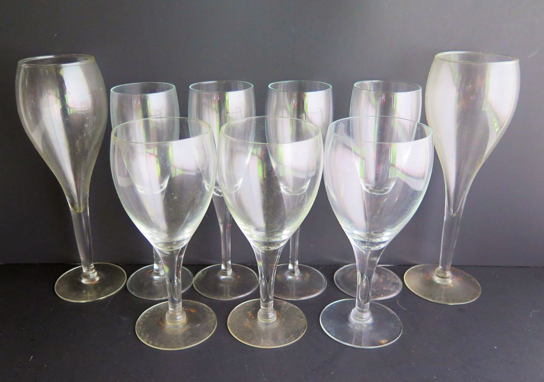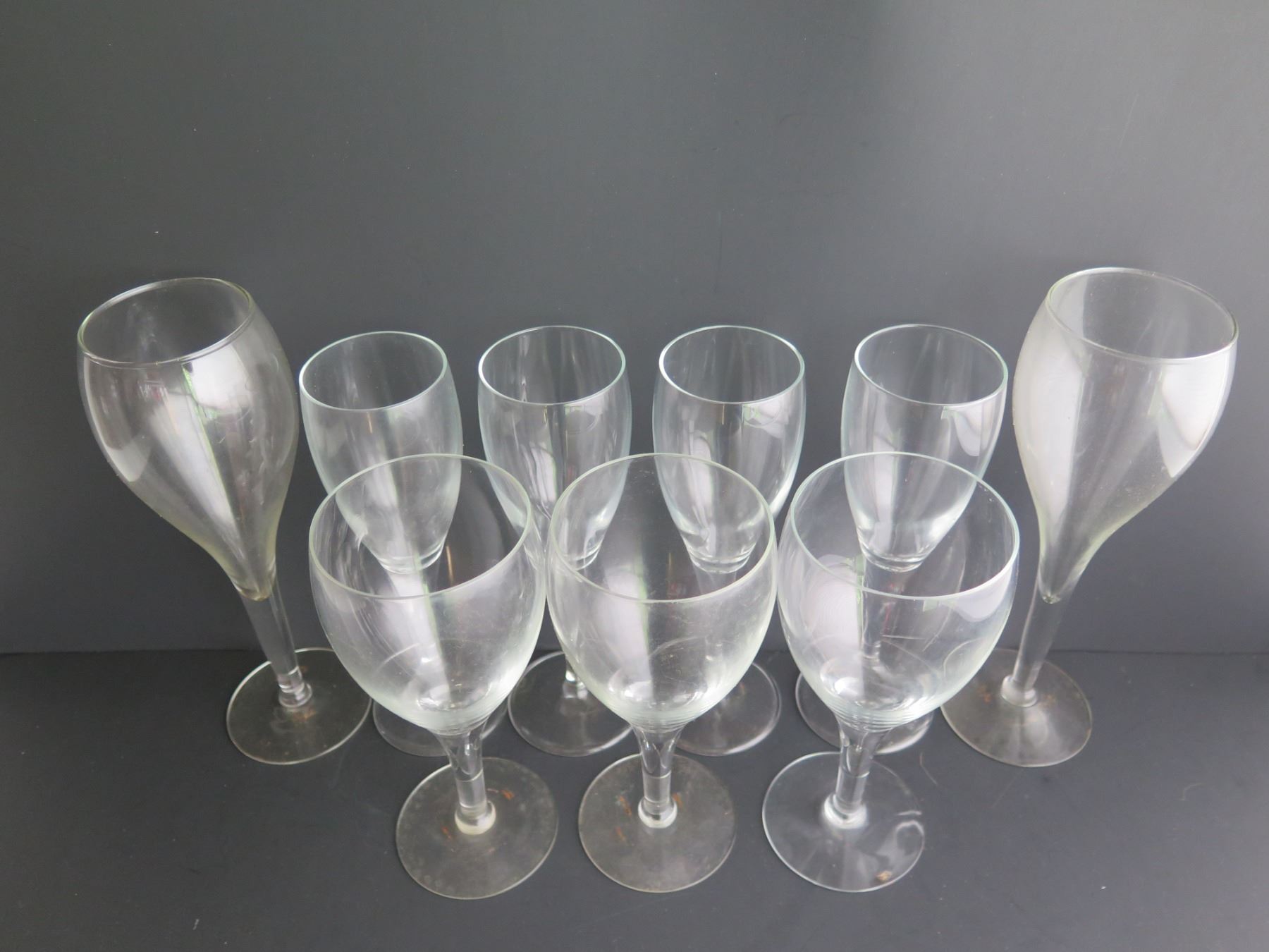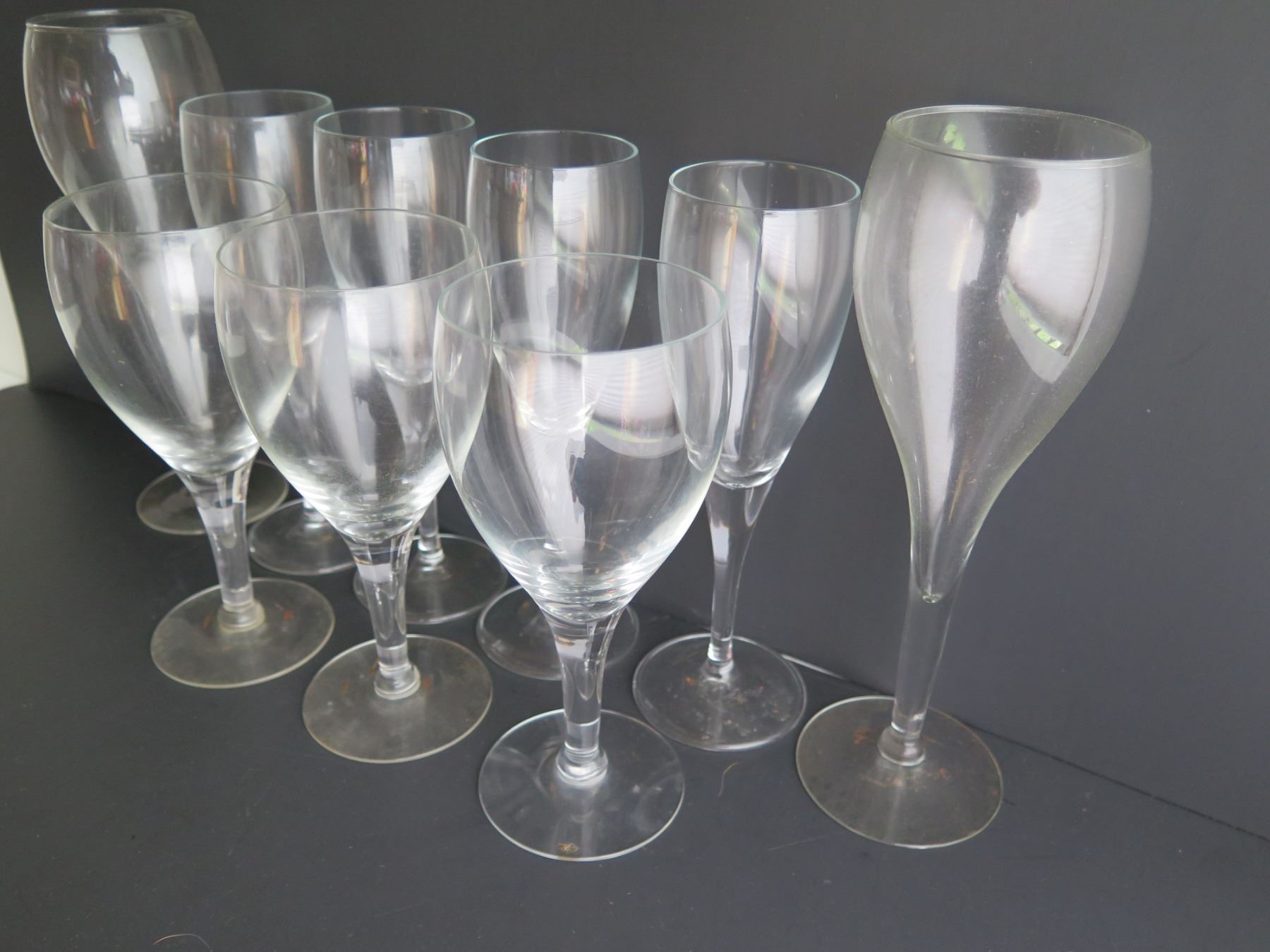 Qty 9 Clear Tulip Shaped Wine Glasses, Various Sizes