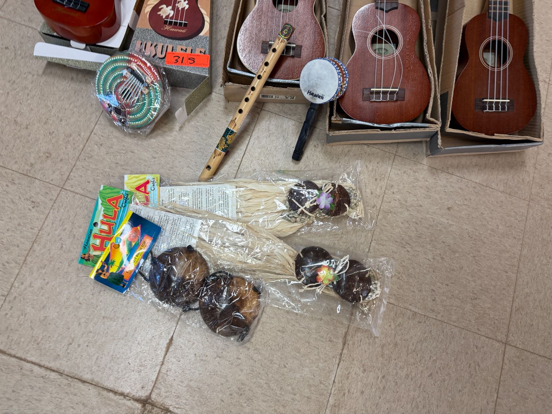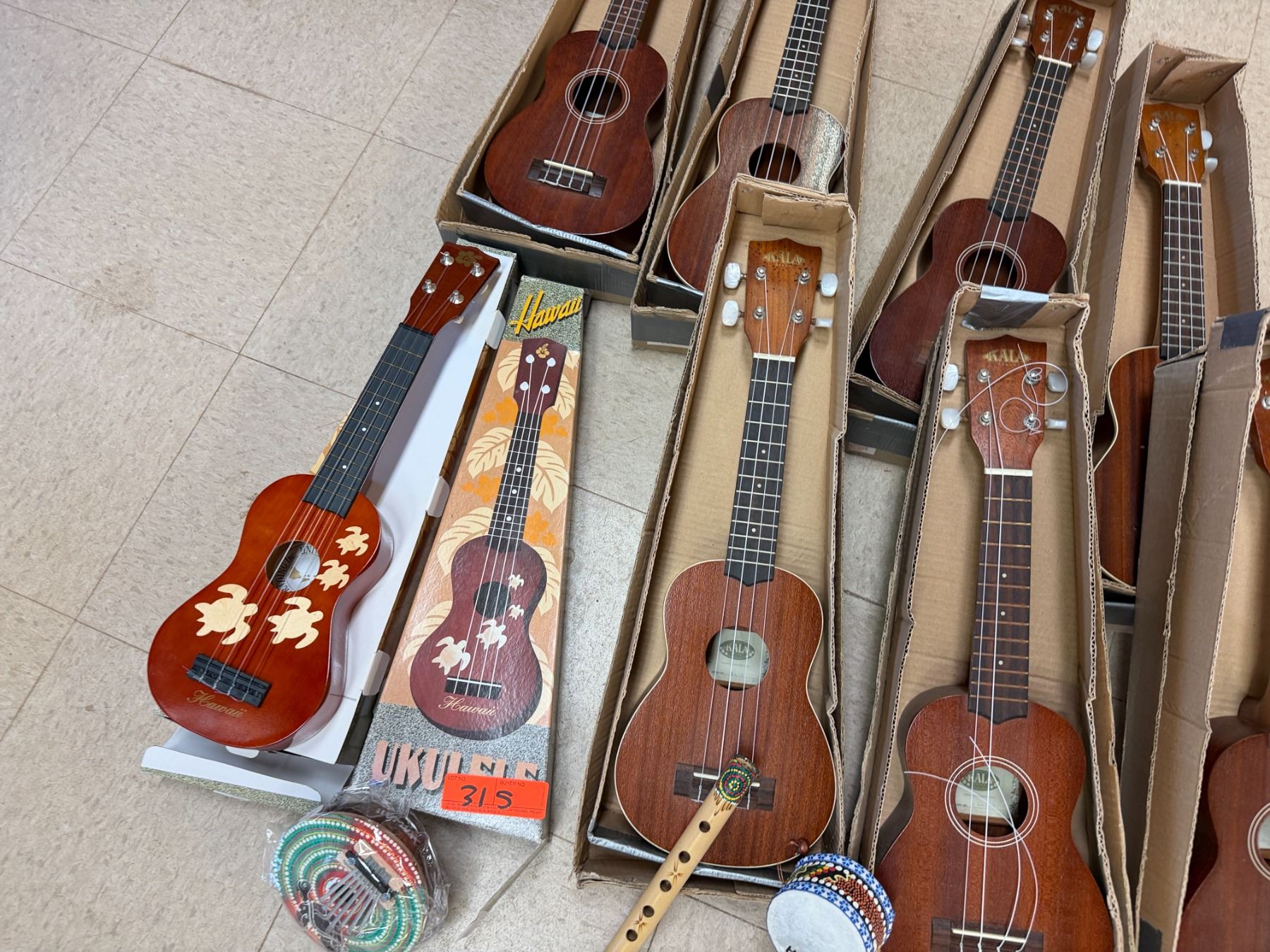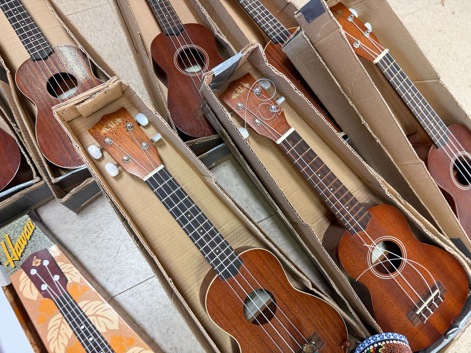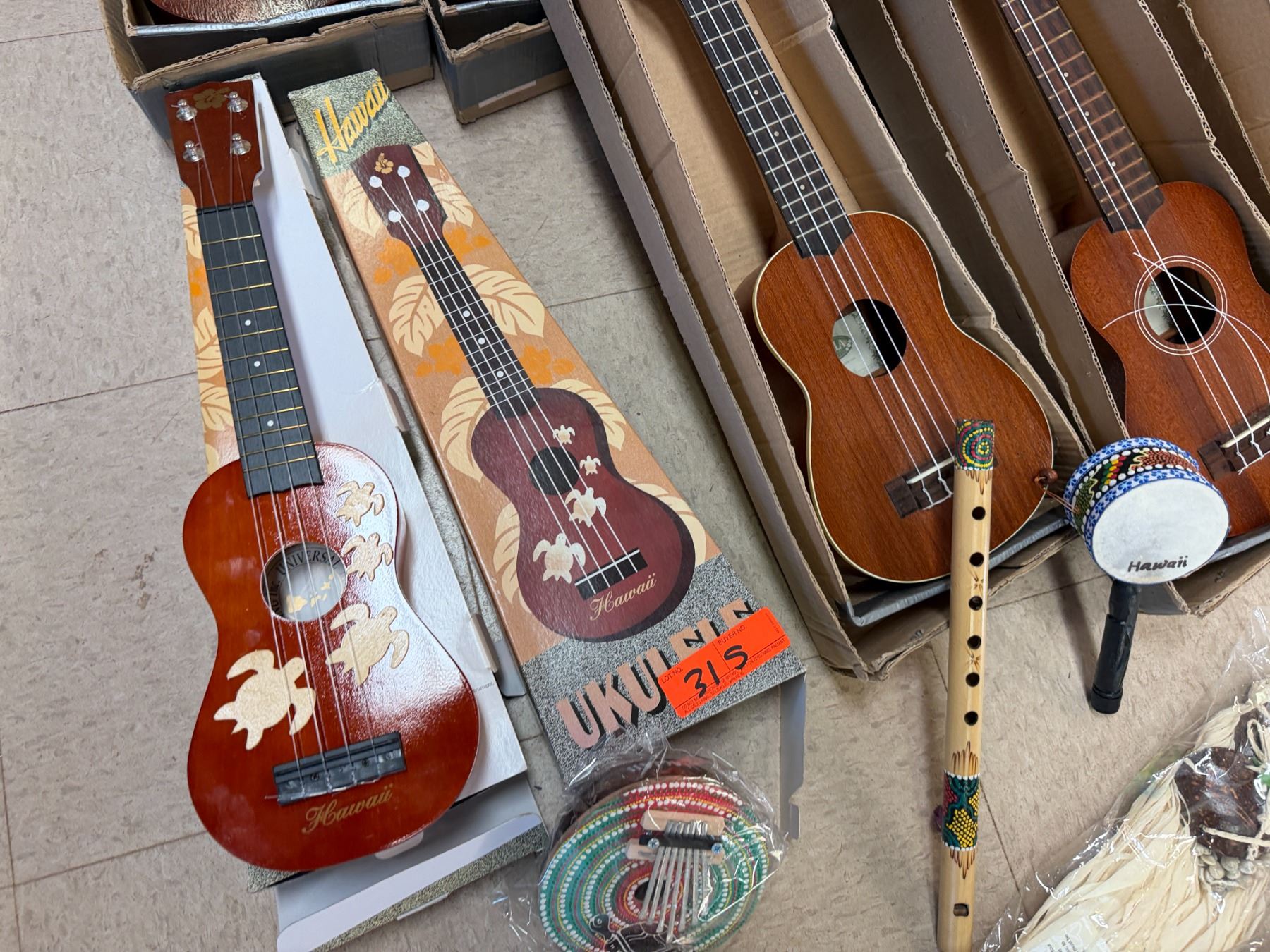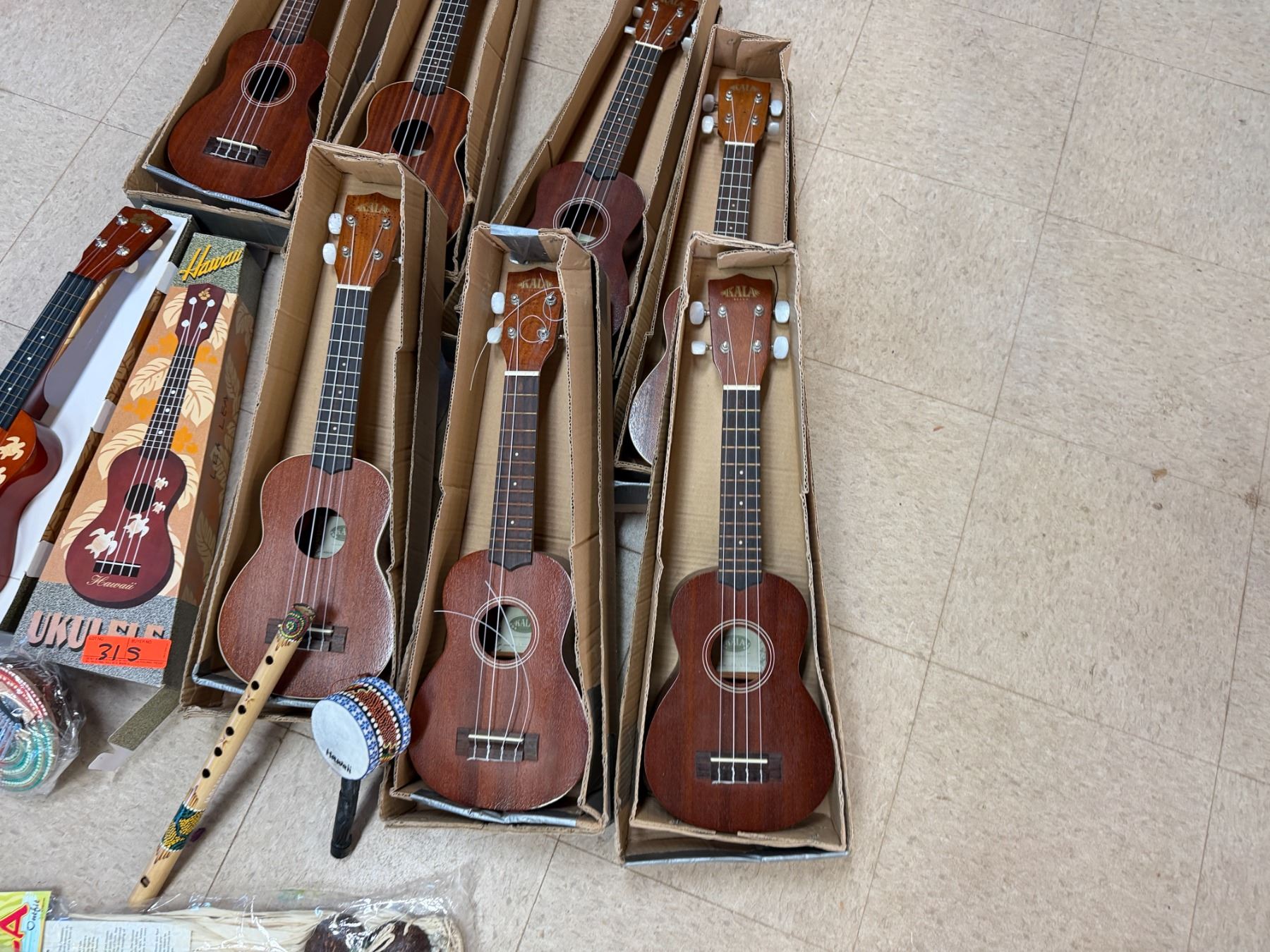Qty 9 Kala Hawaii Soprano Ukuleles, Grass Skirts w/ Coconut Bras, Misc Instruments, etc