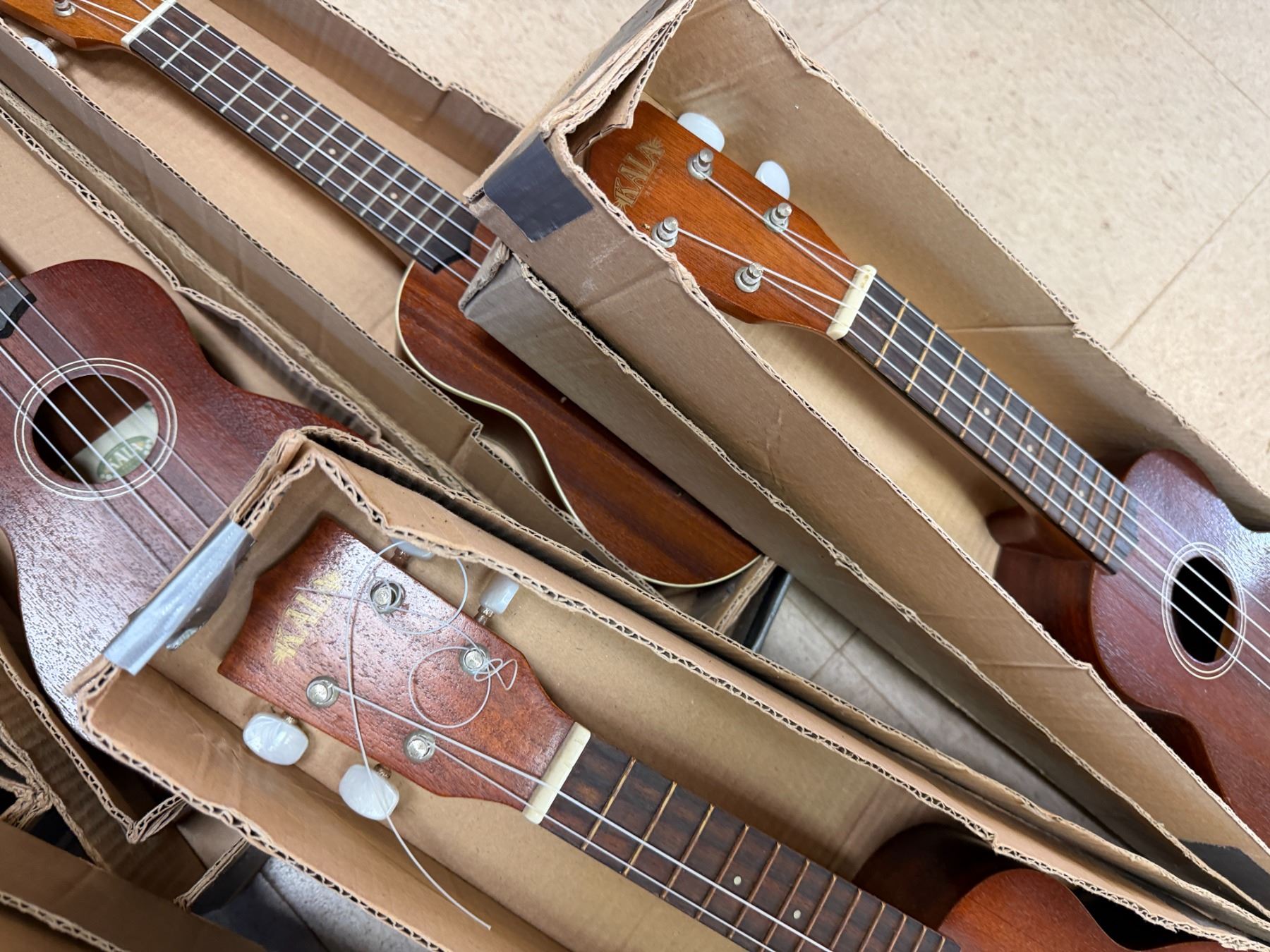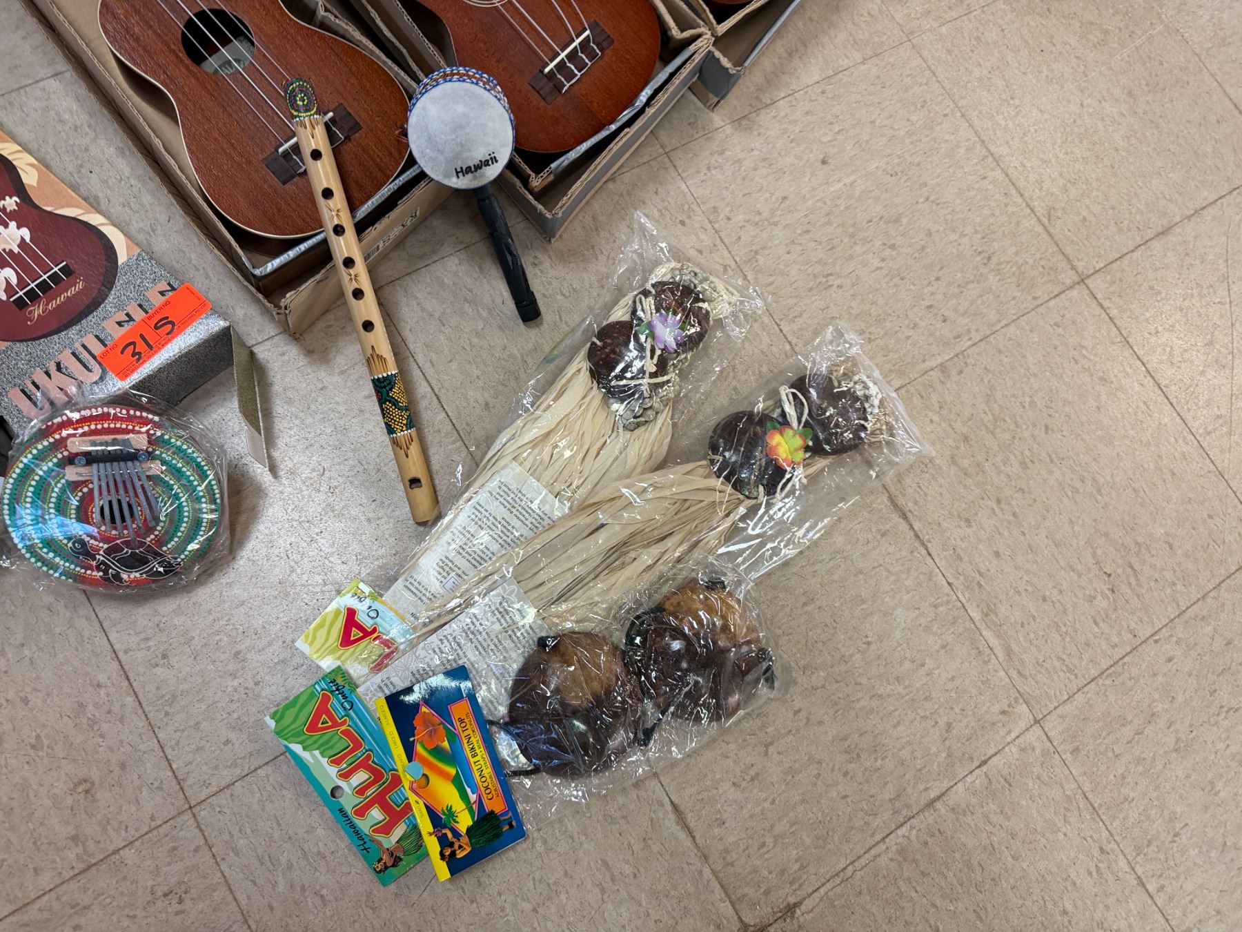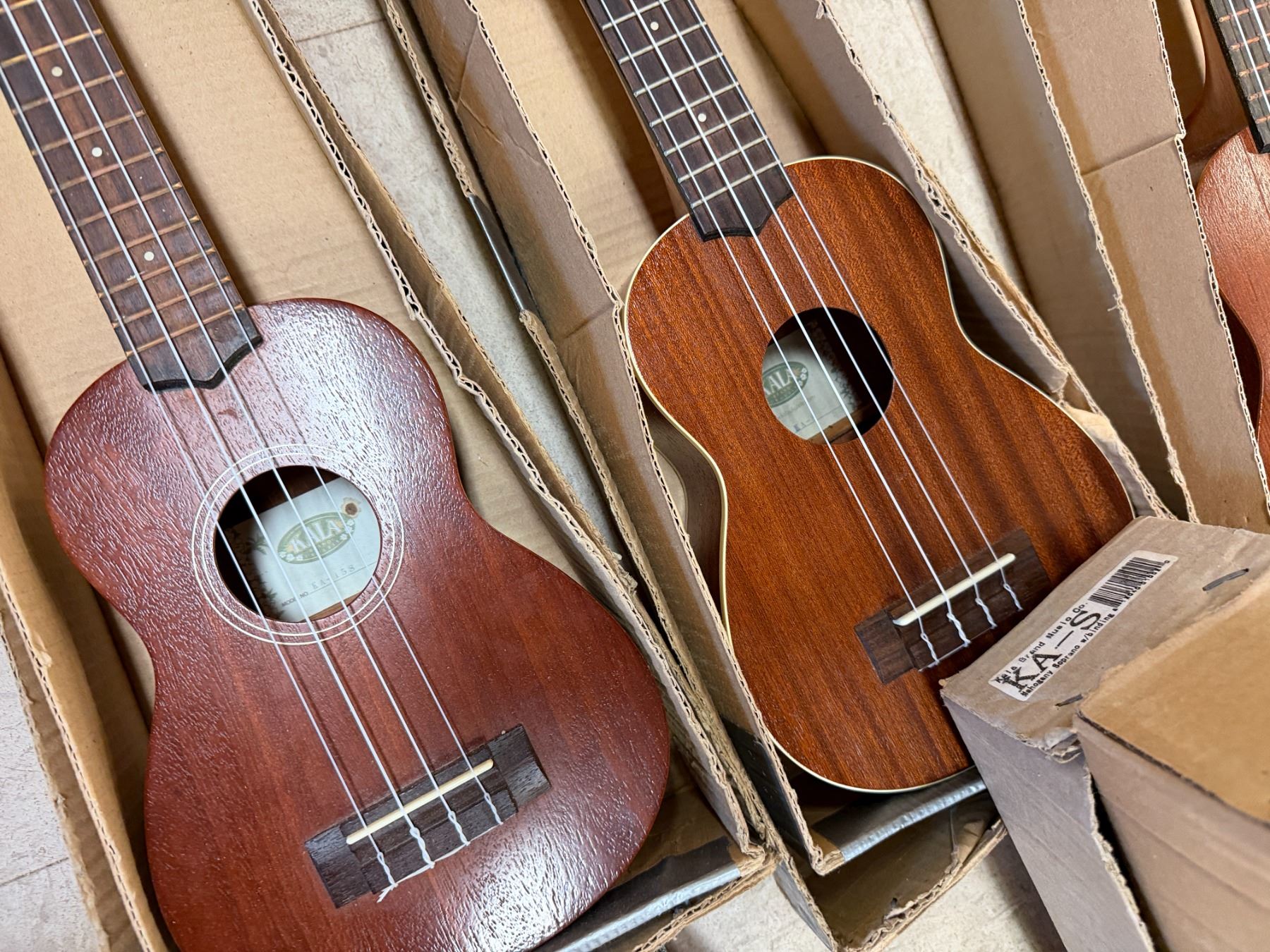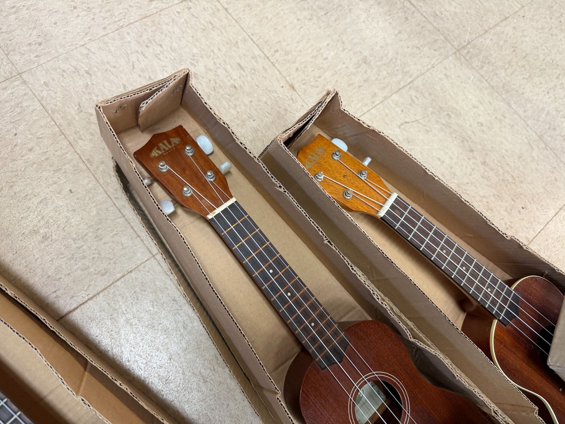 Qty 9 Kala Hawaii Soprano Ukuleles, Grass Skirts w/ Coconut Bras, Misc Instruments, etc