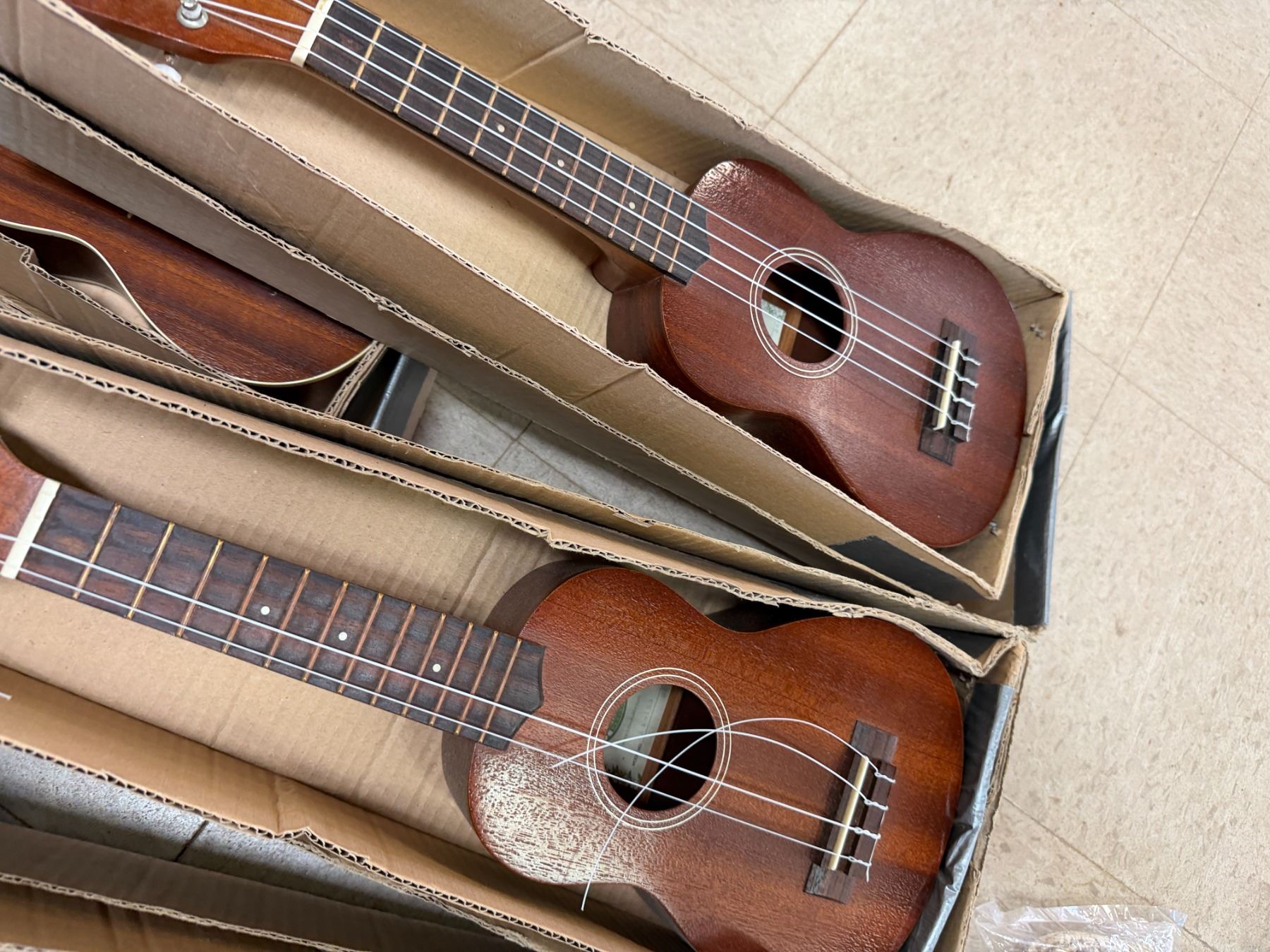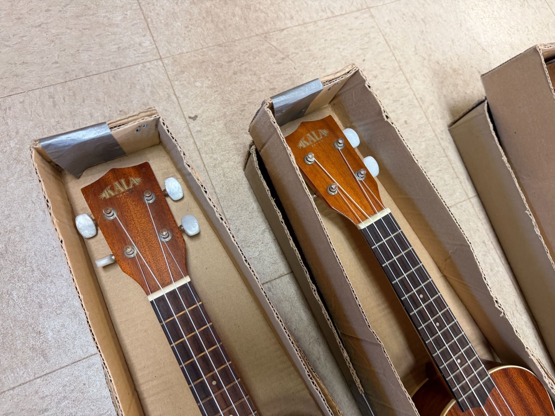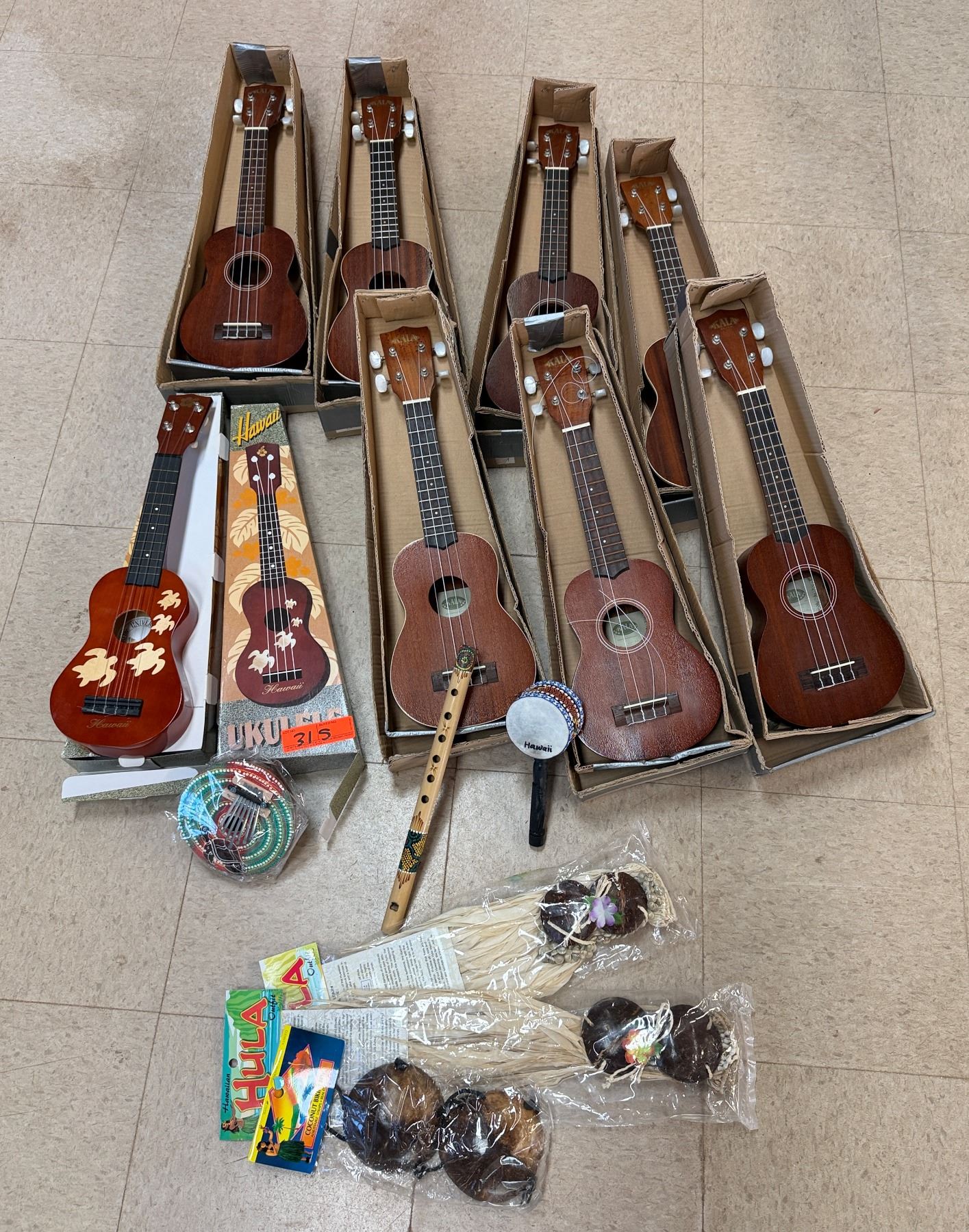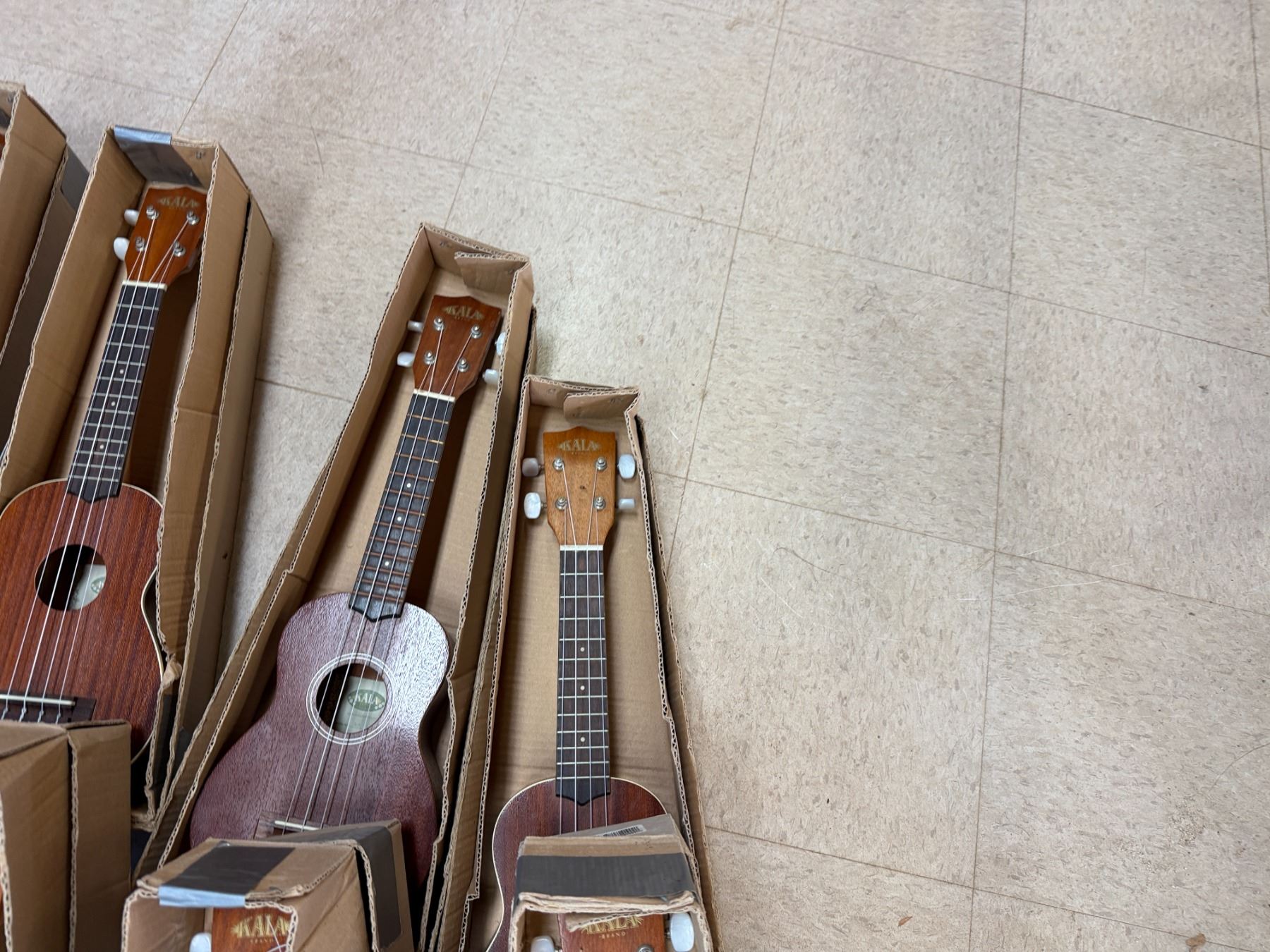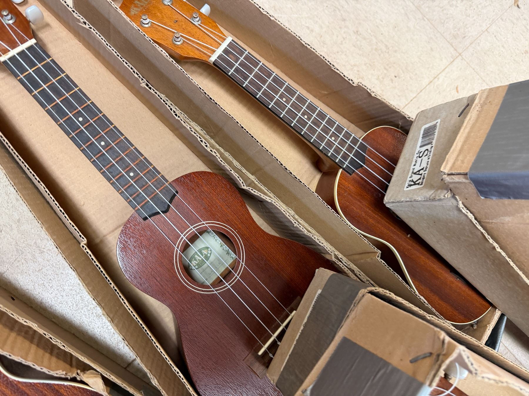 Qty 9 Kala Hawaii Soprano Ukuleles, Grass Skirts w/ Coconut Bras, Misc Instruments, etc