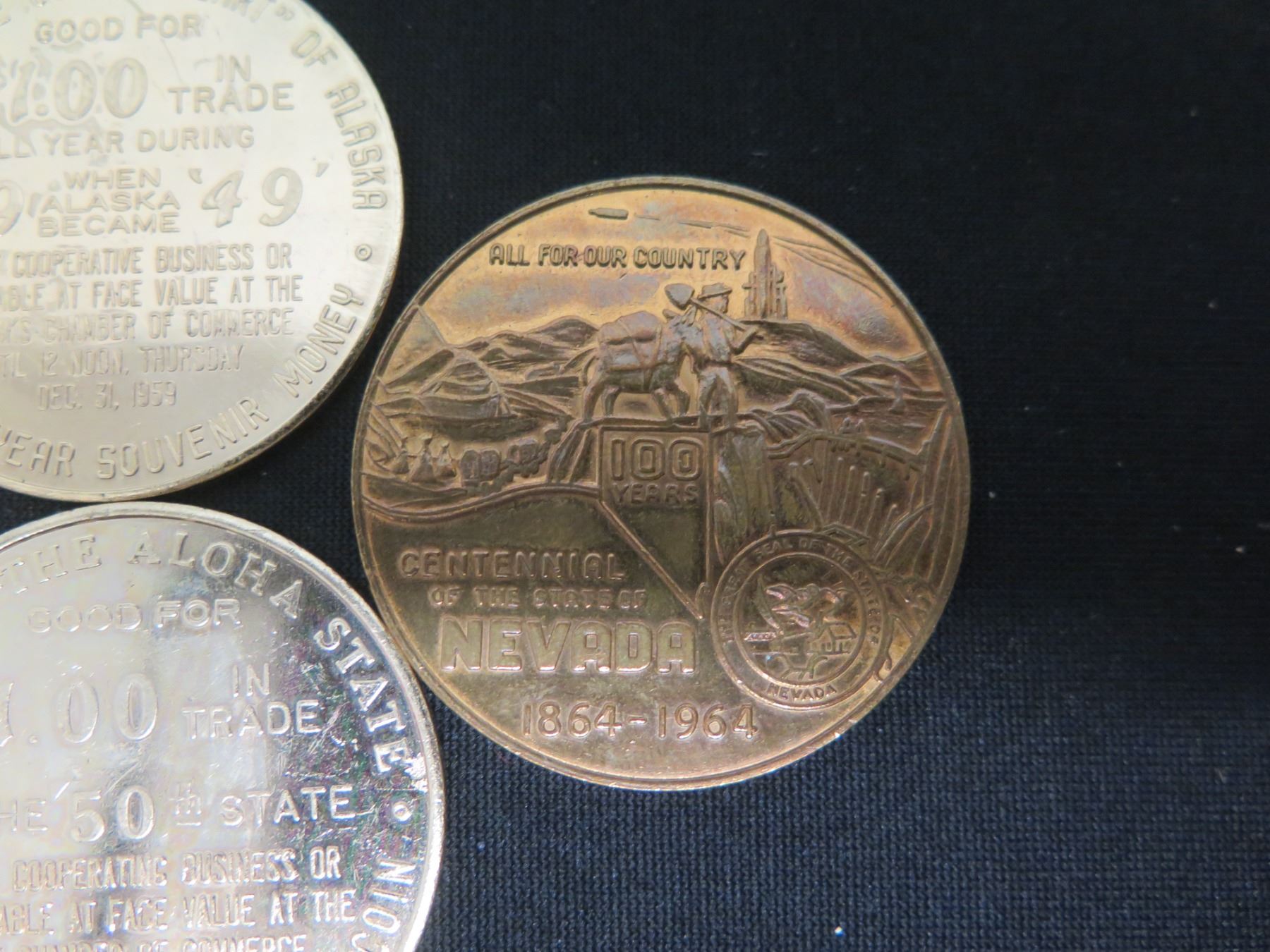 Qty 9 Medallion & Coins: Grand Imperial Hotel, Alaska 49th State, Japanese Surrender Treaty, etc