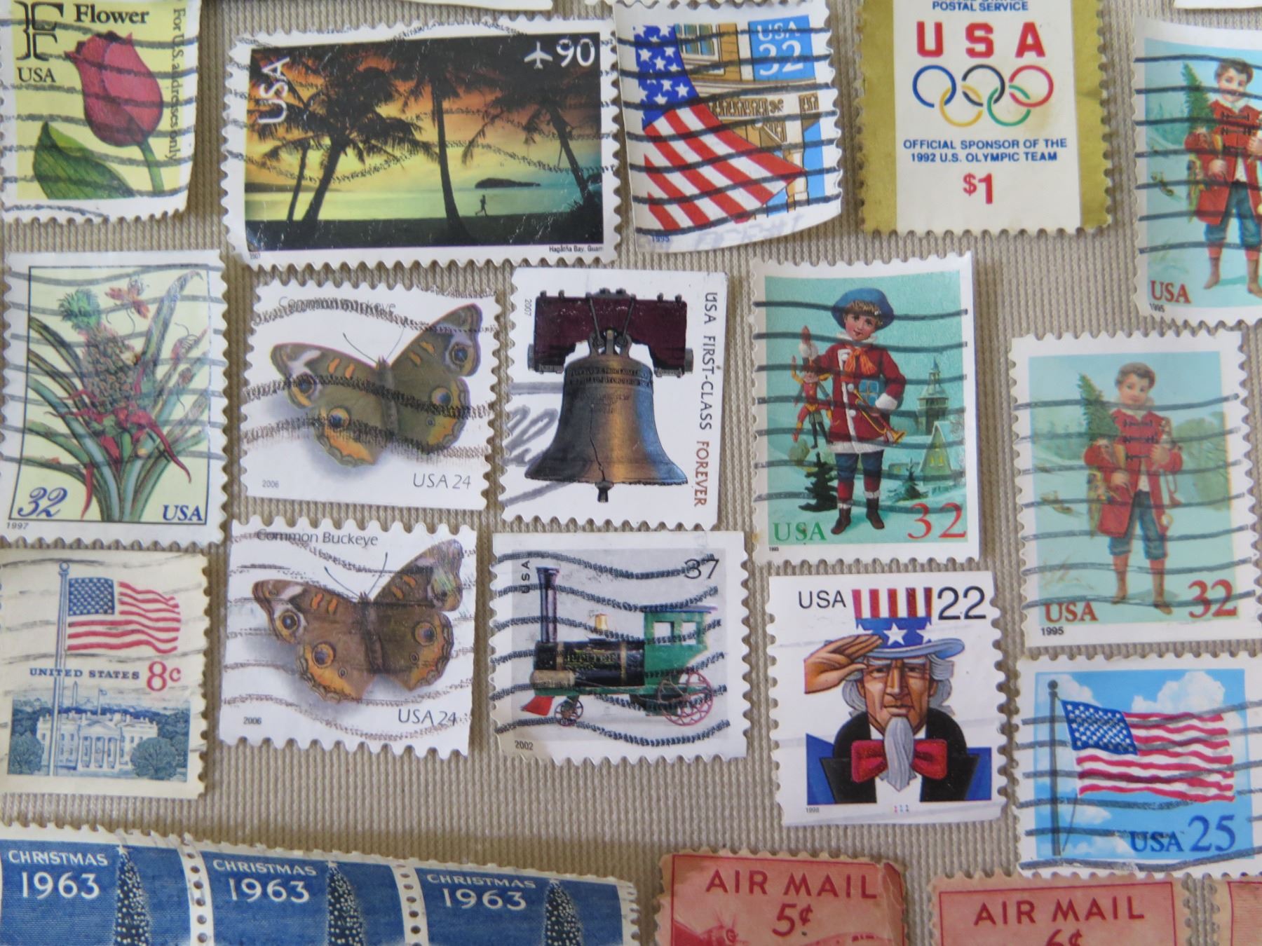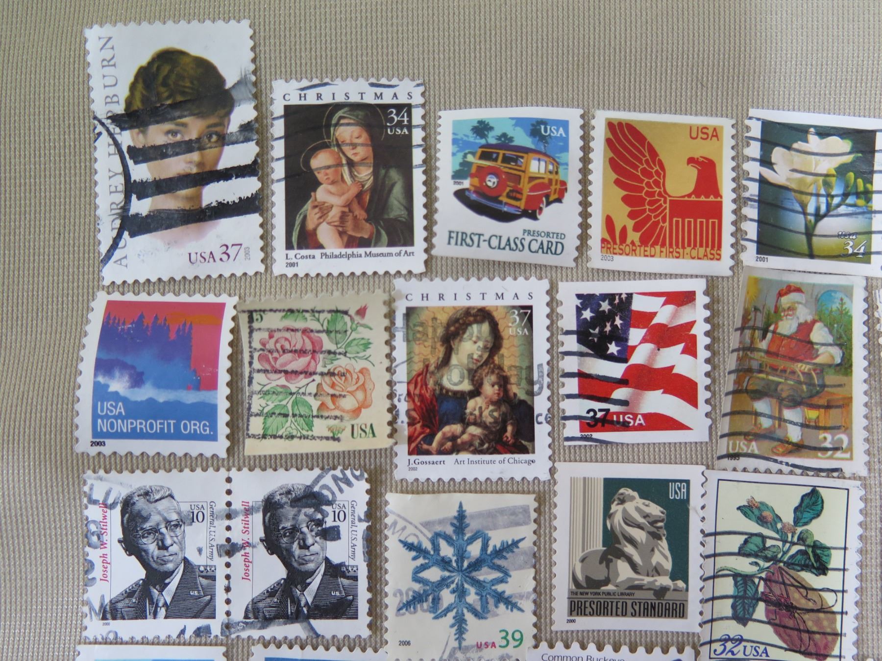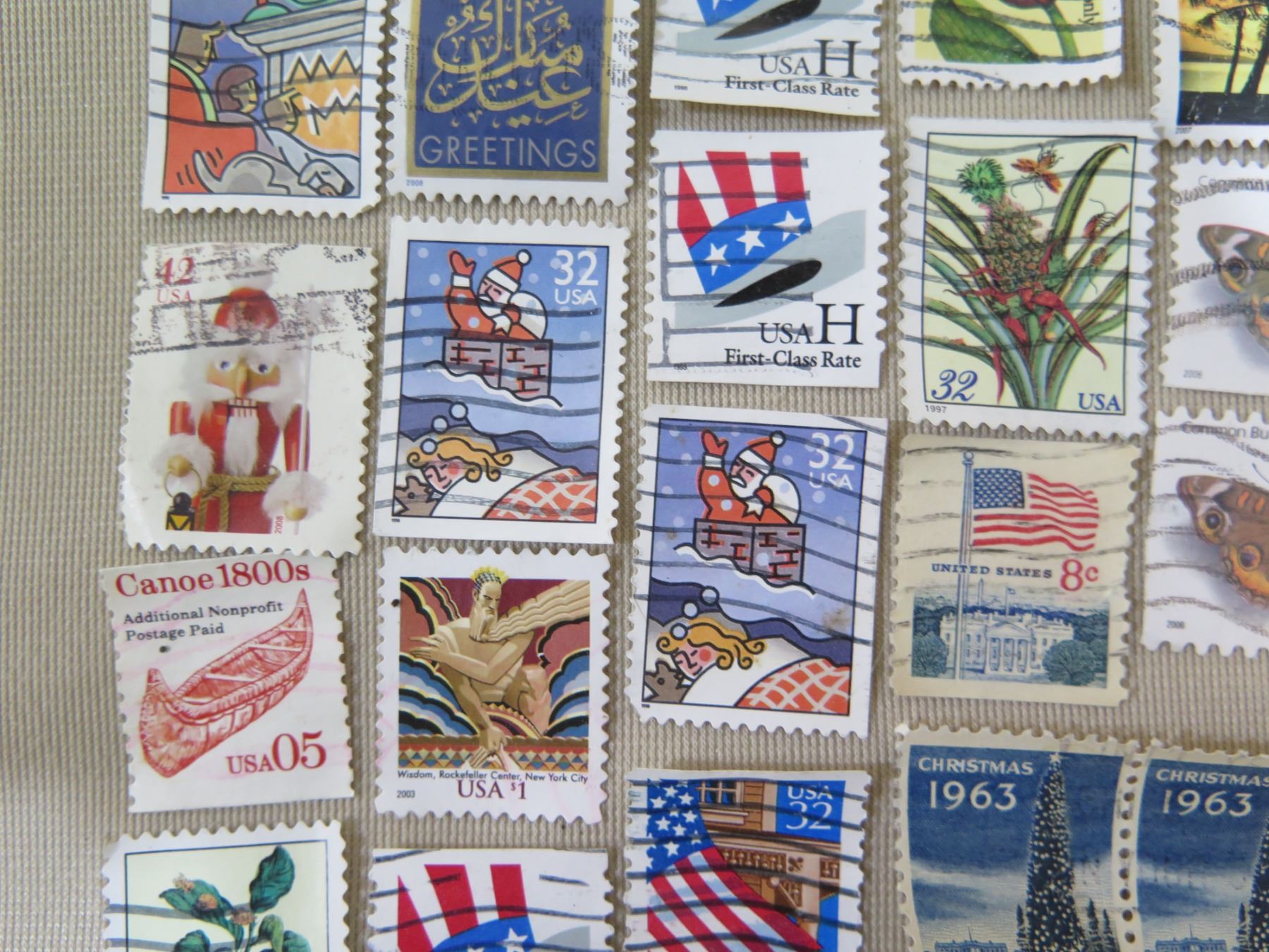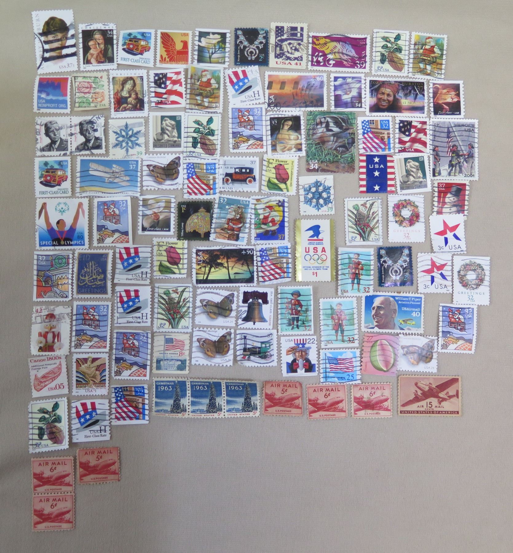 Qty 90+ USA Stamps: Audrey Hepburn, Christmas, Olympics, Canoes, Airplanes, etc