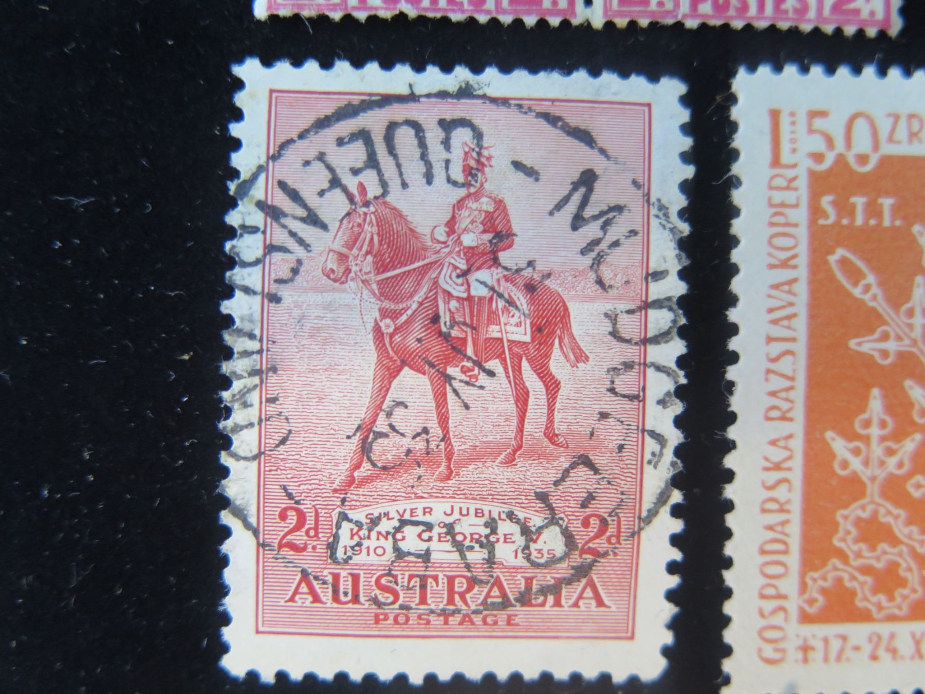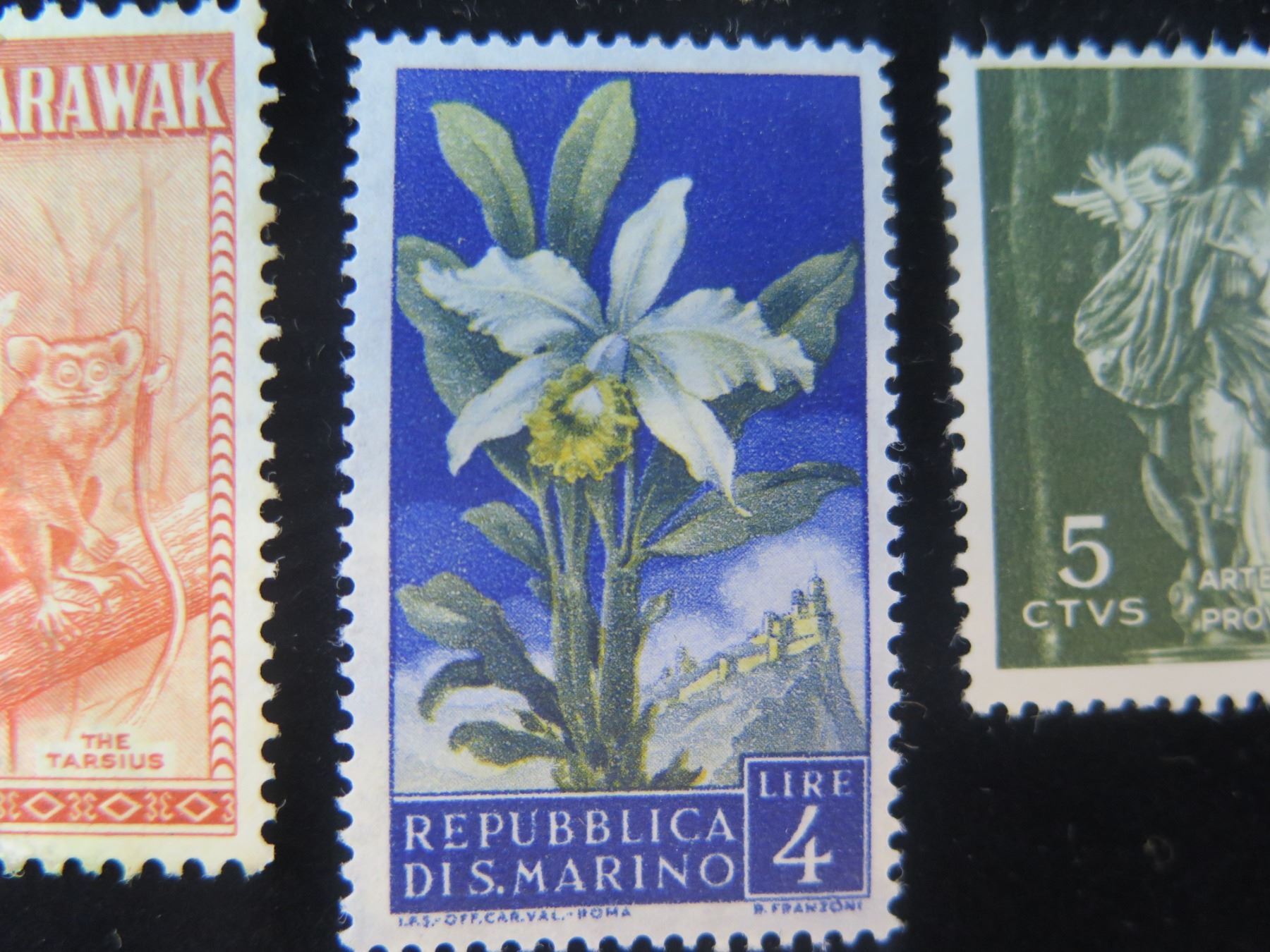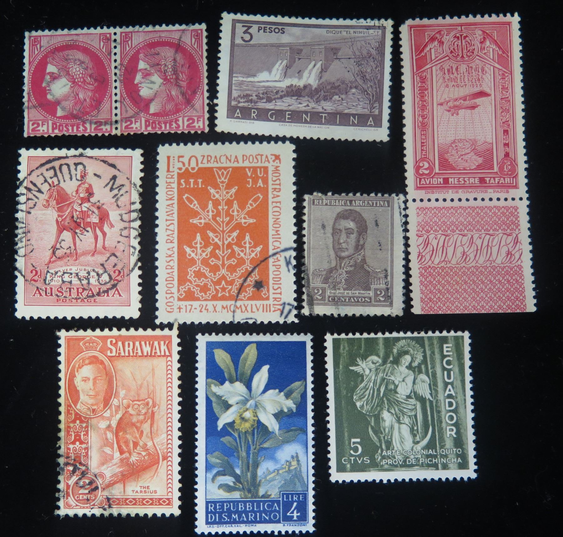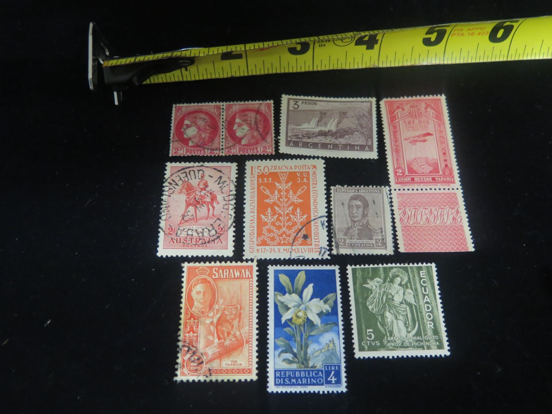 Qty Approx. 11 Collectible Stamps: Argentina, Australia, Ecuador, San Marino, Sarawak, etc