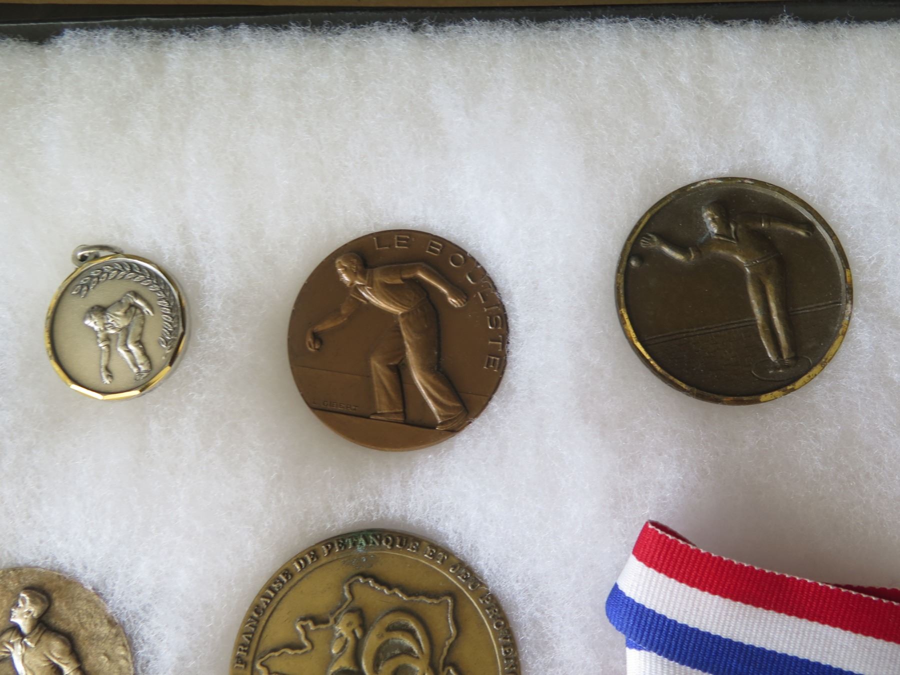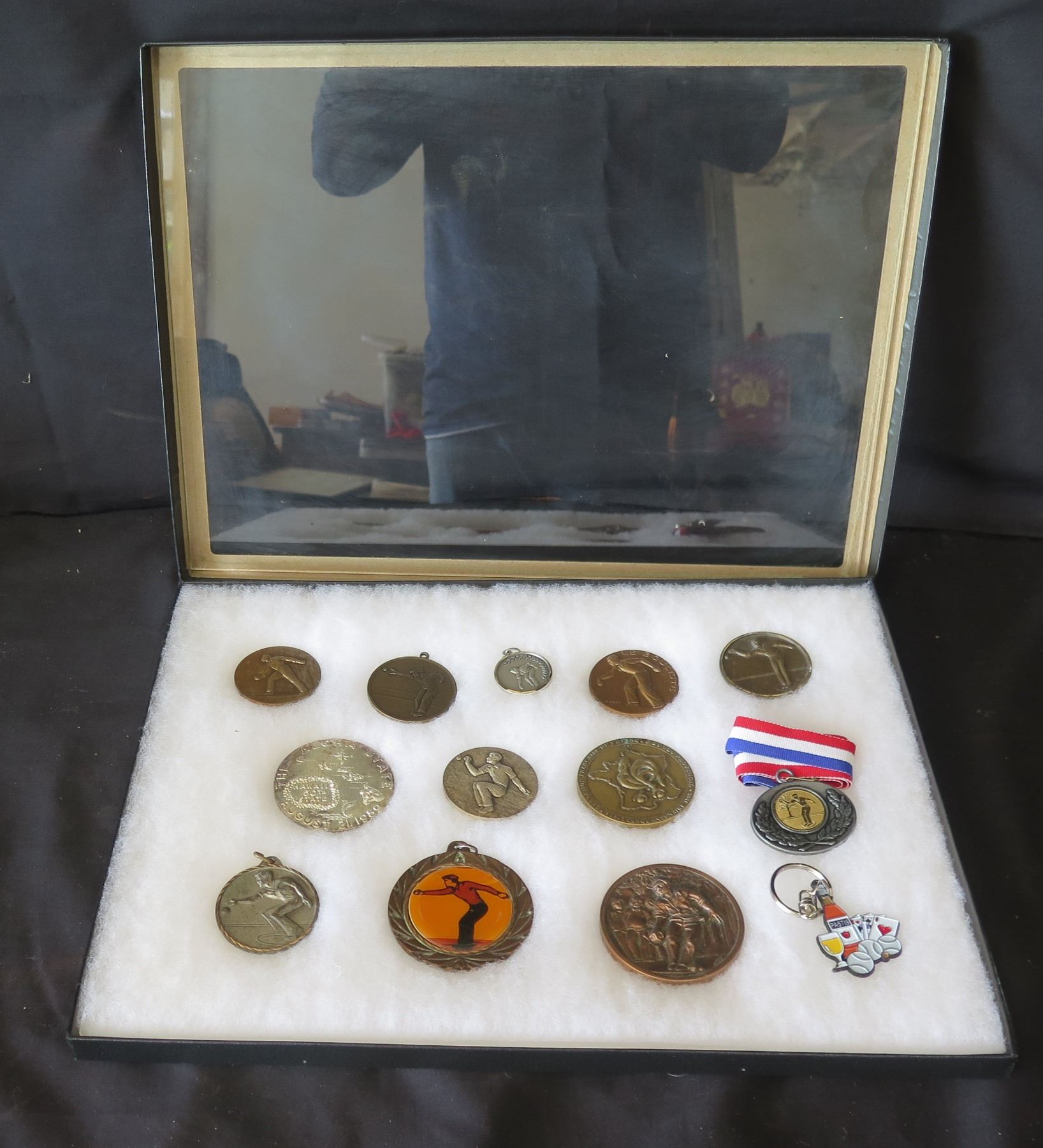 Qty Approx. 13 Medals & Coins: Athletes, Corvelle, Aloha State, etc in Display Case 16"L
