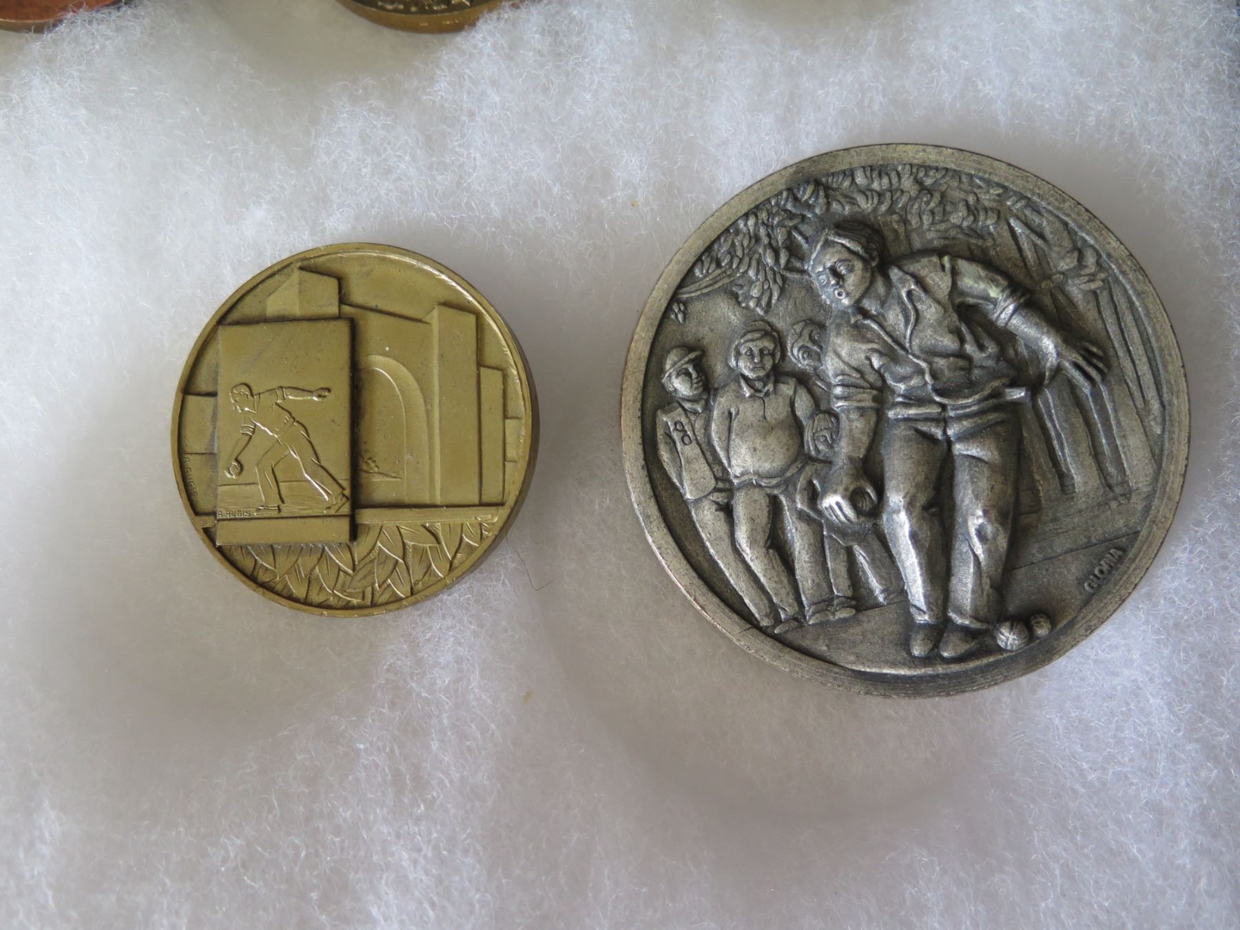 Qty Approx. 15 Medals & Coins: Athletes, Counsel National de la Resistance, etc in Display Case 16"L
