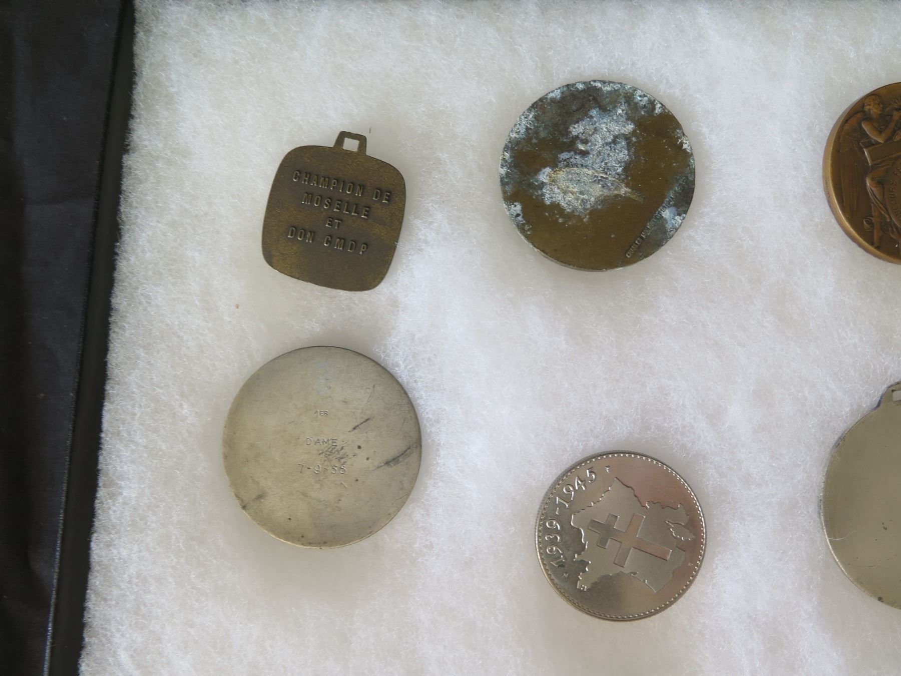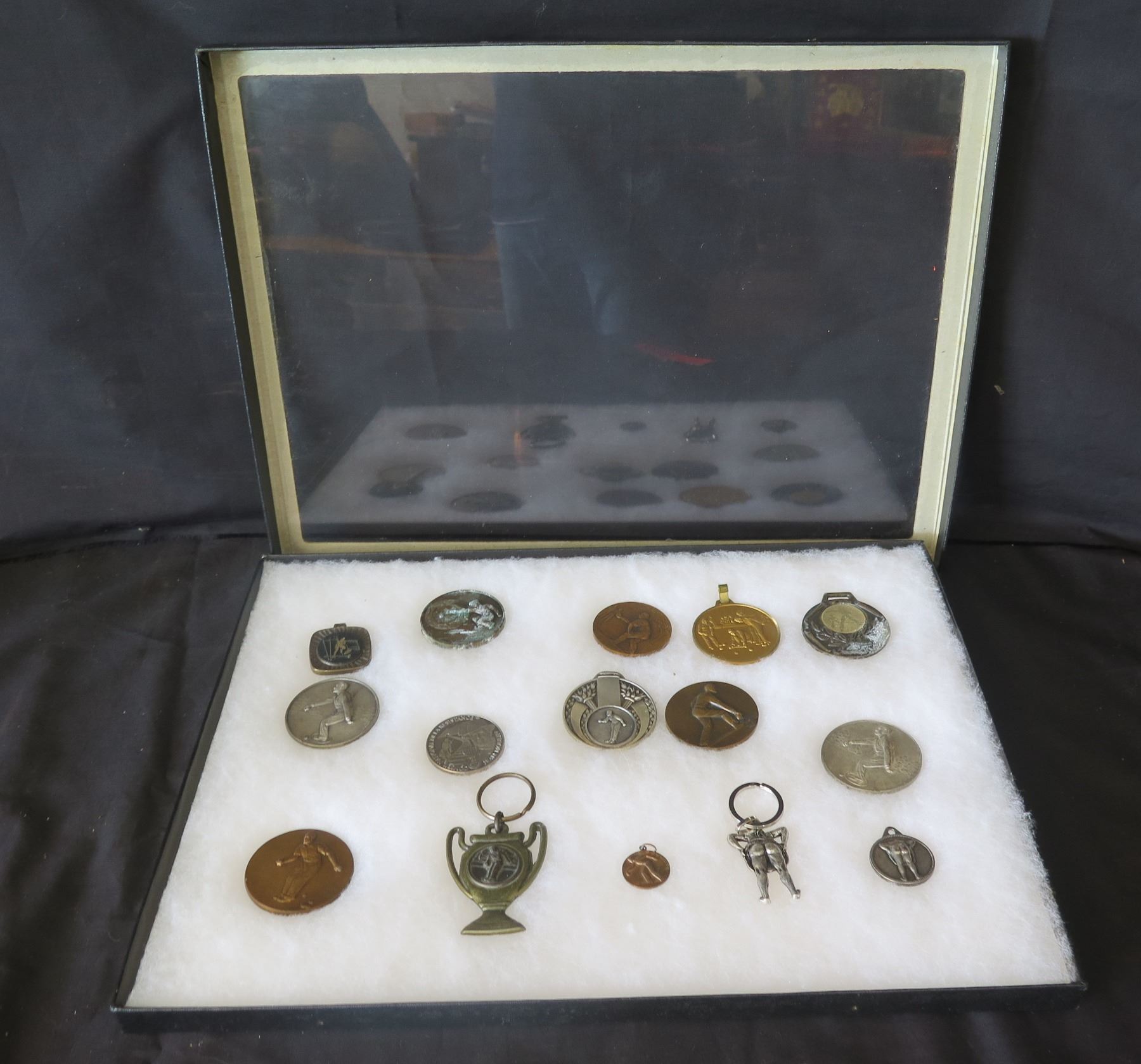 Qty Approx. 15 Medals: Olympic Torch, A.S.P.T.T. Petanque, Champion, etc in Display Case