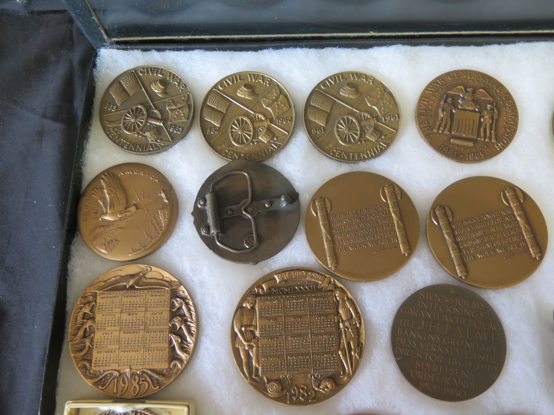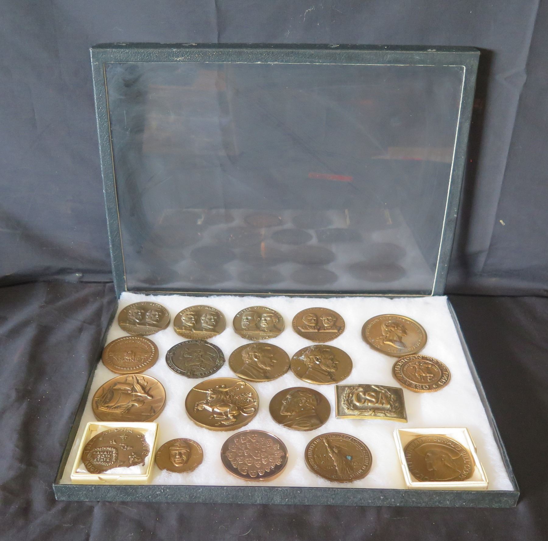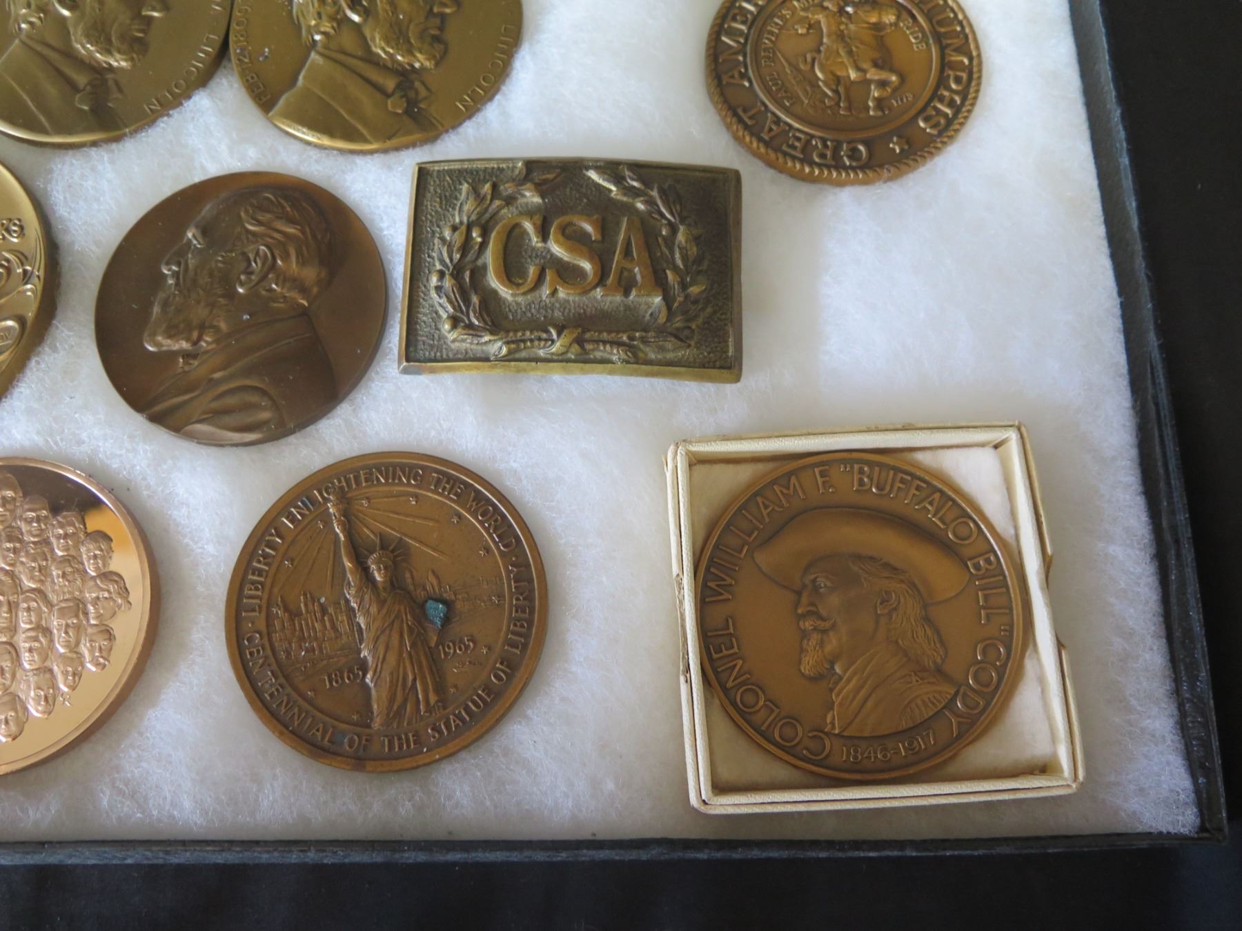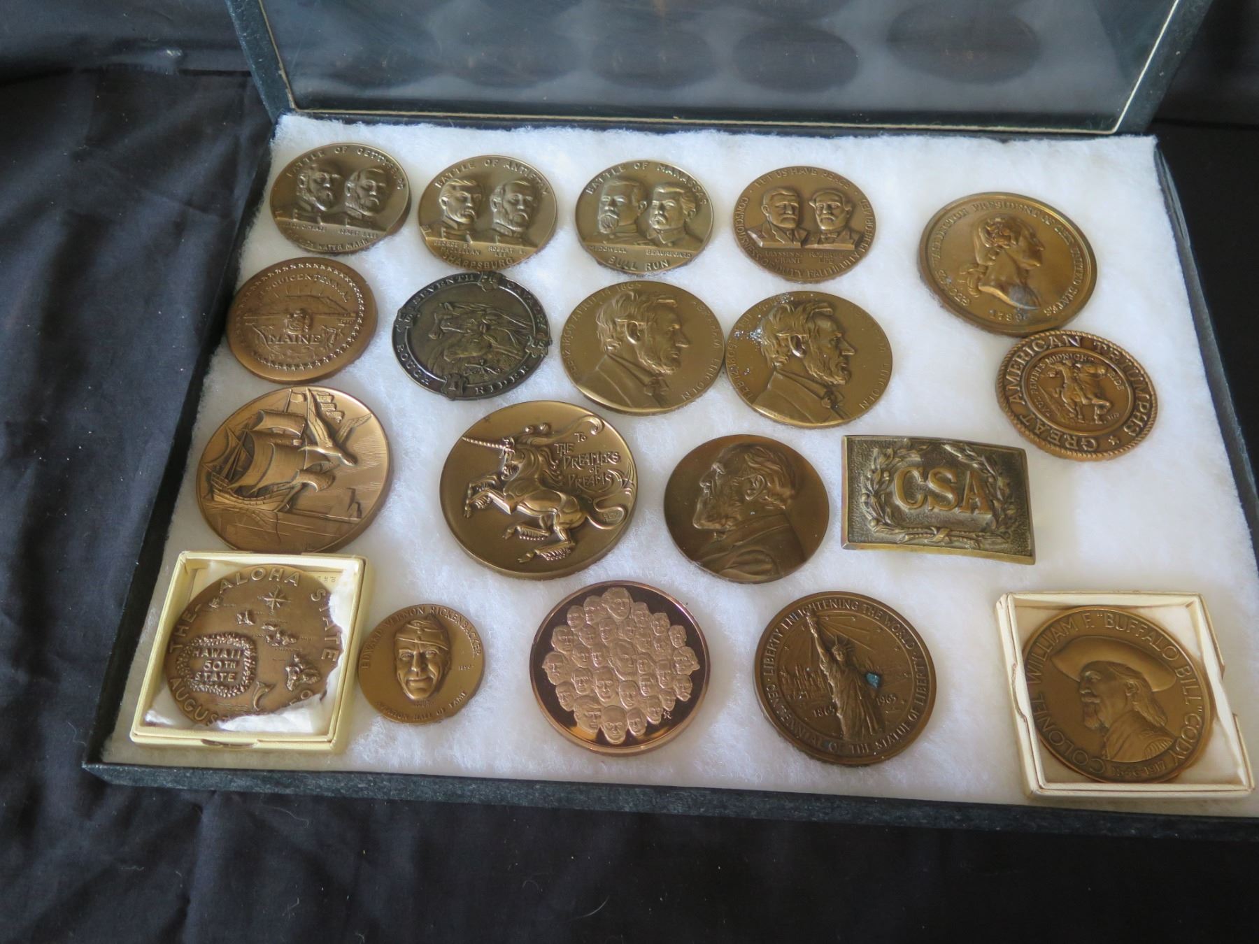 Qty Approx. 19 Medals: CSA. Unicorn, Statue of Liberty, Buffalo Bill, etc in Display Case 16"L