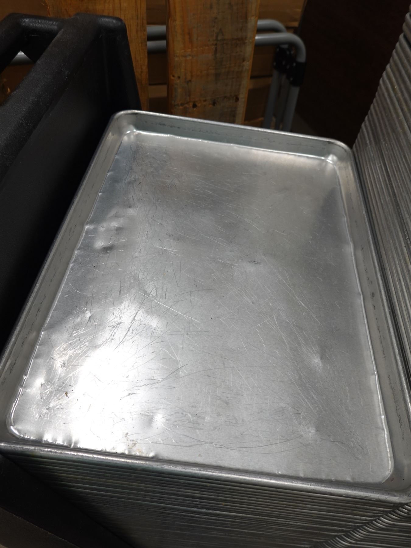 Qty Approx. 76 Vollrath 5303 Sheet Pans 18"x13" (used). Note: This item is large, heavy and may have sharp edges or grease. Removal is at buyer's risk; bring tools, equipment & help.