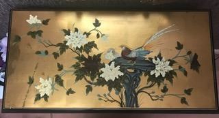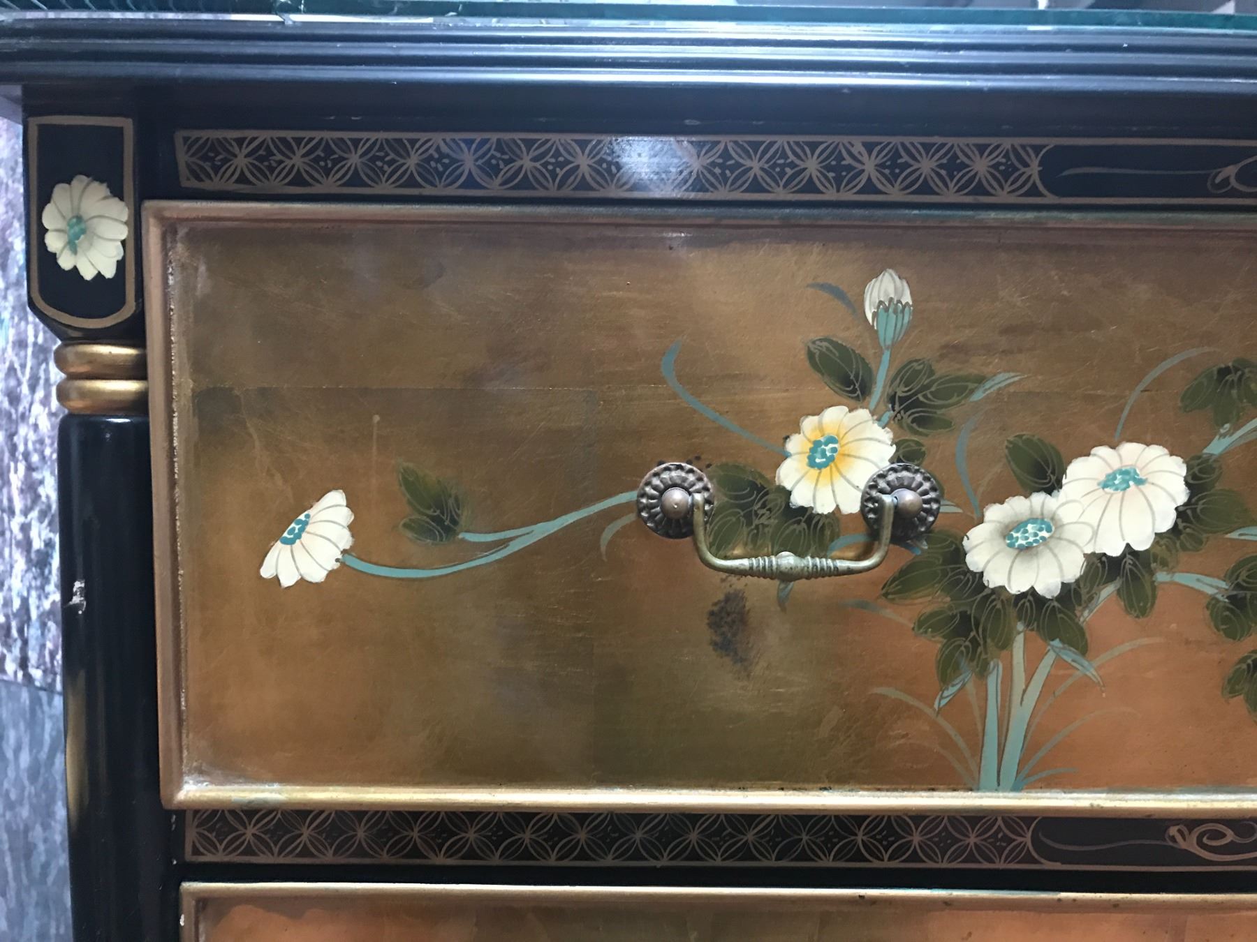 Mid Century Asian Antique black lacquer dresser covered in Genuine Gold Leaf (not the imitation gold leaf of today that tarnishes, because this gold leaf used on this dresser is too expensive to use anymore). This work of art is artistically hand-painted with beautiful scenes and is a one-of-a-kind treasure. The gold leaf in the first photo is true to golden color and glow, but because of lighting when the other photos were taken, the gold leaf does not show up in the other photos with the soft golden glow that it has in the first photo and in reality. Due to natural elements over the last 70 years, notice that the lower left corner of the top of the dresser has a dark streak running halfway up to the middle. (See the last two photos). 40'' x 20'' x 36''. (Note: Descriptions for all items in this catalog was provided by Dianne Lassen). Oahu Auctions has not done any research on these items and makes no claims as to the accuracy of titles and descriptions provided by the seller. It is strongly suggested that bidders do their own research.