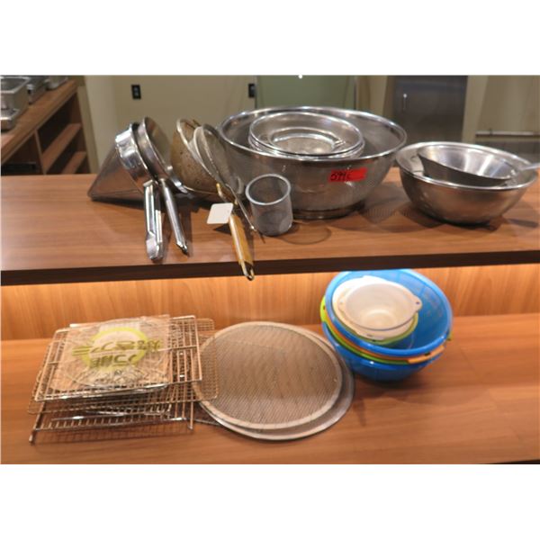 Multiple Metal & Plastic Mixing Bowls, Strainers, Racks, etc