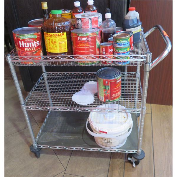 Rolling Metal Cart & Contents: Tomato Paste, etc