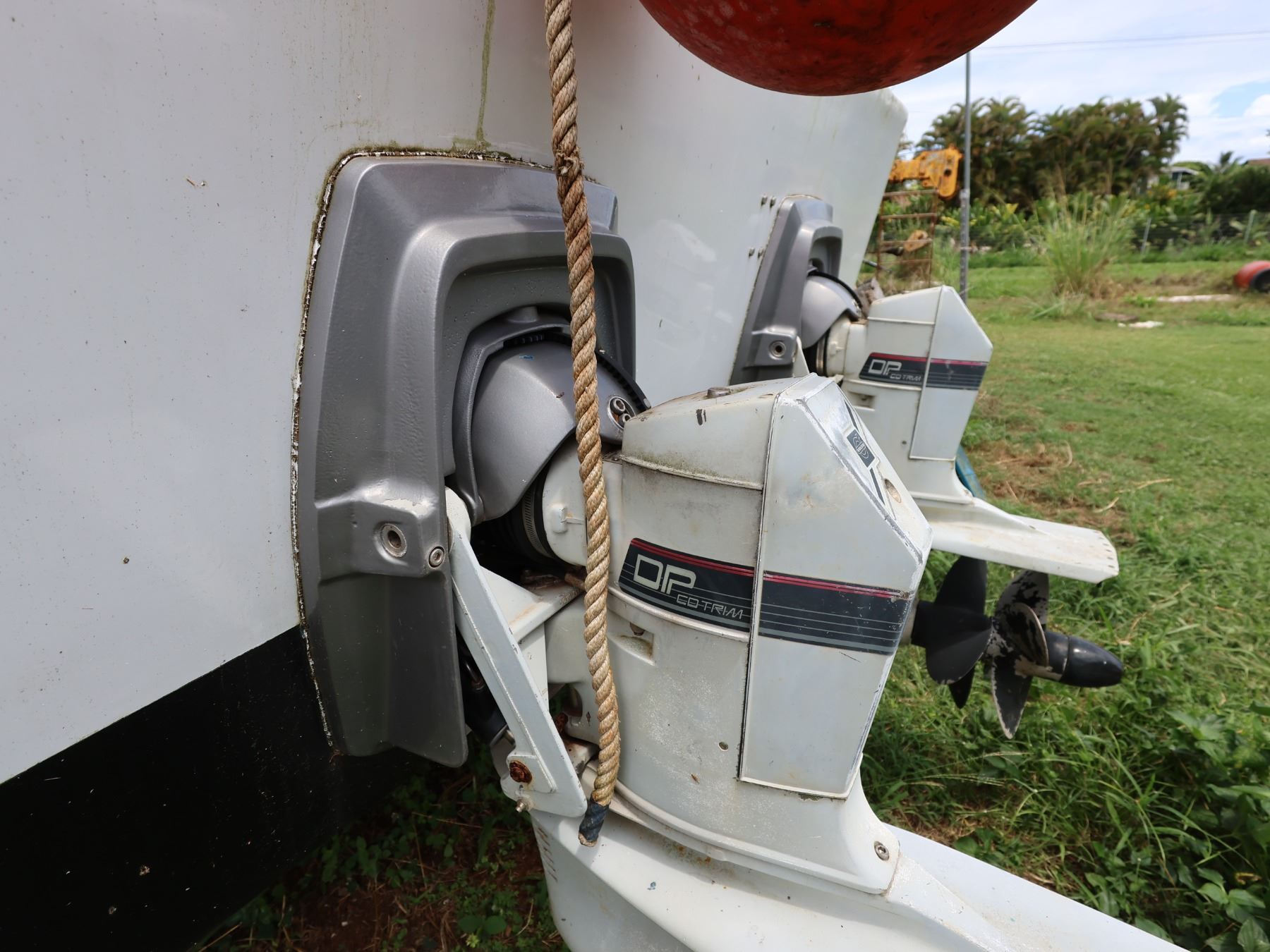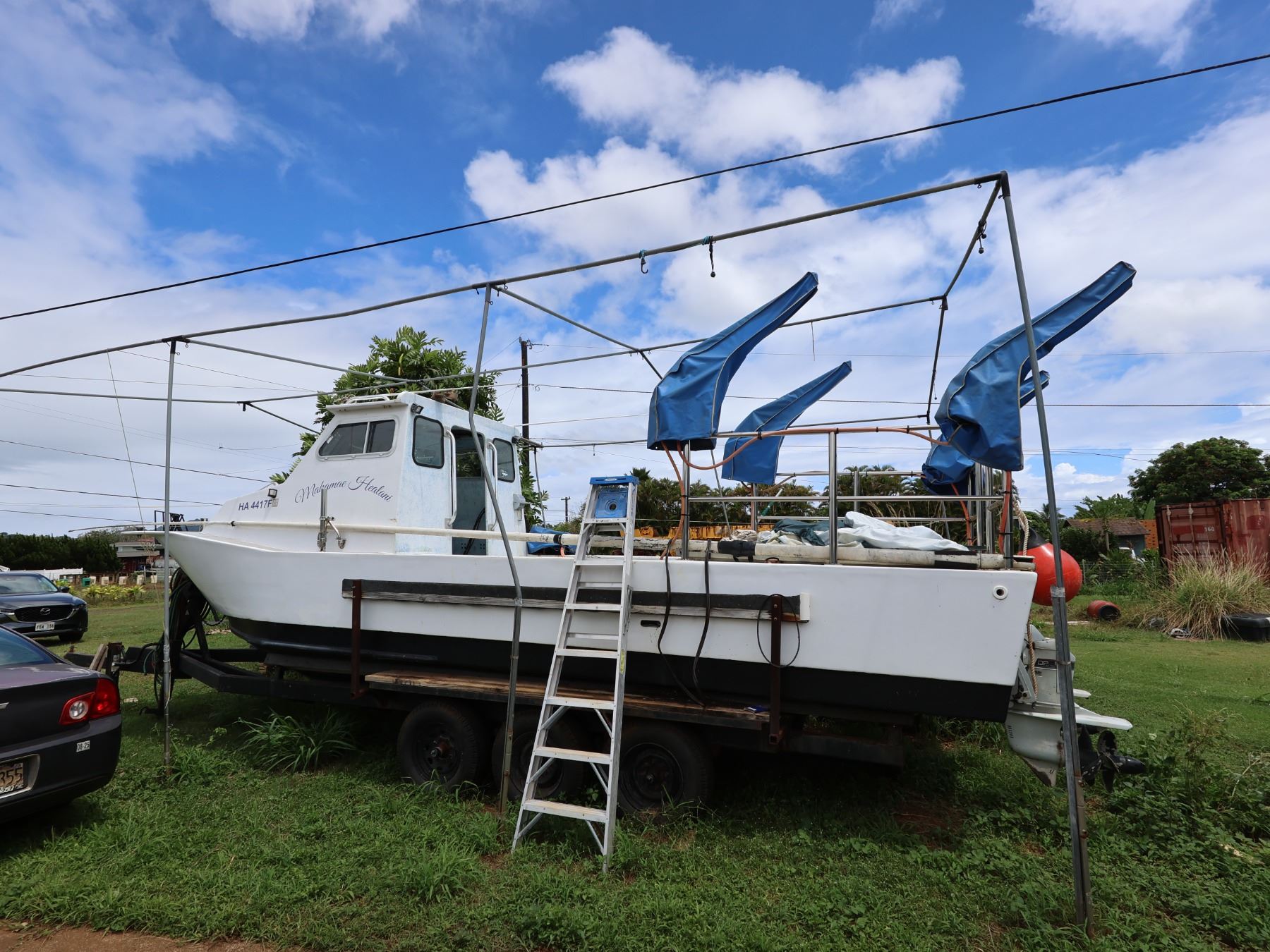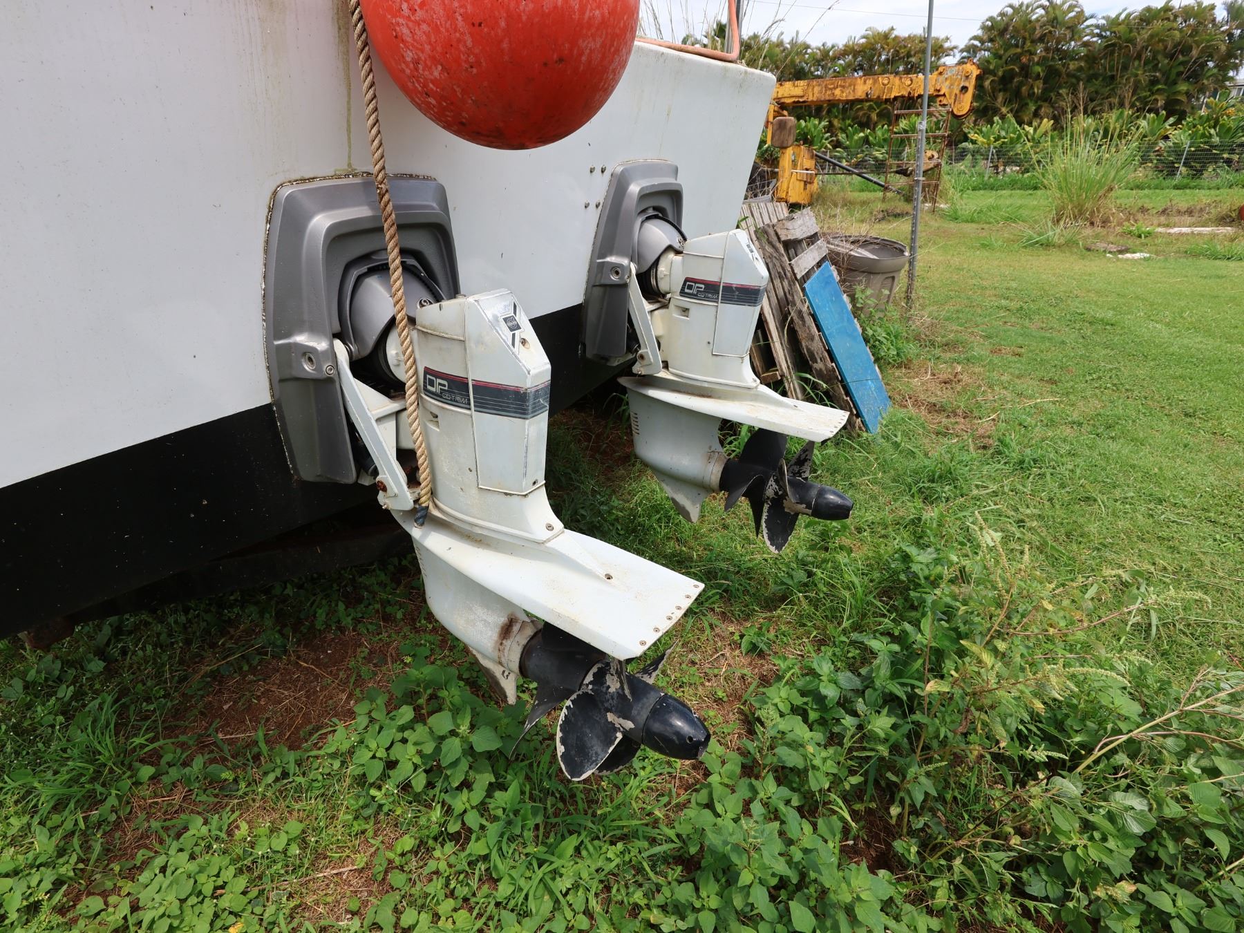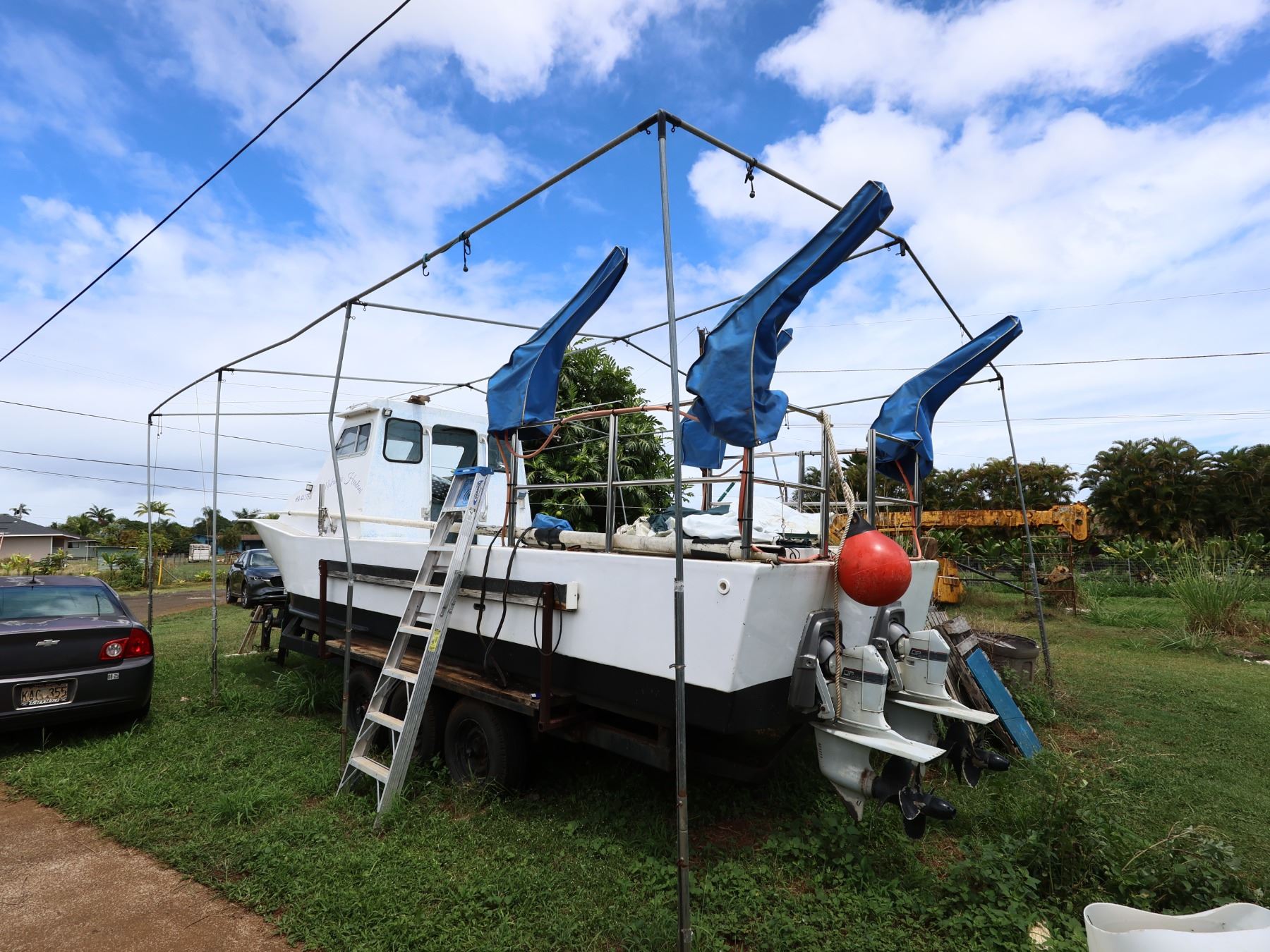 Radon 32-Foot Boat with twin inboard 6-cylinder Volvo Penta motor with 290DP legs, four hydraulic reels, one pinch puller, 1KW transducer with a 585 screen, GPS, 250-gallon aluminum fuel tank. Includes a triple axle homemade trailer.