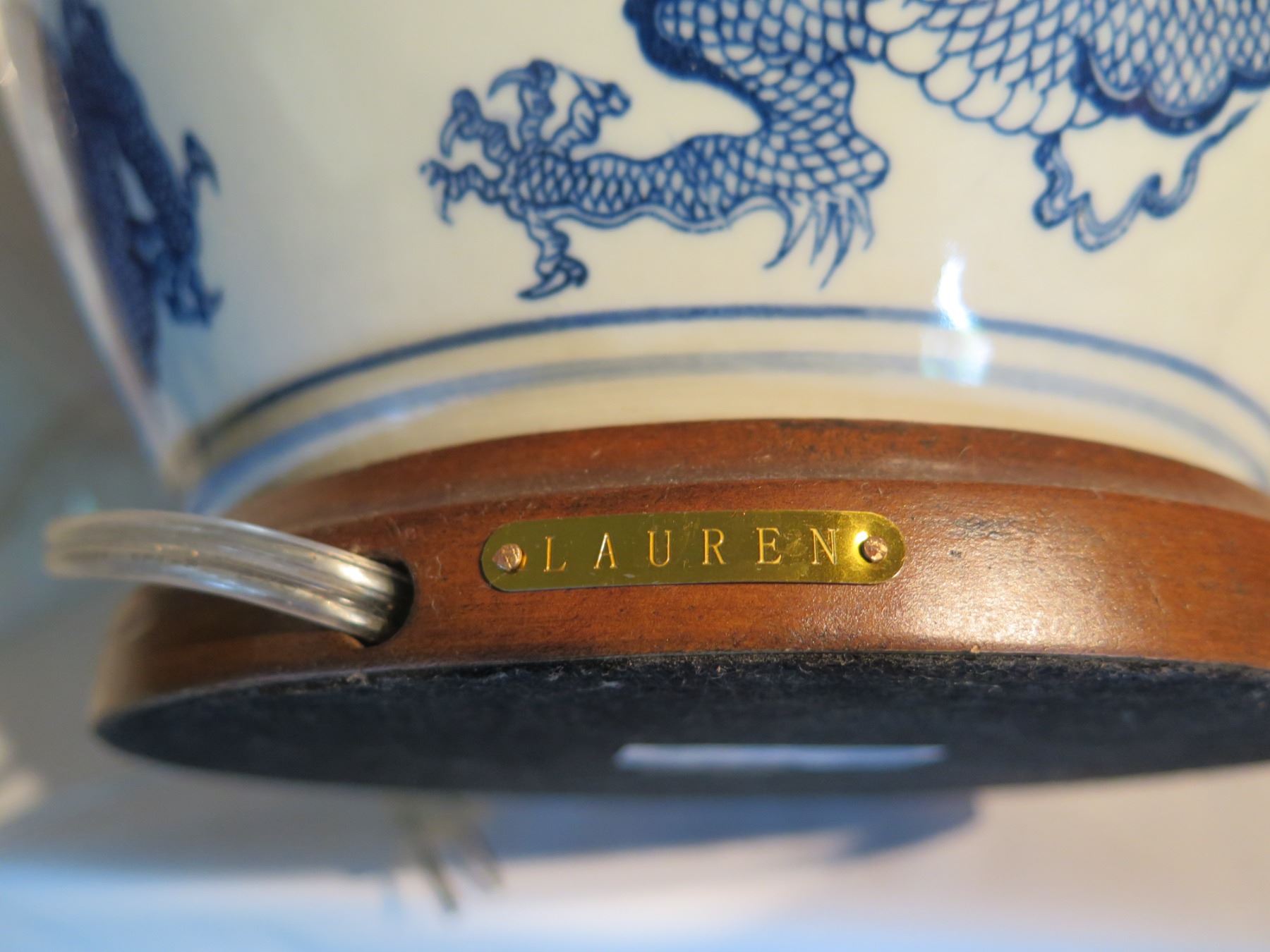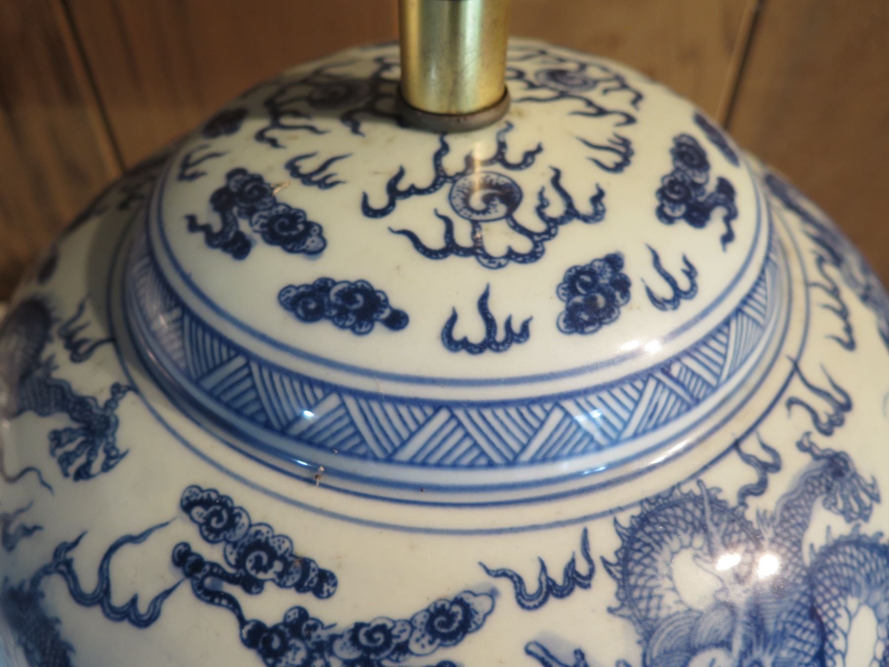 Ralph Lauren Chinese Ginger Jar Lamp on Wood Base, Blue & White Dragon Design 22.5" Tall