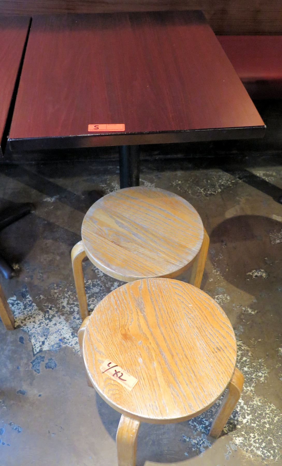 Rectangle Wood Top Pedestal Table (24x30x30H) & 2 Round Wooden Stools
