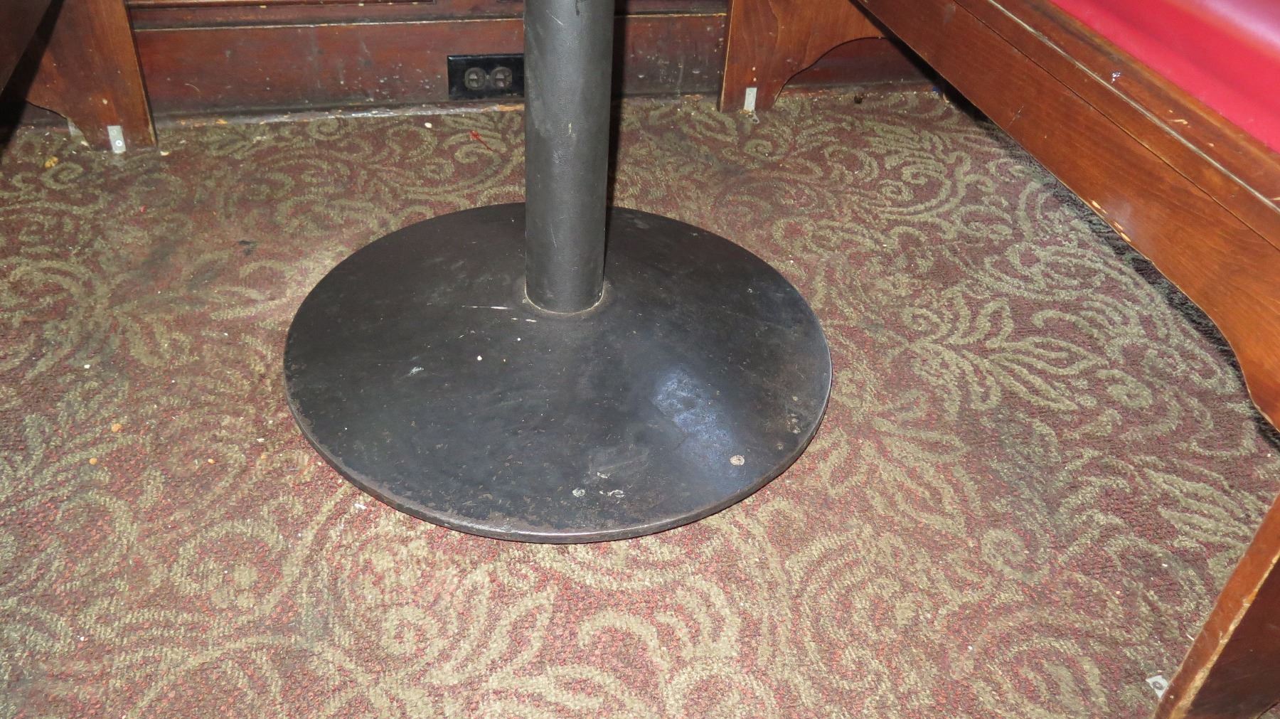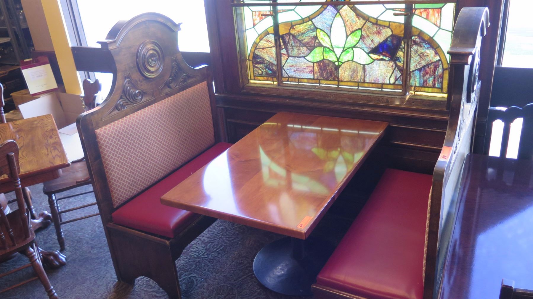 Rectangular Hardwood Table (48x30) w/Metal Base, 2 Carved Wooden Banquette Seats (45x20x58)