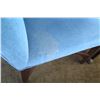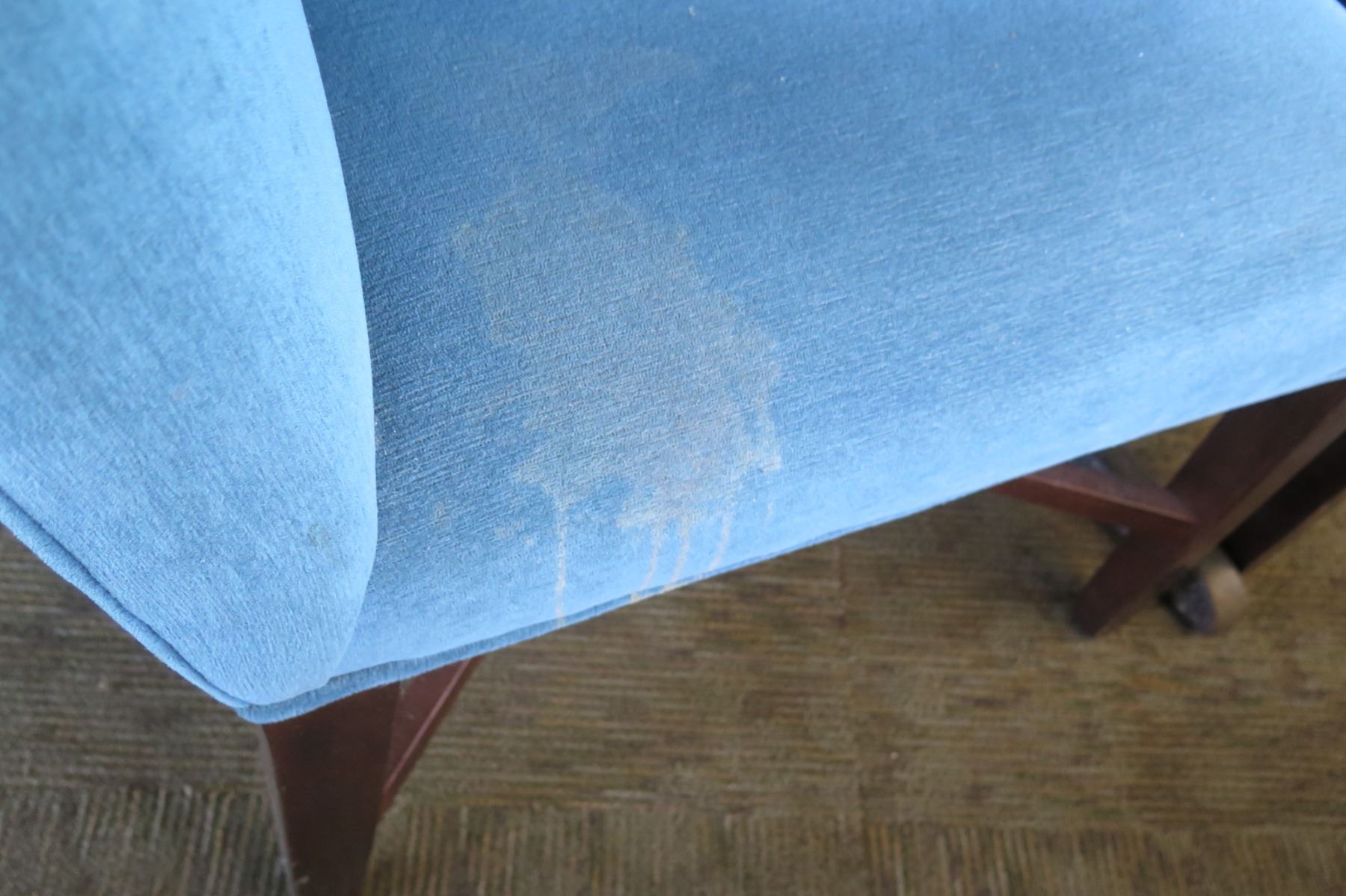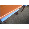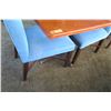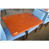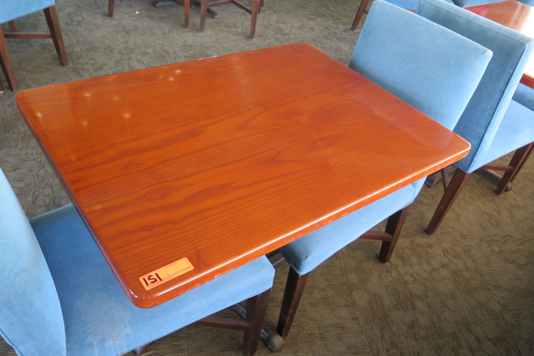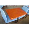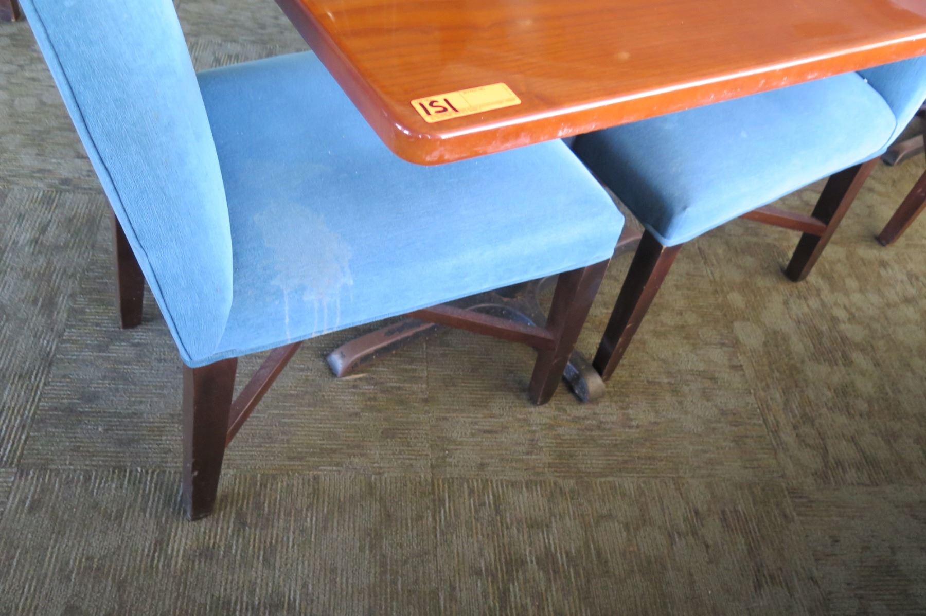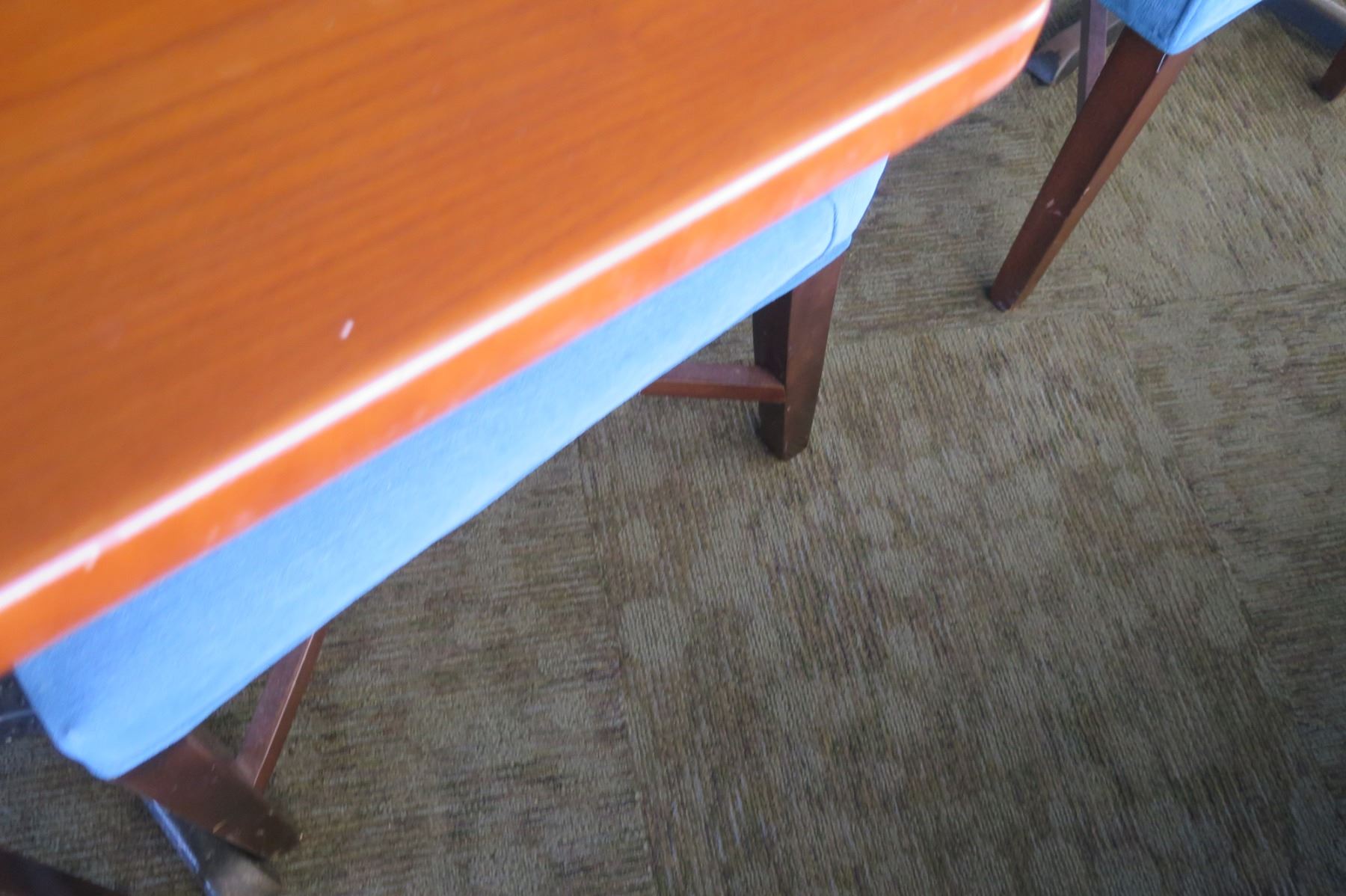 Rectangular Wooden Table w/ Metal Base (38" x 28" x 30") & 2 Upholstered Chairs. Dots in photos are reflection of lighting fixtures above.
