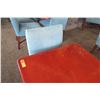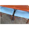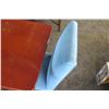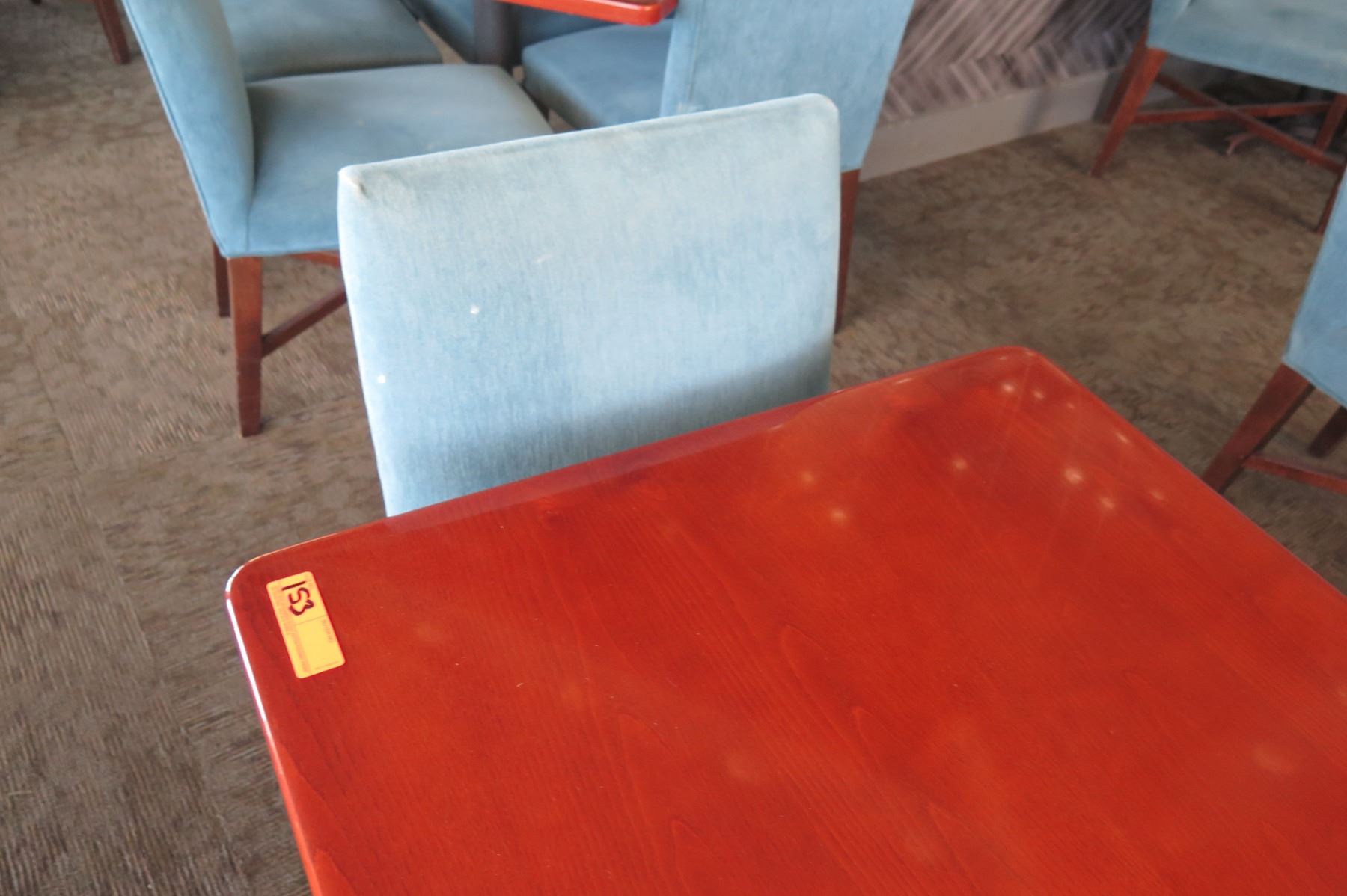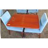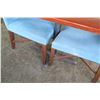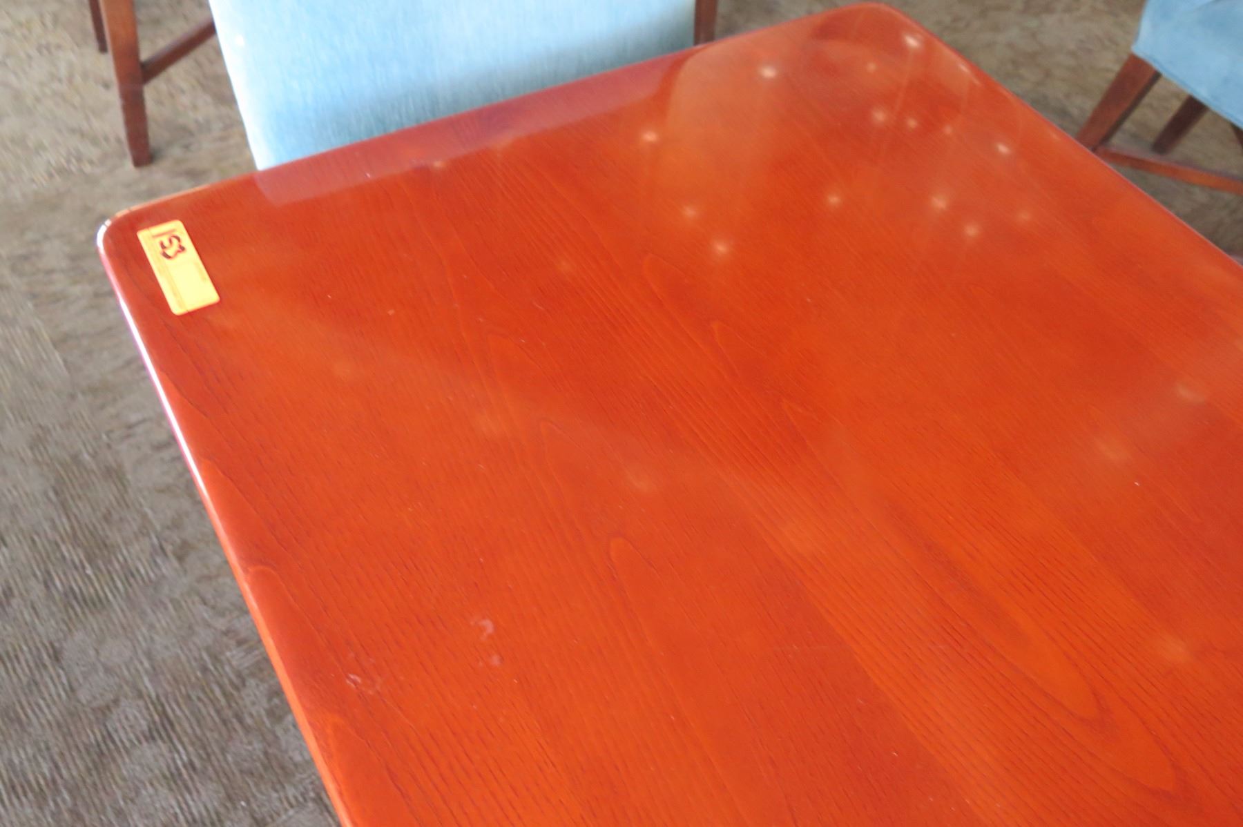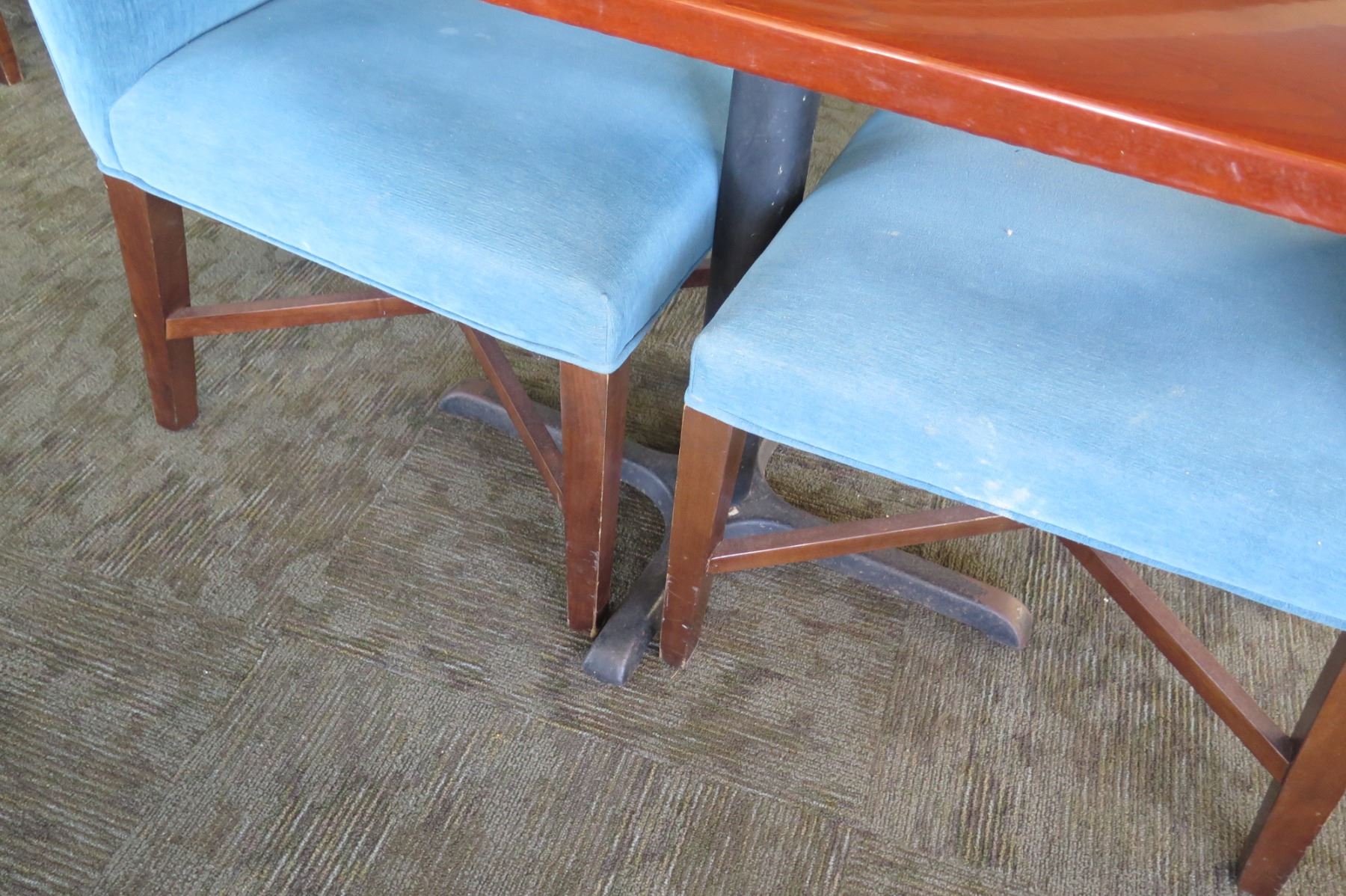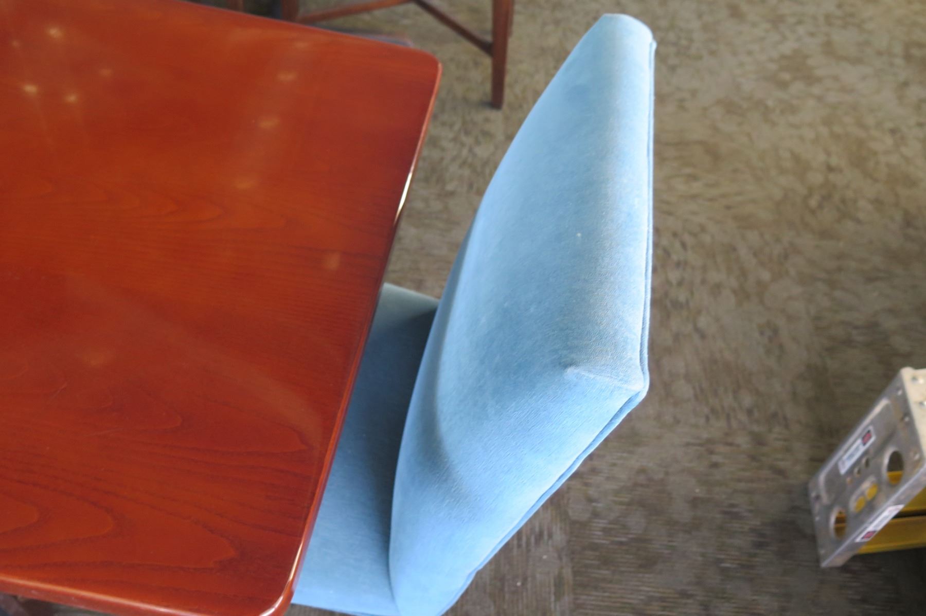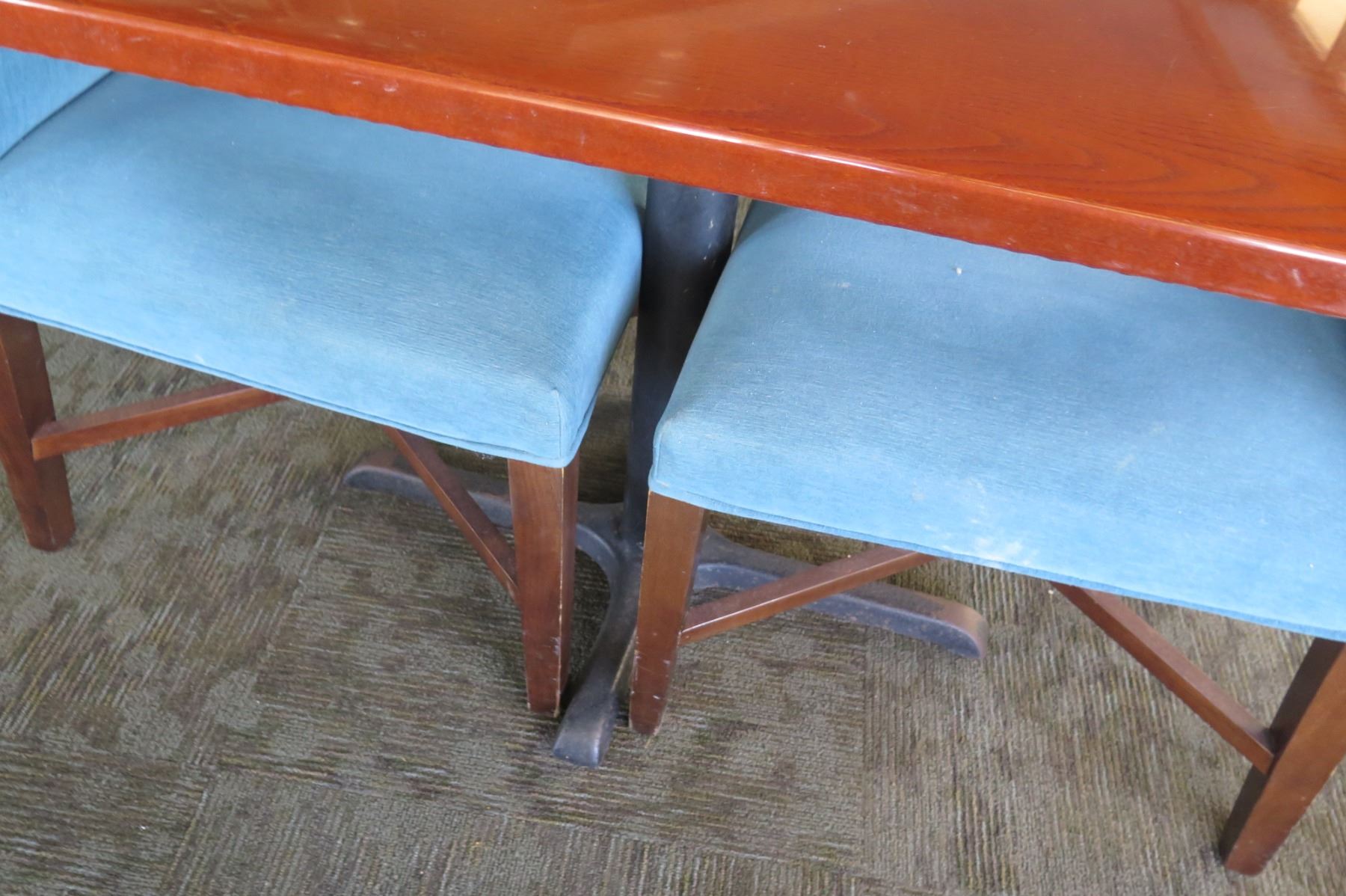 Rectangular Wooden Table w/ Metal Base (38" x 28" x 30") & 2 Upholstered Chairs. Dots in photos are reflection of lighting fixtures above.