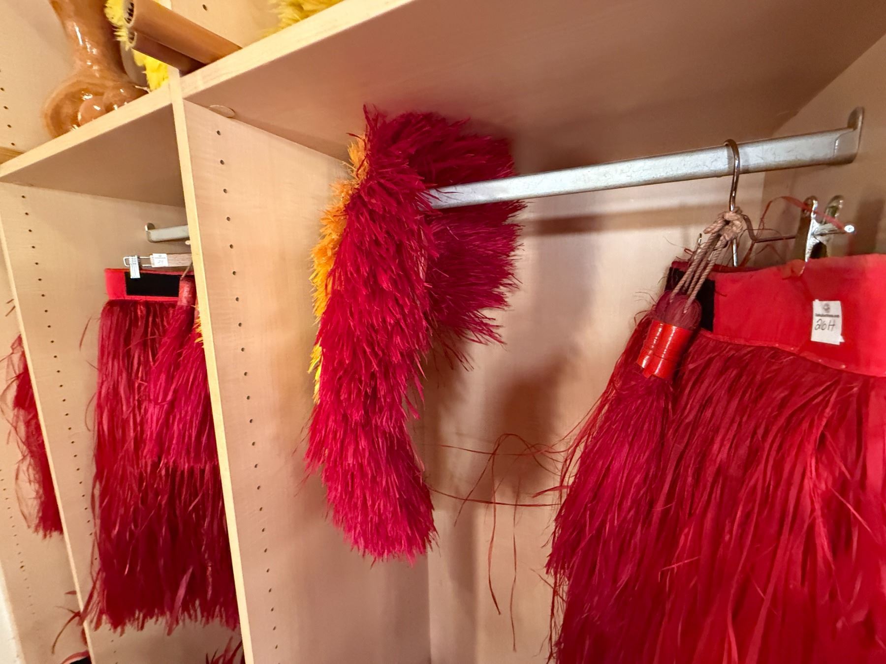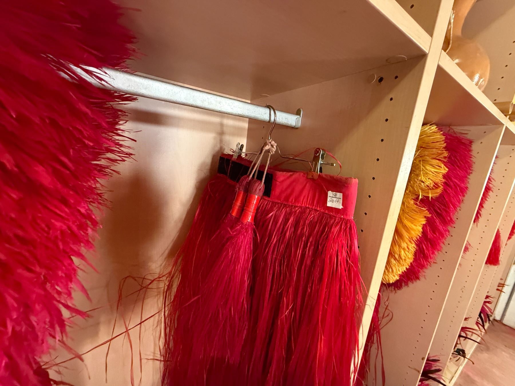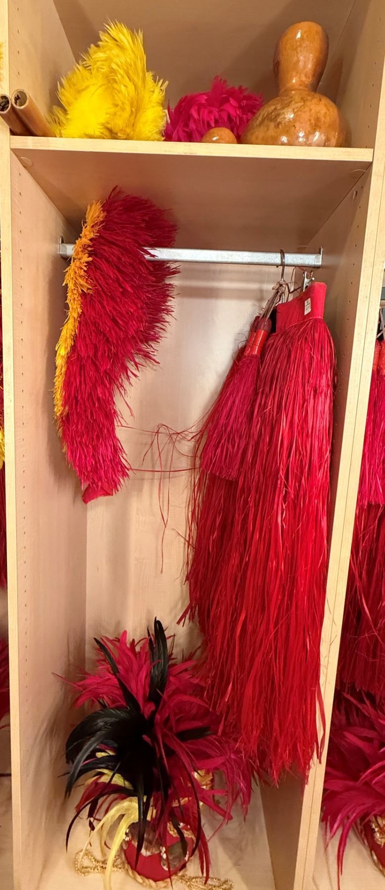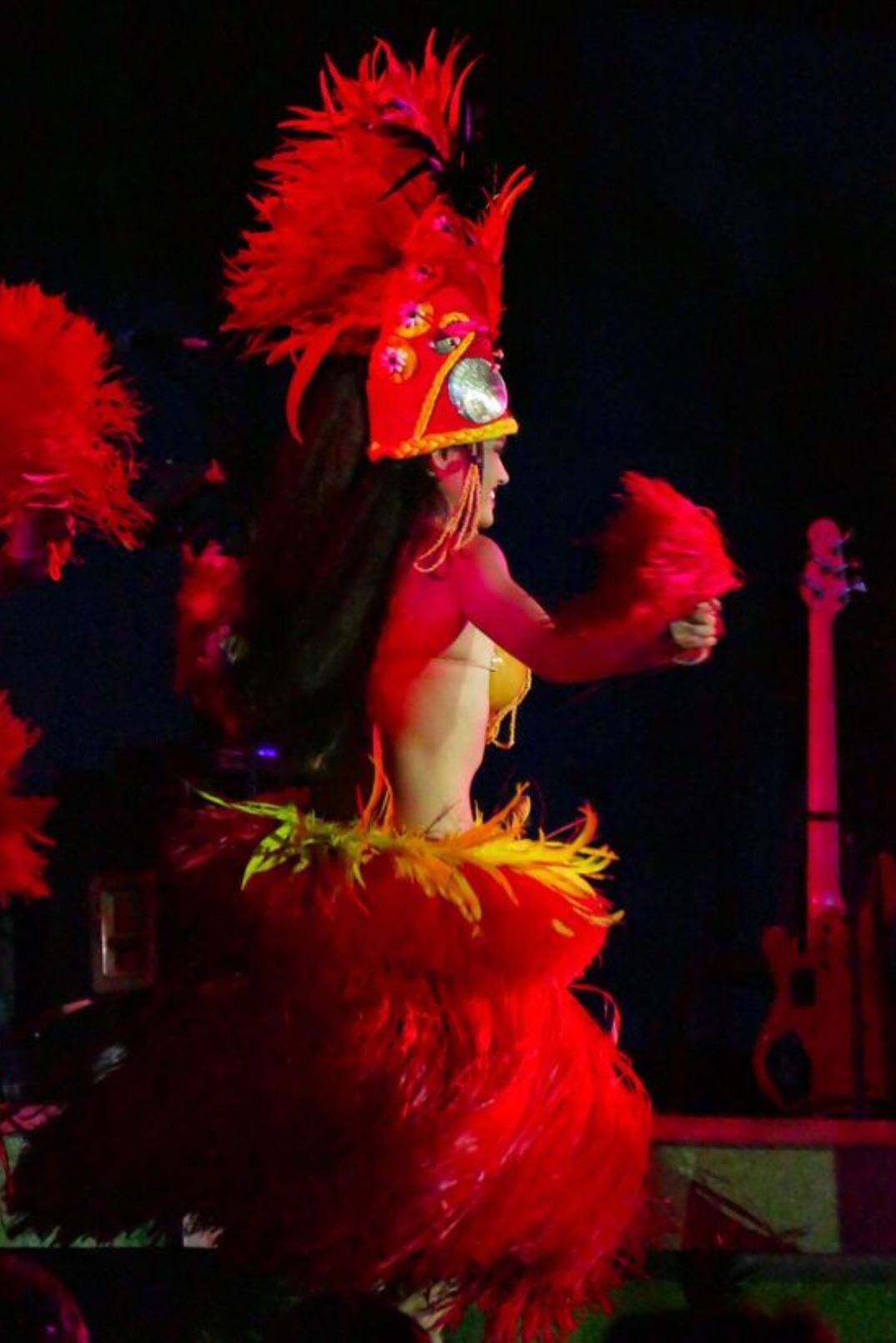 Red Artificial Fringe Dance Skirt w/ Hip Hei Band, Headdress, Uli Uli, Gourd & Tassels